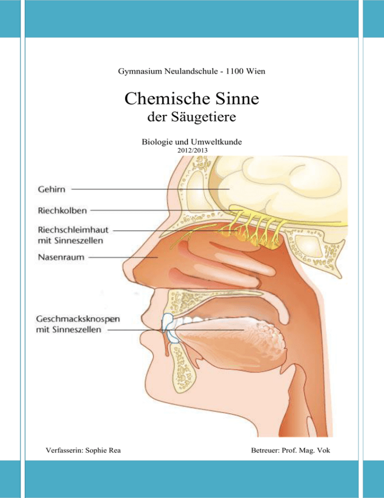 Gymnasium Neulandschule - 1100 Wien Chemische Sinne der Säugetiere Biologie und Umweltkunde 2012/2013 Verfasserin: Sophie Rea Betreuer: Prof. Mag. Vok Ich, Sophie Rea, Schülerin der Klasse 8R (2012/13) des Gymnasiums Neulandschule, erkläre hiermit, dass ich die Fachbereichsarbeit im Gegenstand Biologie und Umweltkunde eigenständig geschrieben und dazu nur die angegebene Literatur verwendet habe. 2 Inhaltsverzeichnis Vorwort ..........................................................................................................................................5 1 Grundlagen .................................................................................................... 6 1.1 Das Zustandekommen von Nervensignalen ..............................................................................7 1.2 Ionenkanäle............................................................................................................................. 10 1.2.1 Mechanisch gesteuerte Ionenkanäle ..........................................................................10 1.2.2 Ligandengesteuerte Ionenkanäle ...............................................................................10 1.2.3 Spannungsgesteuerte Ionenkanäle ............................................................................11 1.3 Das Rezeptorpotential ............................................................................................................. 11 1.4 Das Aktionspotential .............................................................................................................. 12 1.5 Triggerzone............................................................................................................................. 14 1.6 Fortleitungsgeschwindigkeit ................................................................................................... 14 1.7 Synapsen ................................................................................................................................. 15 1.7.1 Ablauf der Übertragung: ..............................................................................................16 2 Einführung .................................................................................................. 17 3 Geschmack ................................................................................................... 18 3.1 Die Grundgeschmacksrichtungen ........................................................................................... 18 3.2 Die Geschmacksorgane........................................................................................................... 19 3.3 Geschmacksrezeptorzellen ...................................................................................................... 20 3.4 Mechanismen der Geschmackstransduktion ........................................................................... 23 3.4.1 Bitterer Geschmack: .....................................................................................................23 3.4.2 Süßer Geschmack: ........................................................................................................24 3.4.3 Umami: ........................................................................................................................24 3.4.4 Salziger Geschmack: ....................................................................................................24 3.4.5 Saurer Geschmack:.......................................................................................................25 3.4.6 Scharfer Geschmack: ...................................................................................................25 3.5 Zentrale Geschmacksbahnen .................................................................................................. 26 3.6 Die neuronale Codierung des Geschmacks ............................................................................. 27 4 Geruch ......................................................................................................... 29 4.1 Menschliche Pheromone: ........................................................................................................ 29 4.2 Die Geruchsorgane ................................................................................................................. 30 4.3 Geruchsrezeptorzellen ............................................................................................................ 31 3 4.4 Geruchstransduktion ............................................................................................................... 31 4.5 Die zentralen Geruchsnervenbahnen....................................................................................... 33 4.6 Räumliche und zeitliche Abbildung der Geruchsinformation ................................................. 36 4.6.1 Der Ensemble-Code für Gerüche .................................................................................36 4.6.2 Olfaktorische Karten ....................................................................................................37 4.7 Zeitliche Codierung im Riechsystem ...................................................................................... 38 4.8 Der Hund und seine Fähigkeiten ............................................................................................. 40 4.9 Krebs ...................................................................................................................................... 43 Nachwort ...................................................................................................................................... 44 Literaturverzeichnis ...................................................................................................................... 45 Abbildungsverzeichnis ................................................................................................................. 45 Internetartikel .............................................