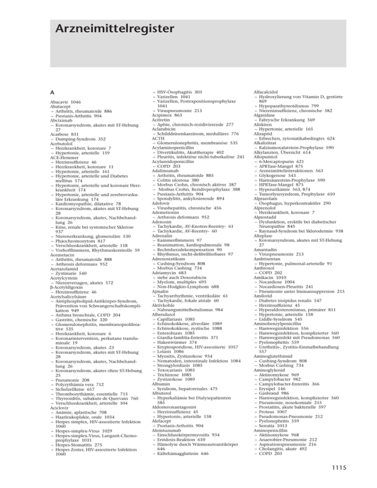 Arzneimittelregister A Abacavir 1046 Abatacept – Arthritis, rheumatoide 886 – Psoriasis-Arthritis 904 Abciximab – Koronarsyndrom, akutes mit ST-Hebung 27 Acarbose 831 – Dumping-Syndrom 352 Acebutolol – Herzkrankheit, koronare 7 – Hypertonie, arterielle 159 ACE-Hemmer – Herzinsuffizienz 46 – Herzkrankheit, koronare 11 – Hypertonie, arterielle 161 – Hypertonie, arterielle und Diabetes mellitus 174 – Hypertonie, arterielle und koronare Herzkrankheit 174 – Hypertonie, arterielle und zerebrovaskuläre Erkrankung 174 – Kardiomyopathie, dilatative 78 – Koronarsyndrom, akutes mit ST-Hebung 28 – Koronarsyndrom, akutes, Nachbehandlung 26 – Krise, renale bei systemischer Sklerose 937 – Nierenerkrankung, glomeruläre 530 – Phäochromozytom 817 – Verschlusskrankheit, arterielle 118 – Vorhofflimmern, Rhythmuskontrolle 59 Acemetacin – Arthritis, rheumatoide 888 – Arthrosis deformans 952 Acetazolamid – Zystinurie 540 Acetylcystein – Nierenversagen, akutes 572 β-Acetyldigoxin – Herzinsuffizienz 46 Acetylsalicylsäure – Antiphospholipid-Antikörper-Syndrom, Prävention von Schwangerschaftskomplikation 949 – Asthma bronchiale, COPD 204 – Gastritis, chemische 320 – Glomerulonephritis, membranoproliferative 535 – Herzkrankheit, koronare 6 – Koronarintervention, perkutane transluminale 19 – Koronarsyndrom, akutes 23 – Koronarsyndrom, akutes mit ST-Hebung 28 – Koronarsyndrom, akutes, Nachbehandlung 26 – Koronarsyndrom, akutes ohne ST-Hebung 25 – Pneumonie 208 – Polyzythämia vera 712 – Sichelzellkrise 657 – Thrombozythämie, essentielle 715 – Thyreoiditis, subakute de Quervain 760 – Verschlusskrankheit, arterielle 104 Aciclovir – Anämie, aplastische 708 – Haarleukoplakie, orale 1034 – Herpes simplex, HIV-assoziierte Infektion 1060 – Herpes-simplex-Virus 1029 – Herpes-simplex-Virus, Langzeit-Chemoprophylaxe 1031 – Herpes-Stomatitis 275 – Herpes Zoster, HIV-assoziierte Infektion 1060 – HSV-Ösophagitis 303 – Varizellen 1041 – Varizellen, Postexpositionsprophylaxe 1041 – Viruspneumonie 213 Acipimox 863 Acitretin – Aphte, chronisch-rezidivierende 277 Aclarubicin – Schilddrüsenkarzinom, medulläres 776 ACTH – Glomerulonephritis, membranöse 535 Acylaminopenicillin – Divertikulitis, Akuttherapie 402 – Pleuritis, infektiöse nicht-tuberkulöse 241 Acylureidopenicillin – COPD 203 Adalimumab – Arthritis, rheumatoide 885 – Colitis ulcerosa 380 – Morbus Crohn, chronisch aktiver 387 – Morbus Crohn, Rezidivprophylaxe 388 – Psoriasis-Arthritis 904 – Spondylitis, ankylosierende 894 Adefovir – Virushepatitis, chronische 456 Ademetionin – Arthrosis deformans 952 Adenosin – Tachykardie, AV-Knoten-Reentry- 61 – Tachykardie, AV-Reentry- 60 Adrenalin – Kammerflimmern 97 – Reanimation, kardiopulmonale 98 – Rechtsherzdekompensation 90 – Rhythmus, nicht-defibrillierbarer 97 Adrenostatikum – Cushing-Syndrom 808 – Morbus Cushing 734 Adriamycin 683 – siehe auch Doxorubicin – Myelom, multiples 695 – Non-Hodgkin-Lymphom 688 Ajmalin – Tachyarrhythmie, ventrikuläre 61 – Tachykardie, fokale atriale 60 Aktivkohle – Nahrungsmittelbotulismus 984 Albendazol – Capillariasis 1085 – Echinokokkose, alveoläre 1089 – Echinokokkose, zystische 1088 – Enterobiasis 1085 – Giardia-lamblia-Enteritis 371 – Hakenwürmer 374 – Kryptosporidiose, HIV-assoziierte 1057 – Loiasis 1086 – Myositis, Zystizerkose 934 – Nematoden, intesstinale Infektion 1084 – Strongyloidiasis 1085 – Toxocariasis 1085 – Trichinose 1085 – Zystizerkose 1089 Albumin – Syndrom, hepatorenales 475 Albuterol – Hyperkaliämie bei Dialysepatienten 585 Aldosteronantagonist – Herzinsuffizienz 45 – Hypertonie, arterielle 158 Alefacept – Psoriasis-Arthritis 904 Alemtuzumab – Einschlusskörpermyositis 934 – Erstdosis-Reaktion 610 – Hämolyse durch Wärmeautoantikörper 646 – Kältehämagglutinin 646 Alfacalcidol – Hydroxylierung von Vitamin D, gestörte 869 – Hypoparathyreoidismus 799 – Niereninsuffizienz, chronische 582 Algasidase – Fabrysche Erkrankung 569 Aliskiren – Hypertonie, arterielle 165 Alizaprid – Erbrechen, zytostatikabedingtes 624 Alkalizitrat – Kalziumoxalatstein-Prophylaxe 590 Alkylanzien, Übersicht 614 Allopurinol – 6-Mercaptopurin 621 – APRTase-Mangel 875 – Arzneimittelinteraktionen 563 – Glykogenose 543 – Harnsäurestein-Prophylaxe 590 – HPRTase-Mangel 875 – Hyperurikämie 563, 874 – Tumorlysesyndrom, Prophylaxe 610 Alprazolam – Ösophagus, hyperkontraktiler 290 Alprenolol – Herzkrankheit, koronare 7 Alprostadil – Dysfunktion, erektile bei diabetischer Neuropathie 845 – Raynaud-Syndrom bei Sklerodermie 938 Alteplase – Koronarsyndrom, akutes mit ST-Hebung 27 Amantadin – Viruspneumonie 213 Ambrisentan – Hypertonie, pulmonal-arterielle 91 Ambroxol – COPD 202 Amikacin 1010 – Nocardiose 1004 – Nocardiosen-Pleuritis 241 – Pneumonie unter Immunsuppresion 215 Amilorid – Diabetes insipidus renalis 547 – Herzinsuffizienz 45 – Hyperaldosteronismus, primärer 811 – Hypertonie, arterielle 158 – Liddle-Syndrom 545 Aminobenzylpenicillin – Harnwegsinfektion 556 – Harnwegsinfektion, komplizierter 560 – Harnwegsinfekt mit Pseudomonas 560 – Pyelonephritis 559 – Urethritis-, Zystitis-Einmalbehandlung 557 Aminoglutethimid – Cushing-Syndrom 808 – Morbus Cushing 734 Aminoglykosid – Aktinomykose 969 – Campylobacter 982 – Campylobacter-Enteritis 366 – Erysipel 146 – Gasbrand 986 – Harnwegsinfektion, komplizierter 560 – Pneumonie, nosokomiale 215 – Prostatitis, akute bakterielle 597 – Proteus 1007 – Pseudomonas-Pneumonie 212 – Pyelonephritis 559 – Serratia 1013 Aminopenicillin – Aktinomykose 968 – Anaerobier-Pneumonie 212 – Aspirationspneumonie 216 – Cholangitis, akute 492 – COPD 203 1115 Arzneimittelregister – Harnwegsinfektion 556 – Lungenabszess 219 – Pneumonie 210 – Pneumonie, nos