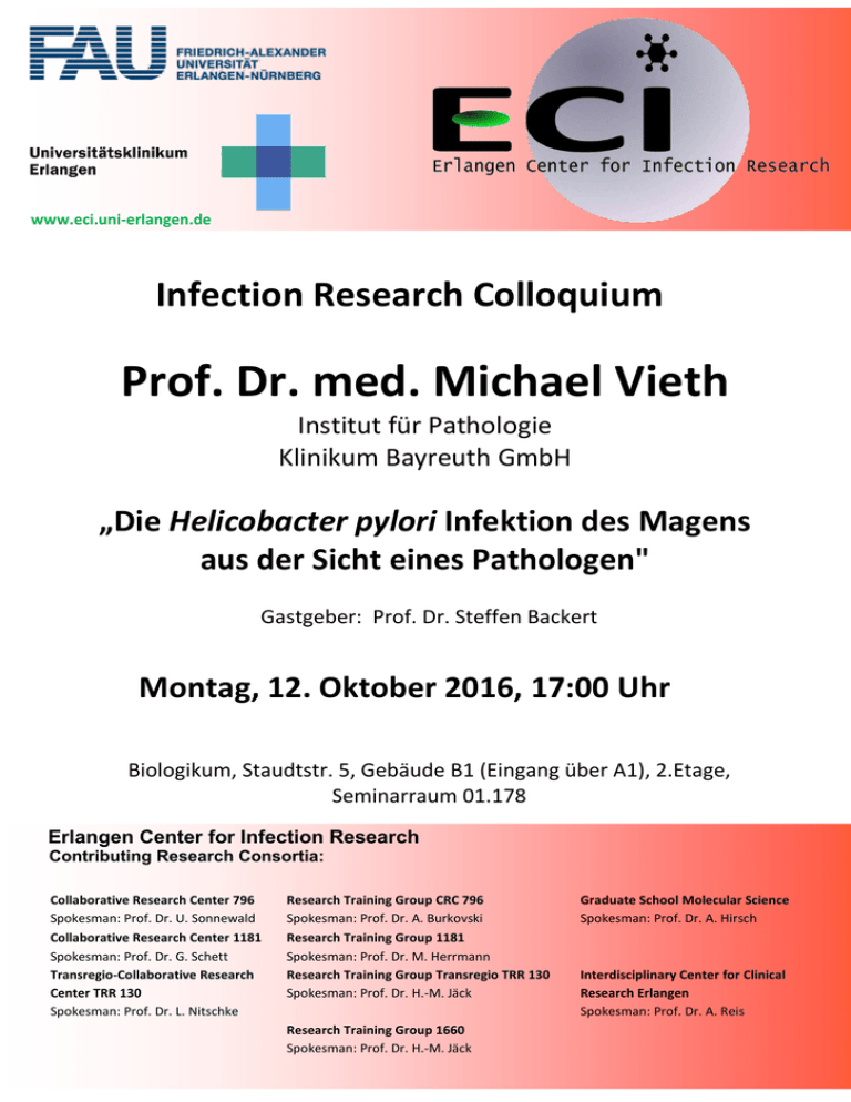 www.eci.uni-erlangen.de Infection Research Colloquium Prof. Dr. med. Michael Vieth Institut für Pathologie Klinikum Bayreuth GmbH „Die Helicobacter pylori Infektion des Magens aus der Sicht eines Pathologen" Gastgeber: Prof. Dr. Steffen Backert Montag, 12. Oktober 2016, 17:00 Uhr Biologikum, Staudtstr. 5, Gebäude B1 (Eingang über A1), 2.Etage, Seminarraum 01.178 Erlangen Center for Infection Research Contributing Research Consortia: Collaborative Research Center 796 Spokesman: Prof. Dr. U. Sonnewald Research Training Group CRC 796 Spokesman: Prof. Dr. A. Burkovski Collaborative Research Center 1181 Spokesman: Prof. Dr. G. Schett Transregio-Collaborative Research Center TRR 130 Spokesman: Prof. Dr. L. Nitschke Research Training Group 1181 Spokesman: Prof. Dr. M. Herrmann Research Training Group Transregio TRR 130 Spokesman: Prof. Dr. H.-M. Jäck Research Training Group 1660 Spokesman: Prof. Dr. H.-M. Jäck Graduate School Molecular Science Spokesman: Prof. Dr. A. Hirsch Interdisciplinary Center for Clinical Research Erlangen Spokesman: Prof. Dr. A. Reis