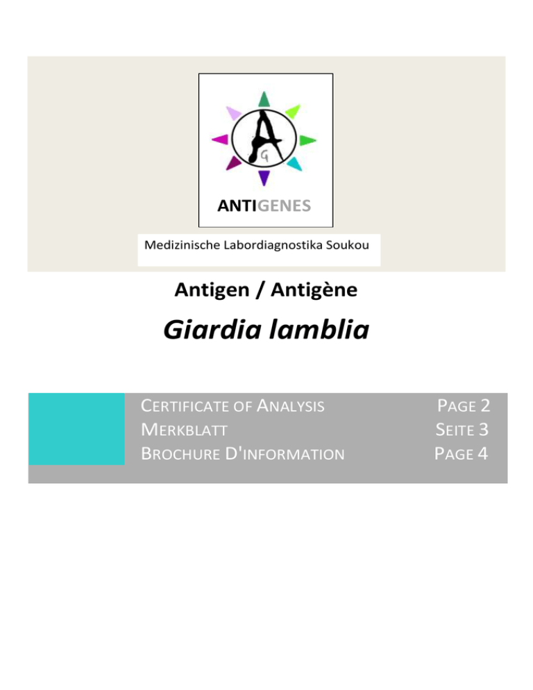 ANTIGENES Medizinische Labordiagnostika Soukou Antigen / Antigène Giardia lamblia CERTIFICATE OF ANALYSIS MERKBLATT BROCHURE D'INFORMATION PAGE 2 SEITE 3 PAGE 4 ANTIGENES Certificate of Analysis Medizinische Labordiagnostika Soukou Hustadtring 151 44801 Bochum Germany (Please read carefully) Tel.: +49 234-91795580 Fax: +49 234-91795581 Email: [email protected] Homepage: www.antigenes.de Giardia lamblia (antigen) Article no.: AEP2100 Lot no.: Size: 1 mg Source American Type Culture Collection (ATCC) Raw materials Trophozoites Color white Texture powdery Additives no Condition of delivery Lyophilisate Date of manufacture January 2014 Date of expire January 2025 (frozen) Risk of infection: The antigen belongs to biohazards group 2. This product should be handled with care. No responsibility on the part of the manufacturer for any infection or contamination. Thermal inactivation. Application (only for in vitro diagnostics): This product is only for Research and Development. It must not be used as a remedy and not as an in vivo application. Foam or bubble development should be avoided. Any unused stock solution must then be divided into aliquots and frozen at -20°C. Repeated freezing and thawing is not recommended because of significant reduced antigen activity. Protein content: Determined for each new batch by using the Bradford assay. Molecular binding sites: Examined and documented by SDS-PAGE and Experion (BioRad). Storage: Keep container tightly closed and store at temperatures of at least -20°C. Bochum, 19.01.2016 verified by quality manager ______________ (signature) © ANTIGENES 2016 all rights reserved – www.antigenes.de – Ver. 01/2016 -- Page 2 ANTIGENES Merkblatt Medizinische Labordiagnostika Soukou Hustadtring 151 44801 Bochum (Bitte sorgfältig lesen) Tel.: +49 234-91795580 Fax: +49 234-91795581 Email: [email protected] Homepage: www.antigenes.de Giardia lamblia (Antigen) Artikel-Nr.: AEP2100 Charge: Menge: 1 mg Bezugsquelle American Type Culture Collection (ATCC) Ausgangsstoffe Trophozoiten Farbe weiß Konsistenz pulvrig Zusatzstoffe keine Zustand bei Lieferung Lyophilisat Herstellungsdatum Januar 2014 Verfallsdatum Januar 2025 (tiefgekühlt) Infektionsgefahr: Das Antigen gehört zur biologischen Arbeitsstoff Risikogruppe 2. Das Produkt ist mit Sorgfalt zu behandeln. Eine Verantwortung von Seiten des Herstellers für etwaige Infektion bzw. Kontamination ist ausgeschlossen. Thermische Inaktivierung. Anwendung (nur für in vitro Diagnostik): Das Produkt dient der Forschung und Entwicklung. Es ist nicht als Heilmittel und nicht als in vivo Anwendung geeignet. Schaum- oder Luftblasenentwicklung sollte möglichst vermieden werden. Nicht verbrauchte Stammlösung muss anschließend aliquotiert und bei -20°C eingefroren werden. Vor mehrfachem Einfrieren und Auftauen ist abzuraten, da dies die Antigenaktivität deutlich vermindert. Proteingehalt: Wird unter Verwendung des Bradford Assays bestimmt. Molekulare Bindungsstellen: Werden mittels SDS-PAGE und Experion (BioRad) überprüft. Lagerung: Behälter dicht verschlossen halten und bei einer Temperatur von mindestens -20°C aufbewahren. Bochum, den 19.01.2016 geprüft vom Qualitätsmanager ______________ (Unterschrift) © ANTIGENES 2016 all rights reserved – www.antigenes.de – Ver. 01/2016 -- Seite 3 ANTIGENES Brochure d'information Medizinische Labordiagnostika Soukou Hustadtring 151 44801 Bochum Allemagne (À lire avec attention) Tel.: +49 234-91795580 Fax: +49 234-91795581 Email: [email protected] Homepage: www.antigenes.de Giardia lamblia (antigène) N° réf.: AEP2100 N° de lot: Quantité: 1 mg Origin American Type Culture Collection (ATCC) Matériel d‘origin formes trophozoïtes Coleur blanche Consistance poudreux Additifs no Ètat de la livraison fraction lyophilisée Date de production Janvier 2014 Date d’expiration Janvier 2025 (de congelé) Risque d'infection: L'antigène correspond au groupe 2 des risques biologiques. Le produit doit être manipulé avec soin. Toute responsabilité de la part du fabricant pour toute infection ou de contamination est exclue. L'inactivation thermique. Application (uniquement pour le diagnostic in vitro): Le produit sert à la recherche et au développement et non dans un procédé in vivo pour un traitement thérapeutique de l'organisme humain ou animal. Le développement de bulles ou de mousse doit être évité pendant la manipulation. L´antigène non utilisé doit ensuite être portionné puis congelé à -20°C. Evitez toute congélation ou décongélation répétée; ceci peut conduire à la réduction signifiante de l'activité de l'antigène. Teneur en protéine: Déterminée par la méthode de Bradford. Sites de liaison moléculaires: Examiné et documenté par SDS-PAGE et Experion (BioRad). Stockage: Gardez le flacon hermétiquement fermé et conservez-le á une température inférieure á 20°C. Bochum, le 19.janvier 2016 vérifié par le responsable de qualité ______________ (signature) © ANTIGENES 2016 all rights reserved – www.antigenes.de – Ver. 01/2016 -- Page 4