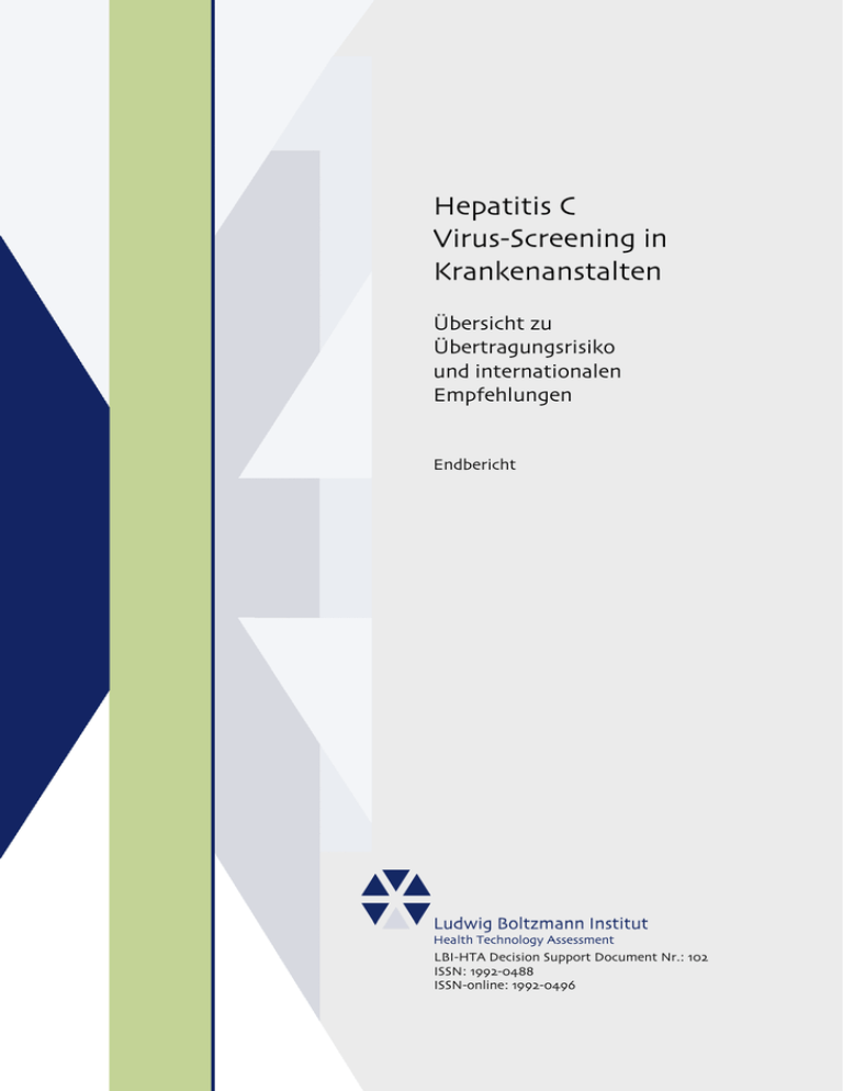 Hepatitis C Virus-Screening in Krankenanstalten Übersicht zu Übertragungsrisiko und internationalen Empfehlungen Endbericht LBI-HTA Decision Support Document Nr.: 102 ISSN: 1992-0488 ISSN-online: 1992-0496 Hepatitis C Virus-Screening in Krankenanstalten Übersicht zu Übertragungsrisiko und internationalen Empfehlungen Endbericht Wien, September 2016 Projektteam Projektleitung: Dr. Brigitte Piso Projektbearbeitung: Dr. Agnes Kisser Projektbeteiligung Systematische Literatursuche: Tarquin Mittermayer, BA Externe Begutachtung: OA. Dr. Michael Strasser, Leberambulanz, Universitätsklinik für Innere Medizin I der PMU Salzburg Interne Begutachtung: Dr. Brigitte Piso Korrespondenz: Dr. Agnes Kisser, [email protected] Dieser Bericht soll folgendermaßen zitiert werden/This report should be referenced as follows: Kisser A. Hepatitis C Virus-Screening in Krankenanstalten. LBI-HTA Decision Support Document Nr.: 102; 2016. Wien: Ludwig Boltzmann Institut für Health Technology Assessment. Interessenskonflikt Alle beteiligten AutorInnen erklären, dass keine Interessenskonflikte im Sinne der Uniform Requirements of Manuscripts Statement of Medical Journal Editors (www.icmje.org) bestehen. IMPRESSUM Medieninhaber und Herausgeber: Ludwig Boltzmann Gesellschaft GmbH Nußdorferstr. 64, 6 Stock, A-1090 Wien http://www.lbg.ac.at/de/themen/impressum Für den Inhalt verantwortlich: Ludwig Boltzmann Institut für Health Technology Assessment (LBI-HTA) Garnisongasse 7/20, A-1090 Wien http://hta.lbg.ac.at/ Die HTA-Projektberichte erscheinen unregelmäßig und dienen der Veröffentlichung der Forschungsergebnisse des Ludwig Boltzmann Instituts für Health Technology Assessment. Die HTA-Projektberichte erscheinen in geringer Auflage im Druck und werden über den Dokumentenserver „http://eprints.hta.lbg.ac.at„ der Öffentlichkeit zur Verfügung gestellt: LBI-HTA Decision Support Document Nr.: 102 ISSN: 1992-0488 ISSN-online: 1992-0496 © 2016 LBI-HTA – Alle Rechte vorbehalten Inhalt Zusammenfassung/Summary ............................................................................................................................ 7 Executive summary .............................................................................................................................................. 9 1 Hintergrund ........................................................................................................................................................ 11 1.1 1.2 1.3 1.4 Hepatitis C Virus, natürlicher Verlauf und Epidemiologie .................................................................... 11 Gesundheitssystem-assoziierte Transmission .......................................................................................... 13 1.2.1 PatientIn-PatientIn-Transmission ....................................................................................................... 13 1.2.2 Transmission PatientIn-Gesundheitspersonal ................................................................................... 14 1.2.3 Transmission Gesundheitspersonal-PatientIn ................................................................................... 15 Prävention, Diagnostik & Therapie .......................................................................................................... 15 1.3.1 Präexpositionelle Maßnahmen ............................................................................................................. 15 1.3.2 Postexpositionelle Maßnahmen............................................................................................................ 16 Forschungsfragen ....................................................................................................................................... 18 2 Methoden ............................................................................................................................................................. 19 3 Ergebnisse .................................................................................................................................................... 23 3.1 3.2 3.3 3.4 3.5 Analytisches Rahmenkonzept ................................................................................................................... 23 Inzidenz und Prävalenz in Österreich ...................................................................................................... 24 Prävalenz in Gesundheitspersonal ............................................................................................................ 26 Berufliche Gefährdung ............................................................................................................................... 28 3.4.1 Prävalenz in PatientInnen ..................................................................................................................... 28 3.4.2 Infektionsrisiko nach Nadelstichverletzungen ................................................................................... 29 Leitlinienempfehlungen ............................................................................................................................ 30 4 Diskussion ........................................................................................................................................................... 37 5 Literatur............................................................................................................................................................... 41 6 Anhang ................................................................................................................................................................. 49 Abbildungsverzeichnis Abbildung 1.1-1: Abbildung Krankheitsverlauf der Hepatitis C ................................................................................. 12 Abbildung 1.2-1: Schematische Darstellung der HCV-Übertragungswege im Gesundheitswesen.......................... 13 Abbildung 1.3-1: Algo