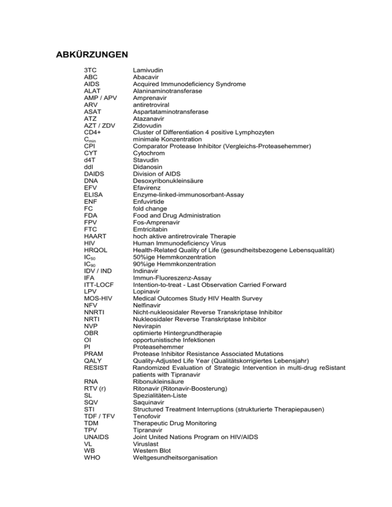 ABKÜRZUNGEN 3TC ABC AIDS ALAT AMP / APV ARV ASAT ATZ AZT / ZDV CD4+ Cmin CPI CYT d4T ddI DAIDS DNA EFV ELISA ENF FC FDA FPV FTC HAART HIV HRQOL IC50 IC90 IDV / IND IFA ITT-LOCF LPV MOS-HIV NFV NNRTI NRTI NVP OBR OI PI PRAM QALY RESIST RNA RTV (r) SL SQV STI TDF / TFV TDM TPV UNAIDS VL WB WHO Lamivudin Abacavir Acquired Immunodeficiency Syndrome Alaninaminotransferase Amprenavir antiretroviral Aspartataminotransferase Atazanavir Zidovudin Cluster of Differentiation 4 positive Lymphozyten minimale Konzentration Comparator Protease Inhibitor (Vergleichs-Proteasehemmer) Cytochrom Stavudin Didanosin Division of AIDS Desoxyribonukleinsäure Efavirenz Enzyme-linked-immunosorbant-Assay Enfuvirtide fold change Food and Drug Administration Fos-Amprenavir Emtricitabin hoch aktive antiretrovirale Therapie Human Immunodeficiency Virus Health-Related Quality of Life (gesundheitsbezogene Lebensqualität) 50%ige Hemmkonzentration 90%ige Hemmkonzentration Indinavir Immun-Fluoreszenz-Assay Intention-to-treat - Last Observation Carried Forward Lopinavir Medical Outcomes Study HIV Health Survey Nelfinavir Nicht-nukleosidaler Reverse Transkriptase Inhibitor Nukleosidaler Reverse Transkriptase Inhibitor Nevirapin optimierte Hintergrundtherapie opportunistische Infektionen Proteasehemmer Protease Inhibitor Resistance Associated Mutations Quality-Adjusted Life Year (Qualitätskorrigiertes Lebensjahr) Randomized Evaluation of Strategic Intervention in multi-drug reSistant patients with Tipranavir Ribonukleinsäure Ritonavir (Ritonavir-Boosterung) Spezialitäten-Liste Saquinavir Structured Treatment Interruptions (strukturierte Therapiepausen) Tenofovir Therapeutic Drug Monitoring Tipranavir Joint United Nations Program on HIV/AIDS Viruslast Western Blot Weltgesundheitsorganisation Förderverein Chipunga – Hintergrundinformation zu HIV/AIDS 1 EINLEITUNG Die chronische Infektion mit dem Human Immunodeficiency Virus (HIV) und das Acquired Immunodeficiency Syndrome (AIDS) haben sich zu einem grossen Gesundheitsproblem der Weltbevölkerung entwickelt. Im Jahr 2004 waren Schätzungen der Weltgesundheitsorganisation (WHO) und des Joint United Nations Program on HIV/AIDS (UNAIDS) zufolge 3,1 Millionen Todesfälle im Zusammenhang mit AIDS und 4,9 Millionen Neuinfektionen zu verzeichnen und 39,4 Millionen Menschen litten zu diesem Zeitpunkt an HIV/AIDS.1 In den Industrienationen konnte der Einsatz der hoch aktiven antiretroviralen Therapie (HAART) die Mortalität und Morbidität im Zusammenhang mit HIV/AIDS in den letzten zehn Jahren deutlich verringern.2, 3 Trotz des Erfolgs der HAART kommt es bei den meisten Patienten zu einem Versagen des initialen Therapieschemas4, 5, 6 und immer mehr Patienten weisen Infektionen mit resistenten HIV-Stämmen auf.7 Durch die Resistenzentwicklung gegenüber antiretroviralen (ARV) Medikamenten verlieren viele Medikamente ihre Wirksamkeit und sind nicht mehr in der Lage, die Virusreplikation einzudämmen. Um Patienten mit resistenten Virusstämmen aussichtsreiche neue Behandlungsalternativen bieten zu können, werden neue Substanzen mit einem gegenüber den verfügbaren antiretroviralen Medikamenten verbesserten Resistenzprofil benötigt. Insbesondere bei mehrfach vorbehandelten Patienten mit hohem Resistenzniveau können derartige Substanzen neue Behandlungsmöglichkeiten eröffnen und dadurch die klinische Progredienz der Erkrankung bremsen. 2 DIE HIV/AIDS-ERKRANKUNG Das Human Immunodeficiency Virus / Acquired Immunodeficiency Syndrome (HIV/AIDS) stellt ein grosses Gesundheitsproblem für die Weltbevölkerung dar. Die Erkrankung wird durch eine chronische Infektion mit dem Human Immunodeficiency Virus (HIV) Typ 1 oder Typ 2 hervorgerufen. Bei den meisten der weltweiten HIV/AIDS-Infektionen liegt das HIV-1Virus vor. HIV-2 wird weniger leicht übertragen und ist im Wesentlichen auf Teile von Afrika begrenzt.8 HIV-1 weist mehrere genetische Unterformen sowie rekombinante Formen auf, die für die Resistenzentwicklung der Viren und die Auswahl der Therapieschemata von grosser Bedeutung sind (siehe 2.6).9 In den Industrienationen hat sich die HIV-Infektion durch die Möglichkeit einer medikamentösen Therapie zu einer chronischen Erkrankung gewandelt. Die Betreuung von Patienten, die eine Behandlung mit antiretroviralen Medikamenten erhalten, wird jedoch immer komplexer und muss individuell auf den Einzelnen abgestimmt werden. Häufig ist ein multidiziplinärer Ansatz erforderlich. Probleme mit der therapeutischen Compliance und mit Medikamentenresistenzen der Viren waren Anlass, neue Substanzen zu entwickeln. Wir wissen heute mehr über den Prozess der Virusreplika- Förderverein Chipunga: HIV -AIDS Zusammenfassung_August 2005 2 Förderverein Chipunga – Hintergrundinformation zu HIV/AIDS tion und derzeit werden neue Zielstrukturen für die Therapie erforscht. Durch verbesserte Therapiestrategien eröffnen sich neue Möglichkeiten im Kampf gegen die HIV-Infektion. 2.1 Der HIV-Lebenszyklus Das Verständnis des komplexen Lebenszyklus des HIV-Virus ermöglichte eine Weiterentwicklung der antiretroviralen Therapie und die Identifikation der Mechanismen, über die Medikamentenresistenzen entstehen. Wie in Abbildung 1 dargestellt, vermehrt sich das Virus über eine Infektion von CD4-Zellen. CD4-Zellen sind T-Zell-Lymphozyten, die den Körper bei der Bekämpfung von Infektionen unterstützen. Abbildung 1. Der Lebenszyklus des Human Immunodeficiency Virus CD4+ Zelle Fusio HIV-Partikel vRNA Knospung Reverse Zusammenbau CD4-Rezeptor dsDN Co-Rezeptor zelluläre DNA Integrase vRNA Protease Transkription mRNA Translation Zellker Der Lebenszyklus des Human Immunodeficiency Virus beinhalt den Prozess der Replikation in den CD4-Zellen und lässt sich in drei Stadien einteilen: • Eindringen des Virus in die Zelle. Das Virus lagert sich zunächst über einen als Fusion bezeichneten Prozess (der durch Oberflächenrezeptoren der Wirtszelle vermittelt wird) an die Zelle an und dringt anschliessend in diese