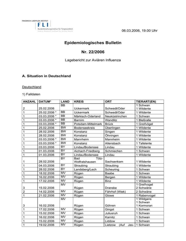 06.03.2006, 19.00 Uhr Epidemiologisches Bulletin Nr. 22/2006 Lagebericht zur Aviären Influenza A. Situation in Deutschland Deutschland 1) Falldaten ANZAHL DATUM* 2 1 1 1 1 1 1 1 1 1 1 1 1 25.02.2006 25.02.2006 * 03.03.2006 * 03.03.2006 * 03.03.2006 * 25.02.2006 28.02.2006 28.02.2006 03.03.2006 * 03.03.2006 * 03.03.2006 01.03.2006 01.03.2006 1 1 1 1 1 1 28.02.2006 04.03.2006 28.02.2006 18.02.2006 16.02.2006 17.02.2006 3 2 1 15.02.2006 14.02.2006 21.02.2006 3 1 1 1 1 1 16.02.2006 17.02.2006 15.02.2006 16.02.2006 15.02.2006 19.02.2006 LAND BB BB BB BB BB BW BW BW BW BW BY BY BY BY BY BY MV MV MV MV MV MV MV MV MV MV MV MV KREIS ORT Uckermark Uckermark Märkisch-Oderland Barnim Potsdam-Mittelmark Bodenseekreis Konstanz Konstanz Mannheim Konstanz Lindau/Bodensee Aichach-Friedberg Lindau/Bodensee Bad TölzWolfratshausen Straubing Landsberg/Lech Rügen Rügen Rügen Schwedt/Oder Schwedt/Oder Neuküstrinchen Wandlitz Brück Überlingen Singen Öhningen Mannheim Allensbach Lindau Schmiechen Lindau Rügen Rügen Rügen Rügen Rügen Rügen Rügen Rügen Rügen Sachsenkam Straubing Scheuring Baabe Bergen Binz TIERART(EN) 1 Schwan 1 Wildente 1 Wildente 1 Schwan 1 Bleßralle 1 Greifvögel 1 Wildente 1 Wildente 1 Wildente 1 Wildente 1 Tafelente 1 Wildente 1 Schwan 1 Wildente 1 Wildente 1 Wildente 1 Schwan 1 Schwan 1 Wildente 1 Wildente 1 Greifvogel Dranske 2 Schwäne Fährhof (Wiek) 2 Schwäne Glowe 1 Rabenvogel 1 Wildgans 1 Schwan Göhren 1 Kormoran Gingst 1 Schwan Juliusruh 1 Schwan Karnitz 1 Schwan Liddow 1 Schwan Lietzow (Auf Jas- 1 Schwan ANZAHL DATUM* LAND KREIS Rügen Ostvorpommern Nordvorpommern Rügen ORT mund) Moritzdorf (b. Göhren) Netzeband (b. Greifswald) Neuendorf (Hiddensee) Neuenkirchen Nonnevitz Poggendorf (Schaprode) Potthagen Prerow Prora (b. Binz) Rügen Rügen Rügen Sassnitz Schaprode Sellin Rügen Rügen Rügen Wismar,Stadt Tetzitz Trent Ummanz Wismar Rügen Rügen Rügen Rügen Rügen Nordvorpommern Ostvorpommern Wittower Fähre Wreechen Zicker Wiek Glowe Prerow Brünzow Klein Damnitz, Ha1 Kanadagans fen Zirmoisel 1 Nebelkrähe Altenkirchen 1 Mäusebussard Rerik 1 Höckerschwan Überseehafen Wis1 Reiherente mar Glowe 1 Ente Dranske 1 Säger Ummanz 1 Schwan Wiek 3 Schwäne Glowe 1 Möwenvogel Binz 1 Haubentaucher Breege 1 Schwan Prerow 1 Wildente Prohn 1 Schwan Zingst 1 Wildgans Schaprode 6 Höckerschwäne Ummanz 4 Höckerschwäne Dranske 2 Höckerschwäne Walsrode 1 Wildgans MV 2 16.02.2006 1 19.02.2006 Rügen MV Ostvorpommern MV 1 1 1 17.02.2006 16.02.2006 16.02.2006 4 1 1 1 17.02.2006 23.02.2006 17.02.2006 17.02.2006 9 1 1 16.02.2006 15.02.2006 19.02.2006 8 1 2 1 17.02.2006 21.02.2006 21.02.2006 17.02.2006 56 1 1 1 1 1 1 15.02.2006 17.02.2006 17.02.2006 23.02.2006 23.02.2006 25.02.2006 25.02.2006 1 1 1 1 25.02.2006 24.02.2006 24.02.2006 25.02.2006 1 1 1 1 3 1 1 1 1 1 1 6 4 2 1 27.02.2006 27.02.2006 25.02.2006 26.02.2006 05.03.2006 05.03.2006 05.03.2006 05.03.2006 01.03.2006 03.03.2006 03.03.2006 06.03.2006 06.03.2006 06.03.2006 04.03.2006 * MV MV MV MV MV MV MV MV MV MV MV MV MV MV MV MV MV MV MV MV MV MV MV MV MV MV MV MV MV MV MV MV MV MV MV MV MV MV NI Rügen Rügen Rügen Nordvorpommern Rügen Rügen Bad Doberan Wismar, Stadt Rügen Rügen Rügen Rügen Rügen Rügen Rügen Nordvorpommern Nordvorpommern Nordvorpommern Rügen Rügen Rügen Soltau-Fallingbostel TIERART(EN) 1 Greifvogel 1 Möwenvogel 1 Greifvogel 1 Schwan 1 Schwan 1 Schwan 1 Wildgans 3 Schwäne 1 Schwan 1 Möwenvogel 1 Schwan 3 Schwäne 4 Wildenten 2 Möwenvögel 1 Schwan 1 Greifvogel 7 Schwäne 1 Wildgans 1 Greifvogel 2 Wildgänse 1 Wildente 44 Schwäne 9 Wildgänse 2 Möwenvögel 1 Kormoran 1 Schwan 1 Schwan 1 Mäusebussard 1 Großmöwe, juv. 1 Singschwan 1 Schwan 2 ANZAHL 1 1 1 1 DATUM* 01.03.2006 * 04.03.2006 04.03.2006 23.02.2006 1 23.02.2006 LAND SH SH SH SH SH KREIS Ostholstein Plön Steinburg Ostholstein Ostholstein ORT Westfehmarn Hohwacht Kollman Neustadt in Holstein Timmendorfer Strand TIERART(EN) 1 Schwan 1 Schwan 1Bergente 1 Wildente 1 Wildente * Datum des Seuchenverdachts, soweit nicht anders angegeben. 2) Geographische Darstellung a) Übersichtskarte Deutschland 3 b) Detailkarte Mecklenburg-Vorpommern und angrenzende Gebiete 3) Zusatzinformationen: In Deutschland wurde AIV H5N1 bisher bei 168 Wildvögeln und einer Hauskatze festgestellt. Mehrere Verdachtsfälle bei Wildvögeln werden noch abgeklärt. Alle weiteren im Landesamt für Landwirtschaft, Lebensmittelsicherheit und Fischerei Rostock beziehungsweise am FLI auf der Insel Riems untersuchten 32 Säugetiere und potenzielle Aasfresser aus Mecklenburg-Vorpommern wurden mit negativem Ergebnis auf AIV H5N1 getestet. Untersucht wurden Füchse, Marder, Katzen, Marderhunde, Dachse, Wildschweine, sowie ein Nerz, ein Hund und ein Waschbär. Somit war von insgesamt 33 Proben lediglich eine Probe positiv (81). Die EU-Kommission traf am 15.02.2006 eine Entscheidung mit vorübergehenden Schutzmaßnahmen wegen Verdachtsfällen von hoch pathogener aviärer Influenza bei Wildvögeln in Deutschland. Baden-Württemberg Am 25.02.2006 wurde bei einer Tafelente aus Überlingen, Landkreis Konstanz H5N1 nachgewiesen; ebenso in zwei weiteren Fällen von einer Tafelente aus Öhningen sowie einer Wildente, in Singen am 28.02.2006. Zwei weitere Fälle von H5N1 wurden am 03.03.2006 in Mannheim und Allensbach nachgewiesen. Bayern Am 28.02.2006 wurde bei einer Wildente (Sachsenkam, Landkreis Bad Tölz-Wolfratshausen) und einem Schwan (Scheuring, Landkreis Landsberg/Lech) H5N1 nachgewiesen. Weitere Fälle wurden am 01.03.2006 bei einem Schwan in Aichach-Friedberg, am 01.03. und 03.03.2006 bei zwei Wildenten in Lindau sowie ein Verdachtsfall am 04.03. in Straubing diagnostiziert. 4 Brandenburg In Crieben, Stadt Schwedt/Oder, Landkreis Uckermark, wurde bei einem Schwan sowie bei einer Wildente der Verdacht der Infektion mit H5N1 am 25.02.2006 geäußert und inzwischen durch das FLI bestätigt. Die gebildete Beobachtungszone liegt teilweise auf dem Territorium der Republ