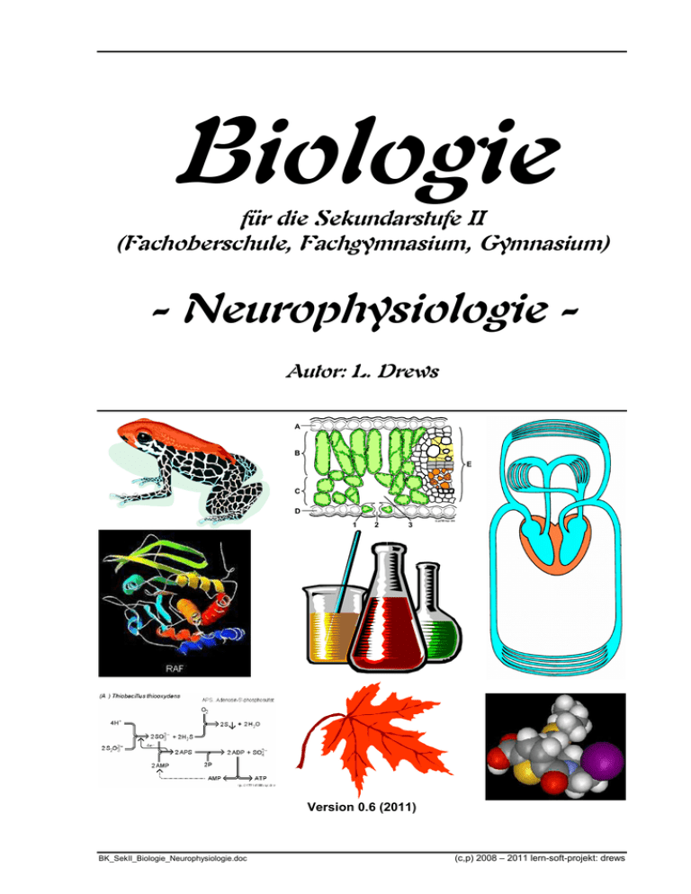 Biologie für die Sekundarstufe II (Fachoberschule, Fachgymnasium, Gymnasium) - Neurophysiologie Autor: L. Drews A B E C D 1 2 3 (c,p)'98 lsp: dre Version 0.6 (2011) BK_SekII_Biologie_Neurophysiologie.doc (c,p) 2008 – 2011 lern-soft-projekt: drews Legende: mit diesem Symbol werden zusätzliche Hinweise, Tips und weiterführende Ideen gekennzeichnet Nutzungsbestimmungen / Bemerkungen zur Verwendung durch Dritte: (1) Dieses Skript (Werk) ist zur freien Nutzung in der angebotenen Form durch den Anbieter (lern-soft-projekt) bereitgestellt. Es kann unter Angabe der Quelle und / oder des Verfassers gedruckt, vervielfältigt oder in elektronischer Form veröffentlicht werden. (2) Das Weglassen von Abschnitten oder Teilen (z.B. Aufgaben und Lösungen) in Teildrucken ist möglich und sinnvoll (Konzentration auf die eigenen Unterrichtsziele, -inhalte und -methoden). Bei angemessen großen Auszügen gehört das vollständige Inhaltsverzeichnis und die Angabe einer Bezugsquelle für das Originalwerk zum Pflichtteil. (3) Ein Verkauf in jedweder Form ist ausgeschlossen. Der Aufwand für Kopierleistungen, Datenträger oder den (einfachen) Download usw. ist davon unberührt. (4) Änderungswünsche werden gerne entgegen genommen. Ergänzungen, Arbeitsblätter, Aufgaben und Lösungen mit eigener Autorenschaft sind möglich und werden bei konzeptioneller Passung eingearbeitet. Die Teile sind entsprechend der Autorenschaft zu kennzeichnen. Jedes Teil behält die Urheberrechte seiner Autorenschaft bei. (5) Zusammenstellungen, die von diesem Skript - über Zitate hinausgehende - Bestandteile enthalten, müssen verpflichtend wieder gleichwertigen Nutzungsbestimmungen unterliegen. (6) Diese Nutzungsbestimmungen gehören zu diesem Werk. (7) Der Autor behält sich das Recht vor, diese Bestimmungen zu ändern. (8) Andere Urheberrechte bleiben von diesen Bestimmungen unberührt. Rechte Anderer: Viele der verwendeten Bilder unterliegen verschiedensten freien Lizenzen. Nach meinen Recherchen sollten alle genutzten Bilder zu einer der nachfolgenden freien Lizenzen gehören. Unabhängig von den Vorgaben der einzelnen Lizenzen sind zu jedem extern entstandenen Objekt die Quelle, und wenn bekannt, der Autor / Rechteinhaber angegeben. Zum Gemeingut erklärte Graphiken oder Fotos (u.a.). Viele der verwenpublic domain (pd) deten Bilder entstammen Webseiten / Quellen US-amerikanischer Einrichtungen, die im Regierungsauftrag mit öffentlichen Mitteln finanziert wurden und darüber rechtlich (USA) zum Gemeingut wurden. Andere kreative Leistungen wurden ohne Einschränkungen von den Urhebern freigegeben. gnu free document licence (GFDL; gnu fdl) creative commens (cc) od. neu … Namensnennung … nichtkommerziell … in der gleichen Form … unter gleichen Bedingungen Die meisten verwendeten Lizenzen schließen eine kommerzielle (Weiter-)Nutzung aus! Bemerkungen zur Rechtschreibung: Dieses Skript folgt nicht zwangsläufig der neuen ODER alten deutschen Rechtschreibung. Vielmehr wird vom Recht auf künstlerische Freiheit, der Freiheit der Sprache und von der Autokorrektur des Textverarbeitungsprogramms microsoft ® WORD ® Gebrauch gemacht. Für Hinweise auf echte Fehler ist der Autor immer dankbar. BK_SekII_Biologie_Neurophysiologie.doc -2- (c,p) 2008 - 2011 lsp: dre Inhaltsverzeichnis: Seite 0. Einführung.................................................................................................... 5 1. Bau und Funktion des Nervensystems...................................................... 6 1.1. Aufgaben der Nervensysteme.................................................................................. 6 1.2. Arten der Nervensysteme......................................................................................... 6 1.3. prinzipielle Leistungen der Nervensysteme.......................................................... 10 1.3.1. Reiz-Reaktions-Ketten ....................................................................................... 10 1.3.2. Reflexe............................................................................................................... 10 1.3.2.1. unbedingte Reflexe ..................................................................................... 11 1.3.2.2. bedingte Reflexe ......................................................................................... 11 1.3.3. Regelkreise / Regelsysteme............................................................................... 12 1.3.4. höhere Nervenleistungen ................................................................................... 12 1.3.4.1. Instinkthandlungen ...................................................................................... 12 1.3.4.2. Lernen......................................................................................................... 13 1.3.4.3. Bewußtsein ................................................................................................. 14 integrale Funktionen des Nervensystems .................................................................... 14 Emotionen................................................................................................................ 14 Schlafen (Schlaf-Wach-Rhythmus) .......................................................................... 14 Lernen und Gedächtnis ............................................................................................ 14 Exkurs: moderne medizinische Bild-gebende Untersuchungsmethoden ...................... 15 2. Bau und Funktion der Nerven-Zellen ....................................................... 17 2.1. Bau der Nerven-Zellen ............................................................................................ 17 2.2. physiologische Abläufe in und an der Nerven-Zelle............................................. 23 2.2.1. Transport von Stoffen innerhalb der Zelle .......................................................... 23 2.2.2. das Membran-Potential ...........................