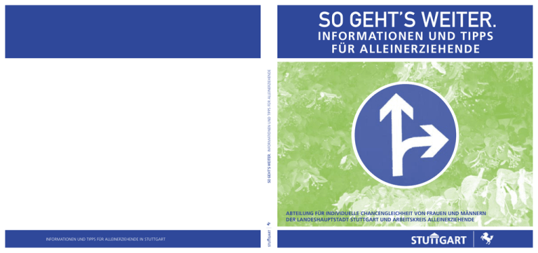 SO GEHT’S WEITER. SO GEHT’S WEITER. INFORMATIONEN UND TIPPS FÜR ALLEINERZIEHENDE INFORMATIONEN UND TIPPS FÜR ALLEINERZIEHENDE ABTEILUNG FÜR INDIVIDUELLE CHANCENGLEICHHEIT VON FRAUEN UND MÄNNERN DER LANDESHAUPTSTADT STUTTGART UND ARBEITSKREIS ALLEINERZIEHENDE INFORMATIONEN UND TIPPS FÜR ALLEINERZIEHENDE IN STUTTGART GRUßWORT Liebe Mütter, liebe Väter, Familie in Stuttgart ist vielfältig und bunt und ist überall dort wo Kinder sind: In rund 54.000 der etwa 309.000 Stuttgarter Haushalte lebten Ende 2012 überhaupt noch Kinder unter 18 Jahren. In rund 20 Prozent von ihnen wachsen Kinder mit nur einem Elternteil auf. Alleinerziehende sind keine homogene Gruppe, sondern unterscheiden sich nach finanzieller Situation, Bildungsstand, Alter, Gesundheit, Herkunft. Sie sind freiwillig oder wegen Trennung und Scheidung alleinerziehend, seit vielen Jahren oder erst seit Kurzem. Alleinerziehen ist jedoch nach wie vor eindeutig eine Sache der Mütter: Rund 90 Prozent der Alleinerziehenden sind weiblich. Obwohl bundesweit etwa zwei Drittel der Alleinerziehenden erwerbstätig sind, sind Einelternfamilien immer noch überproportional von Armut bedroht. Noch immer mangelt es an Arbeitsplätzen mit familiengerechten – flexiblen – Arbeitszeiten und -bedingungen. Als Oberbürgermeister der Landeshauptstadt ist es mir ein großes Anliegen, die Rahmenbedingungen für Familien in Stuttgart so zu gestalten, dass die Vereinbarkeit von Beruf und Familie für Mütter und Väter problemlos möglich ist, egal in welcher Familienform sie leben. Gemeinsam mit dem Gemeinderat wurde vieles bereits auf den Weg gebracht: So wurden in den letzten Jahren Ganztagesbetreuungsplätze in Kitas für rund 42 Prozent der Kinder geschaffen. Eltern haben inzwischen die Wahl zwischen Ganztags- und Halbtagsgrundschulen für ihr Kind. Dennoch reichen die Betreuungsplätze bei Weitem noch nicht aus. Auch fehlt es noch immer an preiswertem, familien- 2 gerechtem Wohnraum. Dieses Arbeitsfeld wird daher auch weiterhin erhebliche Anstrengungen von uns fordern, denen ich mich gerne stelle. In der vorliegenden Broschüre „So geht’s weiter – Informationen und Tipps für Alleinerziehende“ hat meine Abteilung für individuelle Chancengleichheit von Frauen und Männern in Zusammenarbeit mit dem Arbeitskreis Alleinerziehende die wichtigsten familienpolitischen Leistungen, staatliche Hilfen, Unterstützungsangebote und Maßnahmen freier oder kirchlicher Träger, von gemeinnützigen Organisationen und Ehrenamtlichen und der Landeshauptstadt Stuttgart selbst zusammengetragen, die Ihnen den Alltag erleichtern helfen wollen. Bitte machen Sie regen Gebrauch von diesen Angeboten. Fritz Kuhn INHALTSVERZEICHNIS Grußwort 2 Vorwort 6 1. Rund um Schwangerschaft und Geburt 9 1.1 1.2 Beratungsstellen für Schwangere Geburtsvorbereitung, Hebammenhilfe und Entbindung Mutterschutz und Mutterschaftsgeld 1.3 2. 2.1 2.2 2.3 2.4 2.5 2.6 2.7 2.8 2.9 2.10 2.11 2.12 2.13 4 10 11 12 Hilfe bei Fragen rund ums Kind 17 Frühe Hilfen 18 Offene Sprechstunde des Gesundheitsamts 18 Familienhebammen 18 Familienkinderkrankenschwester 19 „Sonnenkinder“ – Gesund und geborgen aufwachsen in Stuttgart 19 PEB – Pflegerische Elternberatung am Olgahospital 19 Entwicklungspsychologische Beratung für Eltern mit Säuglingen und Kleinkindern 20 Sozialpädiatrisches Zentrum im Olgahospital 20 „Zwergenambulanz“ des TeZet – Therapiezentrum der Gerhard-Alber-Stiftung 21 Psychotherapeutische Babyambulanz Stuttgart 21 Interdisziplinäre Frühförderstelle (IFF) 22 Familieninformation des Jugendamts der Landeshauptstadt Stuttgart 22 Kinderschutz-Zentrum Stuttgart 23 3. 3.1 3.2 3.3 3.4 3.5 3.6 3.7 3.8 3.9 3.10 3.11 3.12 3.13 3.14 3.15 3.16 3.17 3.18 4. 4.1 4.2 4.3 4.4 4.5 4.6 Das liebe Geld Elternzeit/Elterngeld Kindergeld Kinderzuschlag Unterhalt und Unterhaltsvorschuss für Ihr Kind Betreuungsgeld Unterhalt wegen Schwangerschaft und Geburt für nicht verheiratete Frauen Arbeitslosengeld I Arbeitslosengeld II/Sozialgeld Zuschüsse zu den Kinderbetreuungskosten FamilienCard Bonuscard Bildungs- und Teilhabeleistung Landesfamilienpass Befreiung von der Rundfunkbeitragspflicht Witwen-/Witwer-, Voll-, Halbwaisenrente, Erziehungsrente Wohngeld Schulden Günstige Kindersachen, Möbel und Hausrat 25 26 28 29 29 30 Rechtliche Fragen Scheidung der Ehe Ehegattenunterhalt Fragen zum Sorge- und Umgangsrecht Rechtsberatung, Beratungshilfe und Prozesskostenhilfe Erbrecht Ausländerrechtliche Fragen 41 42 42 42 31 32 32 35 35 36 36 37 37 37 38 39 39 45 46 46 5. 5.1 5.2 5.3 5.4 5.6 5.7 Rund ums Wohnen Mietspiegel Wohnungssuche Sozialwohnungen Wohnungsbaugesellschaften und Wohnungsbaugenossenschaften Wohnprojekte und Wohnanlagen für Alleinerziehende Drohende Wohnungslosigkeit Bau oder Kauf von Wohneigentum 51 53 53 6. 6.1 6.2 6.3 6.4 6.5 6.6 6.7 6.8 6.9 6.10 6.11 Wohin mit den Kindern? Babysitterdienste Ganztageseinrichtungen für Kinder Kindergärten Eltern-Kind-Gruppen Tagesmütter und -väter Pflegestellen Kinderbetreuung durch Au-pairs Betreuung für Schulkinder Soziale Schülerbetreuung/Hausaufgabenbetreuung Kinderbetreuung in den Schulferien Betreute Freizeiten im In- und Ausland 55 57 57 57 58 58 59 59 60 61 61 62 7. 7.1 7.2 7.3 7.4 Erwerbstätigkeit Vollzeitbeschäftigung Teilzeitbeschäftigung Geringfügige Beschäftigung (Minijob) Berufliche Orientierung und (Wieder-)Einstieg in den Beruf 63 64 64 65 5.5 49 50 50 50 51 8. Studium mit Kind 69 9. 9.1 9.2 9.3 9.4 9.5 Bei Krankheit Gesundheit des Kindes Ihre Gesundheit Kurzzeitpflege für Ihr Kind Kuren Was wird aus meinem Kind, wenn mir etwas zustößt? 71 72 73 73 74 75 10. Gewalt in der Beziehung 10.1 Häusliche Gewalt 10.2 Stalking 77 78 78 11. Treffpunkte, Freizeit und Urlaub 81 12. 12.1 12.2 12.3 Beratung in allen Lebenslagen Beratungszentren des Jugendamts Krisen- und Notfalldienst Psychologische, Sozial- und Lebensberatung 87 88 89 89 13. Bürgerbüros in Stuttgart 91 66 5 VORWORT Liebe Mütter, liebe Väter, auf
