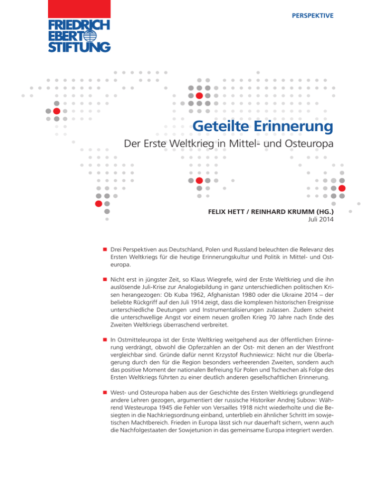 PERSPEKTIVE Geteilte Erinnerung Der Erste Weltkrieg in Mittel- und Osteuropa FELIX HETT / REINHARD KRUMM (HG.) Juli 2014 n Drei Perspektiven aus Deutschland, Polen und Russland beleuchten die Relevanz des Ersten Weltkriegs für die heutige Erinnerungskultur und Politik in Mittel- und Osteuropa. n Nicht erst in jüngster Zeit, so Klaus Wiegrefe, wird der Erste Weltkrieg und die ihn auslösende Juli-Krise zur Analogiebildung in ganz unterschiedlichen politischen Krisen herangezogen: Ob Kuba 1962, Afghanistan 1980 oder die Ukraine 2014 – der beliebte Rückgriff auf den Juli 1914 zeigt, dass die komplexen historischen Ereignisse unterschiedliche Deutungen und Instrumentalisierungen zulassen. Zudem scheint die unterschwellige Angst vor einem neuen großen Krieg 70 Jahre nach Ende des Zweiten Weltkriegs überraschend verbreitet. n In Ostmitteleuropa ist der Erste Weltkrieg weitgehend aus der öffentlichen Erinnerung verdrängt, obwohl die Opferzahlen an der Ost- mit denen an der Westfront vergleichbar sind. Gründe dafür nennt Krzystof Ruchniewicz: Nicht nur die Überlagerung durch den für die Region besonders verheerenden Zweiten, sondern auch das positive Moment der nationalen Befreiung für Polen und Tschechen als Folge des Ersten Weltkriegs führten zu einer deutlich anderen gesellschaftlichen Erinnerung. n West- und Osteuropa haben aus der Geschichte des Ersten Weltkriegs grundlegend andere Lehren gezogen, argumentiert der russische Historiker Andrej Subow: Während Westeuropa 1945 die Fehler von Versailles 1918 nicht wiederholte und die Besiegten in die Nachkriegsordnung einband, unterblieb ein ähnlicher Schritt im sowjetischen Machtbereich. Frieden in Europa lässt sich nur dauerhaft sichern, wenn auch die Nachfolgestaaten der Sowjetunion in das gemeinsame Europa integriert werden. FELIX HETT / REINHARD KRUMM (HG.) | GETEILTE ERINNERUNG Inhalt Vorwort Reinhard Krumm. . . . . . . . . . . . . . . . . . . . . . . . . . . . . . . . . . . . . . . . . . . . . . . . . . . . . . . . . . . .2 Der lange Schatten des Ersten Weltkriegs Klaus Wiegrefe. . . . . . . . . . . . . . . . . . . . . . . . . . . . . . . . . . . . . . . . . . . . . . . . . . . . . . . . . . . . . 3 Der »Große Krieg« in Ostmitteleuropa Krzysztof Ruchniewicz . . . . . . . . . . . . . . . . . . . . . . . . . . . . . . . . . . . . . . . . . . . . . . . . . . . . . . . 6 Lehren aus der Geschichte des 20. Jahrhunderts Andrej Subow. . . . . . . . . . . . . . . . . . . . . . . . . . . . . . . . . . . . . . . . . . . . . . . . . . . . . . . . . . . . . 9 1 FELIX HETT / REINHARD KRUMM (HG.) | GETEILTE ERINNERUNG Reinhard Krumm Vorwort vanz des Krieges für das heutige Europa. Sie wird deutlich am Beispiel der Krise in der Ukraine. Erneut scheinen Schlafwandler unterwegs zu sein. Binnen weniger Wochen kam es zu kriegerischen Auseinandersetzungen in der Ukraine. Und ebenso schnell verlor das Land mit der Halbinsel Krim ein Gebiet an Russland. Gewaltsame Grenzverschiebungen dieser Art galten im Jahr 2014 bis vor kurzem noch als unvorstellbar. Gedenkjahre können Star-Charakter erlangen. Sobald sich ein derartiger Verdacht erhärtet, werden die Buchmärkte mit Neuveröffentlichungen überschwemmt. Zumeist erinnern Jubiläen an historische Zeitenwenden, geben Anlass für historische Reflexionen, manchmal auch zu einer Neuinterpretation der Geschehnisse. In der jüngsten Vergangenheit hatte die Jahrestroika 1989, 1990, 1991 die höchste Konjunktur im öffentlichen Gedenken. Sie symbolisiert das Ende des Kalten Krieges und den Beginn der Einigung Europas. Die Gründe der Spaltung liegen freilich mehr als ein halbes Jahrhundert zurück, festgemacht an den Jahren 1917, 1933, 1939, 1941, 1945. Der Politikwissenschaftler Herfried Münkler spricht von der Verantwortung der Zivilgesellschaft zu Beginn des 20. Jahrhunderts. Damals, so Münkler, seien die Gesellschaften heroisiert gewesen, begeistert vom Patriotismus, bereit, in den Krieg zu ziehen und zu sterben. Das hätte sich in Westeuropa seitdem verändert, heute seien die post-heroischen Gesellschaften eingebunden in Wohlstand und Stabilität. Anders als zum Beispiel in Russland, wo sich in Teilen der Bevölkerung ein starkes Nationalgefühl entwickelt hat, das weniger für als vielmehr gegen etwas steht – und zwar gegen den unklar definierten Westen. Zu diesen Stars gesellt sich 2014 ein hundertjähriges Gedenkjahr: 1914 begann der Erste Weltkrieg. In Europa gilt dieser Krieg und die Niederlage Deutschlands vielen als indirekter Auslöser für den nächsten Weltkrieg – als Urkatastrophe. Deshalb findet sich das Jahrhundert-Ereignis in jedem Terminkalender der europäischen Staatsund Regierungschefs dick eingetragen wieder. Um sich der Interpretation der Geschichte zu Beginn des 20. Jahrhunderts vergleichend zu nähern, gibt die Friedrich-Ebert-Stiftung Historikern aus den drei Ländern Russland, Polen und Deutschland die Möglichkeit, in der gebotenen Kürze die Bedeutung des Ersten Weltkrieges zu analysieren. Die Beiträge beruhen auf Vorträgen, die von den Autoren Ende April 2014 bei den von der Friedrich-Ebert-Stiftung und der Hessischen Stiftung Friedens- und Konfliktforschung organisierten Schlangenbader Gesprächen gehalten wurden. In Deutschland hatte Fritz Fischers Buch »Griff nach der Weltmacht« lange die Deutungshoheit. In anderen Ländern war das Interesse eher gering. Als Alexander Solschenizyn 1971 sein Werk »August Vierzehn” publizierte, waren seine Erwartungen an die Leser und deren Resonanz groß. Der erste Band der auf insgesamt 20 Bände angelegten Geschichtsaufarbeitung »Das rote Rad« sollte für den Ersten Weltkrieg die gleiche Aufmerksamkeit und den Einfluss erreichen, wie es einst Lew Tolstoj mit seinem epochalen Werk »Krieg und Frieden” für den Krieg Russlands gegen Napoleon gelang. Doch der spätere Nobelpreisträger scheiterte. Gut vierzig Jahre später ist das Interesse der Leser in Europa neu erwacht – die Ursachen des Ersten Weltkrieges wo