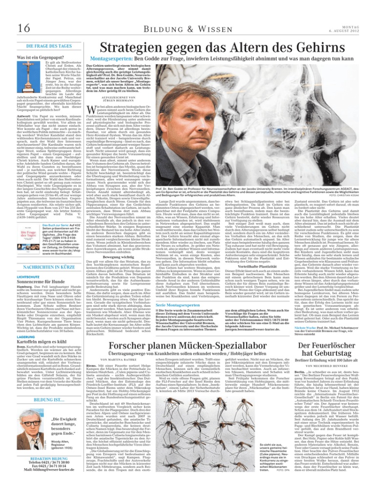 16 MONTAG 6. AUGUST 2012 Bildung & Wissen Strategien gegen das Altern des Gehirns DIE FRAGE DES TAGES Was ist ein Gegenpapst? FOTO: DPA Er gilt als Stellvertreter Christi auf Erden. Als Oberhaupt der römischkatholischen Kirche haben seine Worte Macht: der Papst. Petrus, ein Jünger Jesu, war der erste, bis in die heutige Zeit ist die Reihe weitergegangen. Allerdings tauchte im Laufe der Jahrhunderte Konkurrenz auf. Manchmal sah sich ein Papst einem gewählten Gegenpapst gegenüber, der ebenfalls kirchliche Macht beanspruchte. Wo kam dieser Gegenpapst so plötzlich her? Antwort: Um Papst zu werden, müssen Kandidaten seit jeher von einem Kardinalskollegium gewählt werden. Vor allem im Mittelalter war das nicht immer einfach: Wer konnte als Papst – der auch gerne in der weltlichen Politik mitmischte – zu mächtig werden? Welcher Kandidat stand den wählenden Kirchenmännern nah und versprach, nach der Wahl ihre Interessen durchzusetzen? Die Kardinäle waren sich nicht immer einig, teilweise entbrannte heftiger Streit, sodass Splittergruppen ihren eigenen Papst – einen Gegenpapst – aufstellten und ihn dann zum Nachfolger Christi kürten. Auch Kaiser und europäische Adelshöfe fanden Gefallen daran, die Wahl zu ihren Gunsten zu beeinflussen und – je nachdem, aus welcher Richtung der politische Wind gerade wehte – Päpste und Gegenpäpste anzuerkennen oder eben auch nicht. Die Wahl des Stellvertreters Christi geriet so oft genug zum reinen Machtspiel. Wie viele Gegenpäpste es in der langen Geschichte des Papstums gegeben hat, ist nicht eindeutig belegt. Schätzungen gehen von 25 bis 40, oft nur wenige Jahre amtierenden historischen Gegenpäpsten aus, die teilweise im französischen Avignon residierten. Als relativ sicher gilt, dass Hyppolit von Rom von 217 bis 235 der erste Gegenpapst war. Als letzter historischer Gegenpapst wird Felix V. TOL (1439-1449) geführt. Das Buch zur Serie: Auf 432 Seiten präsentieren wir Fragen und Antworten auf Alltägliches. „Die Frage des Tages“ (ISBN 978-3-938795-21-7) ist zu haben in den Geschäftsstellen unserer Zeitung, im Onlineshop www.weser-kurier.de/shop sowie im Buchhandel. Montagsexperten: Ben Godde zur Frage, inwiefern Leistungsfähigkeit abnimmt und was man dagegen tun kann Das Gehirn unterliegt einem biologischen Alterungsprozess, aber nimmt damit gleichzeitig auch die geistige Leistungsfähigkeit ab? Prof. Dr. Ben Godde, Neurowissenschaftler an der Jacobs University Bremen, erklärt als unser heutiger „Montagsexperte“, was sich beim Altern im Gehirn tut, und was man machen kann, um trotzdem im Alter geistig fit zu bleiben. A U F G E Z E I C HN E T V ON JÜ RG E N B E E RM A N N ie bei allen anderen biologischen Organen nimmt auch beim Gehirn die Leistungsfähigkeit im Alter ab. Die Funktionen werden langsamer oder schwächer, weil die Hirnleistung unter anderem auf physiologische und biologische Prozesse aufbaut, die sich mit dem Alter verändern. Dieser Prozess ist allerdings beeinflussbar, vor allem durch ein gesundes Herz-Kreislauf-System. Wenn das im Alter nicht trainiert wird – beispielsweise durch regelmäßige Bewegung – lässt es nach, das Gehirn bekommt insgesamt weniger Sauerstoff und verliert dadurch an Leistungskraft. Nicht umsonst wird gesagt, dass ein gesunder Körper die beste Voraussetzung für einen gesunden Geist ist. Wenn man altert, nimmt unter anderem das Volumen des Gehirns ab. Davon betroffen ist beispielsweise das Myelin, quasi die Isolation der Nervenfasern. Wenn diese Schicht beschädigt ist, beeinträchtigt das die Übertragung und Weiterleitung von Informationen, alles wird sozusagen ungenauer. Noch gravierender wirkt sich der Abbau von Synapsen aus, also der Verknüpfungen zwischen den Nervenzellen. Deren Anzahl nimmt altersbedingt ab, wird aber auch stark beeinflusst durch Alkohol, Nikotin, Drogen sowie Umweltgifte. Desgleichen durch Stress. Gerade für den Hippocampus, einer für das Gedächtnis zentralen Schaltstation im Gehirn, ist nachgewiesen, dass Stress dort zum Abbau wichtiger Verzweigungen führt. Die Anzahl der Nervenzellen nimmt im Alter ebenfalls ab, das jedoch in den verschiedenen Bereichen des Gehirns in unterschiedlicher Stärke. In einigen Regionen bleibt der Bestand bis ins hohe Alter stabil, in anderen Bereichen dagegen gibt es einen besonders starken Abbau. Betroffen sind zumeist vergleichsweise kleine Strukturen. Wenn jedoch in Kleinhirnbereichen das Volumen abnimmt, hat das gravierendere Auswirkungen, als wenn große Strukturen Nervenzellen einbüßen. W Bewegung wichtig NACHRICHTEN IN KÜRZE LICHTSCHUTZ Sonnencreme für Hunde Hamburg. Das Fell langhaariger Hunde sollte im Sommer nur gekürzt und nicht geschoren werden. Denn besonders helle Hauttypen mit rosa Nase und Ohren oder sehr kurzhaarige Tiere können einen Sonnenbrand oder gar einen Sonnenstich bekommen. Zum Schutz sollten Besitzer ihren Vierbeinern Ohren und Nase mit herkömmlicher Sonnencreme aus der Apotheke oder Drogerie einreiben, empfiehlt Birgitt Thiesmann von der Organisation Vier Pfoten. Kurzgeschorene Tiere brauchen den Lichtschutz am ganzen Körper. Wichtig ist, dass die Produkte mindestens einen Lichtschutzfaktor von 50 haben. Das gilt vor allem für das Striatum, das zu den hochkomplexen motorischen Regelkreisen des Großhirns gehört. Wenn es dort einen Abbau gibt, ist im Prinzip das ganze Gehirn davon betroffen. Das Striatum ist nämlich für die Produktion von Dopamin verantwortlich, das für die Aufmerksamkeitssteuerung sowie für Lernprozesse große Bedeutung hat. Andererseits gibt es viele positive Einflüsse, die dafür sorgen, dass auch im Alter die Gehirnleistung zu großen Teilen erhalten bleibt. Bewegung etwa. Oder das Lernen. Gerade die synaptischen Verbindungen sind sehr stark davon abhängig, dass sie genutzt werden. Man kann sie genauso trainieren wie Muskeln. Aber: Ebenso wie ein Muskel abgebaut wird, wenn man ihn nicht benutzt, werden auch Synapsen abgebaut, wenn man sie nicht gebr