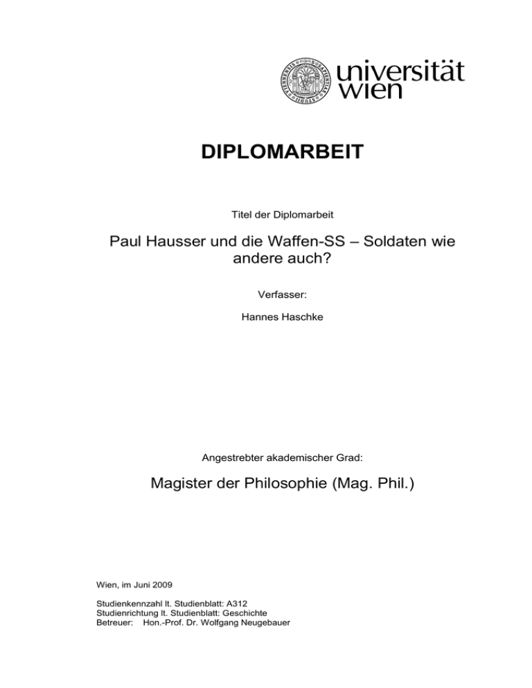 DIPLOMARBEIT Titel der Diplomarbeit Paul Hausser und die Waffen-SS – Soldaten wie andere auch? Verfasser: Hannes Haschke Angestrebter akademischer Grad: Magister der Philosophie (Mag. Phil.) Wien, im Juni 2009 Studienkennzahl lt. Studienblatt: A312 Studienrichtung lt. Studienblatt: Geschichte Betreuer: Hon.-Prof. Dr. Wolfgang Neugebauer 1 INHALTSVERZEICHNIS 1. Einleitung und Fragestellung der Arbeit: War Paul Hausser ein Soldat wie jeder andere auch? .......................................2 2. Geschichte der SS und im speziellen der Waffen-SS ..........4 2.1. Entstehung und Struktur der Allgemeinen SS ..............4 2.2. Geschichte der Waffen-SS: von der Verfügungstruppe zur Waffen-SS.............................................................. 11 2.3. die Waffen-SS im Kriege und ihr Ende ...................... 15 3. Hilfsgemeinschaft auf Gegenseitigkeit (HIAG) ................. 33 4. Paul Hausser – ein Soldat wie jeder andere auch? ........... 36 4.1. Paul Haussers Weg zur Waffen-SS ........................... 36 4.2. Paul Hausser als Leiter der SS-Junkerschule .............. 37 4.3. Paul Hausser als Truppenführer im 2.Weltkrieg .......... 39 4.4. Hitler und die Waffen-SS......................................... 51 4.5. Paul Hausser und das Kriegsende............................. 53 4.6 Paul Hausser als Zeuge im Nürnberger Prozess gegen die Hauptkriegsverbrecher ............................................. 54 4.7. Paul Haussers Reinwaschung der Waffen-SS.............. 64 5. Zusammenfassung ...................................................... 75 6. Lebenslauf.................................................................. 77 7. Literatur..................................................................... 78 8. Anhänge .................................................................... 81 8.1. Anhang 1 .............................................................. 81 8.2. Anhang 2 .............................................................. 82 8.3. Anhang 3 .............................................................. 83 8.4. Anhang 4 .............................................................. 84 8.5. Anhang 5 .............................................................. 85 8.6 Anhang 6 ............................................................... 87 8.7. Anhang 7 .............................................................. 89 8.8. Anhang 8 .............................................................. 90 8.9. Anhang 9 .............................................................. 91 8.10. Anhang 10 .......................................................... 95 8.11. Anhang 11 .......................................................... 96 8.12. Anhang 12 .......................................................... 97 8.13. Anhang 13 .......................................................... 98 1 2 1. Einleitung und Fragestellung der Arbeit: War Paul Hausser ein Soldat wie jeder andere auch? Die Kernfrage, die diese Diplomarbeit beschäftigt und am Beispiel des Waffen-SS-Generals Paul Hausser zu beantworten versucht, ist, ob es wirklich möglich war in der Nazi-Hierarchie weit oben zu stehen und dennoch sich nichts zu Schulden kommen zu lassen oder von den vielen Verbrechen wenig bis gar nichts mitbekommen zu haben. Viele Angehörige der Waffen-SS sahen sich nach dem Krieg mit dem Etikett „Verbrecher“ versehen, da die SS und ihre Unterorganisationen im Nürnberger Kriegsverbrecher-Prozess als „verbrecherisch“ eingestuft wurden. Einige bekannte ehemalige Waffen-SS-Offiziere schrieben eigens Bücher – wie zum Beispiel Paul Hausser und Felix Steiner –, in denen sie geschickt versuchten, die Waffen-SS reinzuwaschen und von der Allgemeinen SS zu trennen. Auch noch bis in unsere Tage bedienen sich Politiker in Deutschland und auch in Österreich dieser immer noch nicht ganz aufgearbeiteten Thematik, um auf Stimmenfang in einem gewissen Wählerklientel zu gehen. Nach einem einleitenden Überblick über die Allgemeine SS und die Waffen-SS versuche ich aufzuzeigen, in wieweit die SSVerfügungstruppe, die später in Waffen-SS umgetauft wurde, im Laufe des Krieges zusehends durch Gräueltaten auffiel - und genau dieser Umstand sie bei Adolf Hitler so beliebt gemacht hat: Für ihn war die unmenschliche Härte, die die Waffen-SS im Kampf gegenüber sich selbst und auch dem Gegner zeigte, wünschenswert und ein letzter Hoffnungsschimmer, um diesen Krieg doch noch zu gewinnen. Deshalb war jede Gräueltat für Hitler nur ein weiterer 2 3 Beweis dafür, dass die Waffen-SS „seine“ Elite war. 3 4 2. Geschichte der SS und im speziellen der Waffen-SS 2.1. Entstehung und Struktur der Allgemeinen SS Die Geschichte der SS beginnt unter dem Namen „Stoßtrupp Hitler“ im Mai 1923 – Aufgabe war der direkte Schutz Adolf Hitlers in den Zeiten der wilden Saalschlachten1. Obwohl dies ursprünglich Aufgabe der SA gewesen war, erkannte Hitler relativ schnell, dass diese SA, die sich selbst revolutionär gab, nicht verlässlich genug hinter seiner Person stand. Hitler wollte zunächst eine kleine Einheit, die nur auf ihn eingeschworen war, allerdings voll und ganz ergeben – die SS. Im Jahr 1925 wurde der Stoßtrupp auf den Namen SS umbenannt und deren Charakter definiert: Sie verstand sich als Elite und Prätorianergarde, die dem Führer in bedingungslosem Gehorsam unterworfen war. Zunächst schien sie neben der Masse der SA unbedeutend. Die SS hatte anfänglich ein strenges Auswahlverfahren und Richtlinien für Anwerber - im Gegensatz zur SA, die so etwas nicht kannte; Ebenso streng ging man in der SS mit Verfehlungen der Angehörigen um. Auch war der Stoßtrupp auf Adolf Hitler eingeschworen - die SA und deren Führer wurden im Kontrast dazu immer Hitler-kritischer, sahen sie doch in der SS eine direkte Konkurrenz in den eigenen Reihen erwachsen. Die SA unter ihrem langjährigen und einflussreichen Führer Ernst Röhm wollte auch Teil der Macht sein und nicht ein willenloses