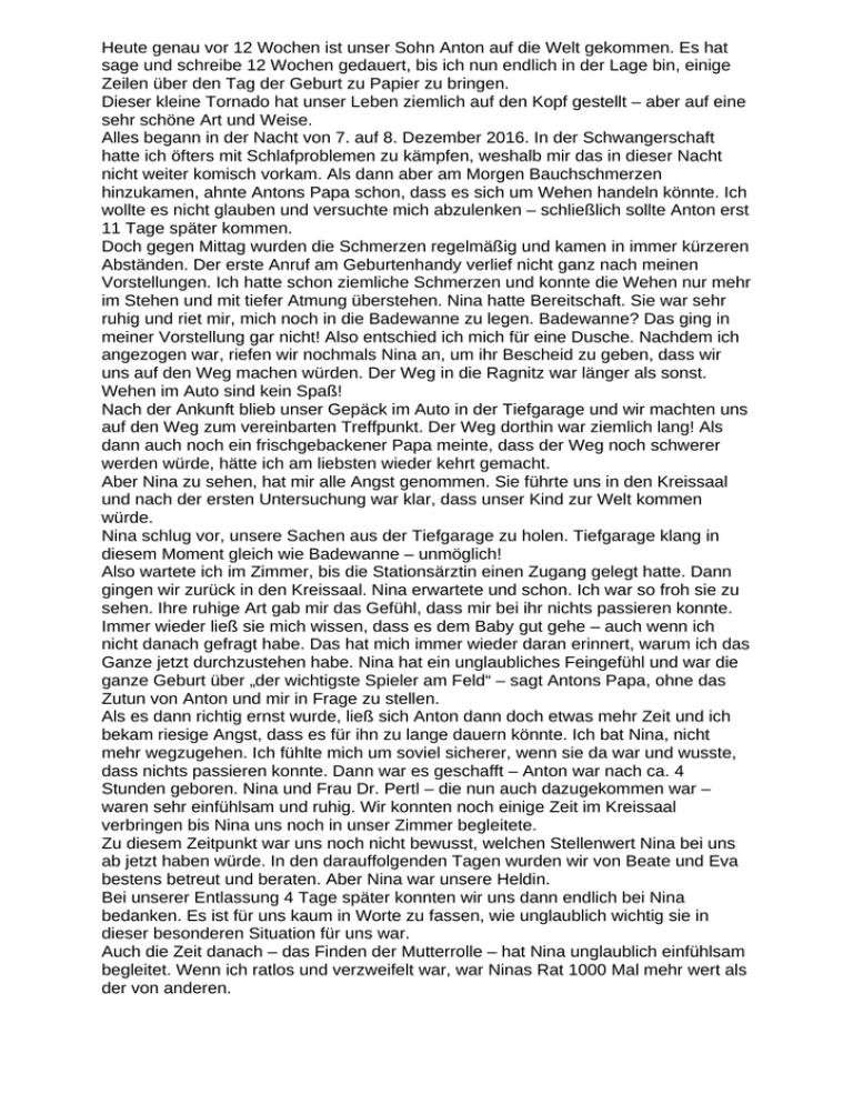 Heute genau vor 12 Wochen ist unser Sohn Anton auf die Welt gekommen. Es hat sage und schreibe 12 Wochen gedauert, bis ich nun endlich in der Lage bin, einige Zeilen über den Tag der Geburt zu Papier zu bringen. Dieser kleine Tornado hat unser Leben ziemlich auf den Kopf gestellt – aber auf eine sehr schöne Art und Weise. Alles begann in der Nacht von 7. auf 8. Dezember 2016. In der Schwangerschaft hatte ich öfters mit Schlafproblemen zu kämpfen, weshalb mir das in dieser Nacht nicht weiter komisch vorkam. Als dann aber am Morgen Bauchschmerzen hinzukamen, ahnte Antons Papa schon, dass es sich um Wehen handeln könnte. Ich wollte es nicht glauben und versuchte mich abzulenken – schließlich sollte Anton erst 11 Tage später kommen. Doch gegen Mittag wurden die Schmerzen regelmäßig und kamen in immer kürzeren Abständen. Der erste Anruf am Geburtenhandy verlief nicht ganz nach meinen Vorstellungen. Ich hatte schon ziemliche Schmerzen und konnte die Wehen nur mehr im Stehen und mit tiefer Atmung überstehen. Nina hatte Bereitschaft. Sie war sehr ruhig und riet mir, mich noch in die Badewanne zu legen. Badewanne? Das ging in meiner Vorstellung gar nicht! Also entschied ich mich für eine Dusche. Nachdem ich angezogen war, riefen wir nochmals Nina an, um ihr Bescheid zu geben, dass wir uns auf den Weg machen würden. Der Weg in die Ragnitz war länger als sonst. Wehen im Auto sind kein Spaß! Nach der Ankunft blieb unser Gepäck im Auto in der Tiefgarage und wir machten uns auf den Weg zum vereinbarten Treffpunkt. Der Weg dorthin war ziemlich lang! Als dann auch noch ein frischgebackener Papa meinte, dass der Weg noch schwerer werden würde, hätte ich am liebsten wieder kehrt gemacht. Aber Nina zu sehen, hat mir alle Angst genommen. Sie führte uns in den Kreissaal und nach der ersten Untersuchung war klar, dass unser Kind zur Welt kommen würde. Nina schlug vor, unsere Sachen aus der Tiefgarage zu holen. Tiefgarage klang in diesem Moment gleich wie Badewanne – unmöglich! Also wartete ich im Zimmer, bis die Stationsärztin einen Zugang gelegt hatte. Dann gingen wir zurück in den Kreissaal. Nina erwartete und schon. Ich war so froh sie zu sehen. Ihre ruhige Art gab mir das Gefühl, dass mir bei ihr nichts passieren konnte. Immer wieder ließ sie mich wissen, dass es dem Baby gut gehe – auch wenn ich nicht danach gefragt habe. Das hat mich immer wieder daran erinnert, warum ich das Ganze jetzt durchzustehen habe. Nina hat ein unglaubliches Feingefühl und war die ganze Geburt über „der wichtigste Spieler am Feld“ – sagt Antons Papa, ohne das Zutun von Anton und mir in Frage zu stellen. Als es dann richtig ernst wurde, ließ sich Anton dann doch etwas mehr Zeit und ich bekam riesige Angst, dass es für ihn zu lange dauern könnte. Ich bat Nina, nicht mehr wegzugehen. Ich fühlte mich um soviel sicherer, wenn sie da war und wusste, dass nichts passieren konnte. Dann war es geschafft – Anton war nach ca. 4 Stunden geboren. Nina und Frau Dr. Pertl – die nun auch dazugekommen war – waren sehr einfühlsam und ruhig. Wir konnten noch einige Zeit im Kreissaal verbringen bis Nina uns noch in unser Zimmer begleitete. Zu diesem Zeitpunkt war uns noch nicht bewusst, welchen Stellenwert Nina bei uns ab jetzt haben würde. In den darauffolgenden Tagen wurden wir von Beate und Eva bestens betreut und beraten. Aber Nina war unsere Heldin. Bei unserer Entlassung 4 Tage später konnten wir uns dann endlich bei Nina bedanken. Es ist für uns kaum in Worte zu fassen, wie unglaublich wichtig sie in dieser besonderen Situation für uns war. Auch die Zeit danach – das Finden der Mutterrolle – hat Nina unglaublich einfühlsam begleitet. Wenn ich ratlos und verzweifelt war, war Ninas Rat 1000 Mal mehr wert als der von anderen. Nach wie vor sprechen wir ganz oft von Nina. Manchmal schmunzeln wir und hoffen, dass sie nicht zu oft von Schluckauf geplagt neuen Babys in die Welt hilft. Weitere 2 Wochen später habe ich es nun geschafft, diese Zeilen abzutippen. Mittlerweile habe ich mich für Rückbildungsyoga mit Nina und Eva angemeldet. Nicht nur weil es Zeit wird, mir etwas Gutes zu tun, sondern auch, weil ich weiß, dass Anton und ich dort wieder bestens aufgehoben sein werden. Es war mir nicht bewusst, welchen Stellenwert eine Hebamme bei der Geburt einnimmt. Über unsere Entscheidung für das Hebammenteam Beate-Eva-Nina sind wir überglücklich. Nach wie vor denke ich, dass ich den Schmerz bei der Geburt nicht vergessen werde, dass ich meine Verzweiflung zwischendurch immer wieder abrufen kann. Ich hatte unglaubliche Angst davor, dass die Geburt für mich ein schreckliches Erlebnis sein würde – das war es nicht! Und dafür sind wir unglaublich dankbar! Wir danken euch von Herzen für die tolle Betreuung vor, während und nach der Geburt! Sollte noch eine kleine Seele seinen Weg zu uns suchen, seid ihr unser erster Weg! Eva und Markus mit Anton