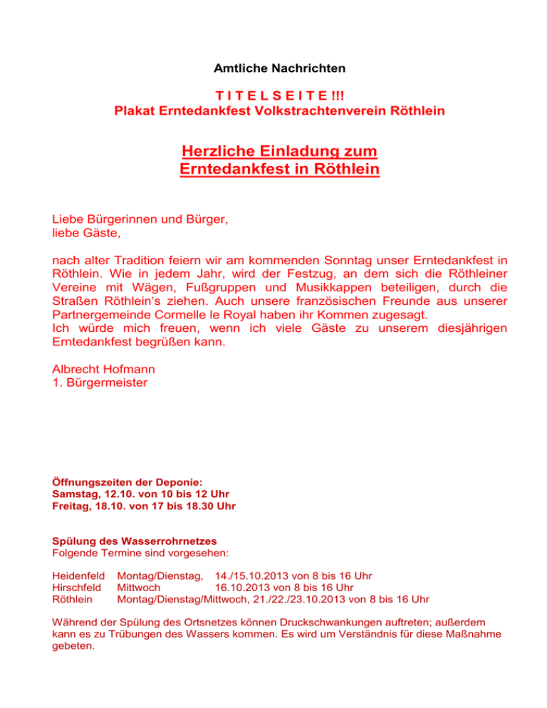 Amtliche Nachrichten T I T E L S E I T E !!! Plakat Erntedankfest Volkstrachtenverein Röthlein Herzliche Einladung zum Erntedankfest in Röthlein Liebe Bürgerinnen und Bürger, liebe Gäste, nach alter Tradition feiern wir am kommenden Sonntag unser Erntedankfest in Röthlein. Wie in jedem Jahr, wird der Festzug, an dem sich die Röthleiner Vereine mit Wägen, Fußgruppen und Musikkappen beteiligen, durch die Straßen Röthlein‘s ziehen. Auch unsere französischen Freunde aus unserer Partnergemeinde Cormelle le Royal haben ihr Kommen zugesagt. Ich würde mich freuen, wenn ich viele Gäste zu unserem diesjährigen Erntedankfest begrüßen kann. Albrecht Hofmann 1. Bürgermeister Öffnungszeiten der Deponie: Samstag, 12.10. von 10 bis 12 Uhr Freitag, 18.10. von 17 bis 18.30 Uhr Spülung des Wasserrohrnetzes Folgende Termine sind vorgesehen: Heidenfeld Hirschfeld Röthlein Montag/Dienstag, 14./15.10.2013 von 8 bis 16 Uhr Mittwoch 16.10.2013 von 8 bis 16 Uhr Montag/Dienstag/Mittwoch, 21./22./23.10.2013 von 8 bis 16 Uhr Während der Spülung des Ortsnetzes können Druckschwankungen auftreten; außerdem kann es zu Trübungen des Wassers kommen. Es wird um Verständnis für diese Maßnahme gebeten. RMG Zweckverband zur Wasserversorgung Rhön-Maintal-Gruppe Betriebsleitung Aktionstag "Kennst Du Dein Limit" am Freitag, 18. Oktober 2013 für Jugendliche ab 14 Jahren Die Teilnahme ist kostenlos In Zusammenarbeit mit der Suchtpräventionsstelle des Landratsamtes Schweinfurt und dem Kreisjugendring Schweinfurt lädt die Gemeinde Röthlein alle Jugendlichen, Ortsgruppen, Jugendvereine- und Verbände zum Aktionstag "Kennst Du Dein Limit" herzlich ein. Die Veranstaltung findet in der Sporthalle des TSV Röthlein (Am Sportplatz 1, 97520 Röthlein) statt, Beginn ist um 18:00 Uhr, Ende ca. um 20:30 Uhr. Neben dem HaLT-Parcours mit Rauschbrillen & mehr wird das Theaterensemble "Chapeau Claque" aus Bamberg ein interaktives Stück rund um das Thema "Komasaufen" aufführen. Die Teilnehmerplätze sind begrenzt. Also schnell anmelden. Am Besten gleich mit den Freundinnen und Freunden. Denn gemeinsam macht es einfach noch mehr Spaß. Anmeldung und weitere Infos telefonisch unter 09721/55-509 oder E-Mail an [email protected] Für unsere Planung bitten wir um eine Anmeldung bis spätestens 15. Oktober 2013. Fundamt der Gemeinde Röthlein; Fundsachen Letzten Monat wurde in Röthlein in der Lippertstraße 1 Einzelschlüssel Gefunden und im Fundamt der Gemeinde, Zimmer 1, abgegeben, wo er auch abgeholt werden kann. Öffentliche Bekanntmachung Freiwilliger Wehrdienst; Übermittlung von Daten an das Bundesamt für Wehrverwaltung Zum 1. Juli 2011 ist die allgemeine Wehrpflicht, soweit kein Spannungs- oder Verteidigungsfall vorliegt, ausgesetzt und in einen freiwilligen Wehrdienst übergeleitet worden. Frauen und Männer, die Deutsche im Sinne des Grundgesetzes sind, können sich nach § 54 des Wehrpflichtgesetzes verpflichten, freiwillig Wehrdienst zu leisten. Damit das Bundesamt für Wehrverwaltung die Möglichkeit hat, über den freiwilligen Wehrdienst zu informieren, übermittelt die Meldebehörde jährlich zum 31. März folgende Daten von Personen mit deutscher Staatsangehörigkeit, die im nächsten Jahr volljährig werden, an das Bundesamt für Wehrverwaltung: Familiename, Vornamen und gegenwärtige Anschrift Betroffene haben das Recht der Datenübermittlung zu widersprechen. Der Widerspruch ist an keine Voraussetzung gebunden und braucht nicht begründet zu werden. Er kann bei der Meldebehörde, Gemeinde Röthlein, Elmußweg 1, Zimmer 1, 97520 Röthlein, eingelegt werden. Falls der Datenübermittlung nicht widersprochen wurde, wird die Meldebehörde die genannten Daten weitergeben. Röthlein, 04.10.2013 Gemeinde Röthlein Hofmann 1. Bürgermeister Wir gratulieren Frau Christel Engelbrecht Lippertstraße 20, Röthlein, am 14.10. zum 60. Geburtstag Herrn Günter Eusemann Blumenweg 10, Röthlein, am 14.10. zum 80. Geburtstag Herrn Hasan Göktas Rheinfeldstraße 33, Röthlein, am 15.10. zum 60. Geburtstag Herrn Heinz Peter Hümmer St.-Jakobus-Weg 10, Röthlein, am 15.10. zum 60. Geburtstag Frau Christa Brembs Hauptstraße 44, Röthlein, am 17.10. zum 72. Geburtstag Herrn Josef Illenseer Elmußweg 18, Röthlein, am 17.10. zum 66. Geburtstag Frau Emma Glückler Hauptstraße 34, Röthlein, am 19.10. zum 86. Geburtstag Herrn Konrad Lindl Baumgärtleinstraße 14, Heidenfeld, am 15.10. zum 75. Geburtstag Herrn Manfred Lorenz Richard-Strauß-Straße 2, Heidenfeld, am 16.10. zum 66. Geburtstag Herrn Hermann Endres Balthasar-Neumann-Straße 6, Heidenfeld, am 18.10. zum 86. Geburtstag Frau Dorothea Lorenz Unterer Friedhofsweg 25, Heidenfeld, am 18.10. zum 71. Geburtstag Frau Helga Bombis Am Wasen 6, Hirschfeld, am 14.10. zum 70. Geburtstag Frau Irma Müller Sonnenstraße 6, Hirschfeld, am 16.10. zum 77. Geburtstag Gemeindebibliothek Katholische Öffentliche Bücherei Heidenfeld KÖB Hirschfeld Kirchliche Nachrichten Gottesdienstordnung Rö./Hei./Hi. Evangelisch-Lutherische Kirchengemeinde Schwebheim Schulecke Mittelschule Holderhecke, Bergrheinfeld Für die 10ten Klassen der Hauptschulen Bayern gibt es in diesem Schuljahr ein Pilotprojekt, an dem auch Schüler aus Bergrhenfeld teilnehmen. Gemeinsam mit 2 Mitschülern nimmt Marco Ziegler an einem fiktiven Wirtschaftsplanspiel teil, welches sich beachmanager nennt. Beim beachmanager wirtschaftet und rechnet man, wie man ein Wassersportcenter führen kann. Um den Gewinn zu erhöhen und sich Bonus verschaffen kann, gibt es sogenannte praktische Module. In diesen erstellt man Werbespots für seinen fiktivern Betrieb oder macht auf anderem Wege auf sich aufmerksam. „In der 10. Klasse ist einer dieser praktischen Bausteine, eine Pressemeldung zu schreiben, in der wir uns vorstellen, unseren Konzern darstellen, unsere Schule vorstellen und hervorheben was uns besonders macht.“ Da die Schüler diese Pressemeldung real machen in unserem Amtsboten veröffentlichen wollen, gehen wir