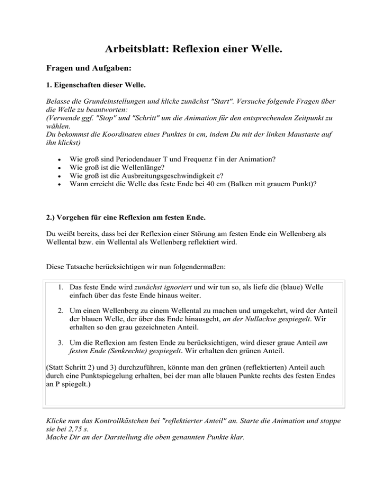 Arbeitsblatt: Reflexion einer Welle. Fragen und Aufgaben: 1. Eigenschaften dieser Welle. Belasse die Grundeinstellungen und klicke zunächst "Start". Versuche folgende Fragen über die Welle zu beantworten: (Verwende ggf. "Stop" und "Schritt" um die Animation für den entsprechenden Zeitpunkt zu wählen. Du bekommst die Koordinaten eines Punktes in cm, indem Du mit der linken Maustaste auf ihn klickst) Wie groß sind Periodendauer T und Frequenz f in der Animation? Wie groß ist die Wellenlänge? Wie groß ist die Ausbreitungsgeschwindigkeit c? Wann erreicht die Welle das feste Ende bei 40 cm (Balken mit grauem Punkt)? 2.) Vorgehen für eine Reflexion am festen Ende. Du weißt bereits, dass bei der Reflexion einer Störung am festen Ende ein Wellenberg als Wellental bzw. ein Wellental als Wellenberg reflektiert wird. Diese Tatsache berücksichtigen wir nun folgendermaßen: 1. Das feste Ende wird zunächst ignoriert und wir tun so, als liefe die (blaue) Welle einfach über das feste Ende hinaus weiter. 2. Um einen Wellenberg zu einem Wellental zu machen und umgekehrt, wird der Anteil der blauen Welle, der über das Ende hinausgeht, an der Nullachse gespiegelt. Wir erhalten so den grau gezeichneten Anteil. 3. Um die Reflexion am festen Ende zu berücksichtigen, wird dieser graue Anteil am festen Ende (Senkrechte) gespiegelt. Wir erhalten den grünen Anteil. (Statt Schritt 2) und 3) durchzuführen, könnte man den grünen (reflektierten) Anteil auch durch eine Punktspiegelung erhalten, bei der man alle blauen Punkte rechts des festen Endes an P spiegelt.) Klicke nun das Kontrollkästchen bei "reflektierter Anteil" an. Starte die Animation und stoppe sie bei 2,75 s. Mache Dir an der Darstellung die oben genannten Punkte klar. 3. Die Gesamtwelle. Die Gesamtwelle bekommen wir nun, indem wir die Auslenkungen der blauen (einlaufenden) Welle und der grünen (reflektierten) Welle einfach addieren. Klicke nun auch noch das Kontrollkästchen bei "Gesamtwelle" an. (Es sind nun alle Kontrollkästchen aktiviert). Lasse die Animation bis zum Erreichen des festen Endes durchlaufen und gehe danach im Modus "Schritt >>" weiter. Mache Dir die Addition der beiden Anteile klar. Wie sieht die Gesamtwelle zum Zeitpunkt 2,25 s aus? Wie sieht die Gesamtwelle zum Zeitpunkt 2,4 s aus? Wie sieht die Gesamtwelle zum Zeitpunkt 2,5 s aus? Wie groß ist die maximale Amplitude der Gesamtwelle in diesem Augenblick (2,5 s)? 4.) Eigenschaften einer stehenden Welle. Lasse die Animation mehrfach durchlaufen (alle Kontrollkästchen gesetzt). Wie groß ist die Auslenkung des festen Endes zu allen Zeitpunkten? Gibt es weitere Punkte auf dem Wellenträger, die sich auch so verhalten? Wiederhole die Animation, jedoch ist nun nur das Häkchen bei "Gesamtwelle" gesetzt. Es gibt Punkte auf dem Wellenträger, die sich zu keinem Zeitpunkt bewegen. Sie scheinen wie an der Mittellinie "festgeknotet". Man nennt sie daher "Schwingungsknoten"oder kurz "Knoten". Genau zwischen zwei solchen "Knoten" schwingen die Teilchen des Wellenträgers mit maximaler Amplitude hin und her. Solche Stellen nennt man "Schwingungsbäuche"oder kurz "Bäuche" Wie groß ist der Abstand zweier Schwingungskonten? Wie groß ist der Abstand zweier Schwingungsbäuche? Drücke die Abstände als Teil der Wellenlänge Lambda aus! 6.) Reflexion beim offenen Ende. Wähle nun "offenes Ende" aus und klicke alle drei Auswahlkästchen für die Darstellung an. Wie bekommt man nun den reflektierten (grünen) Anteil aus dem blauen Anteil, der über das Ende hinausgeht? Ist am offenen Ende ein Schwingungsknoten oder ein Schwingungsbauch?