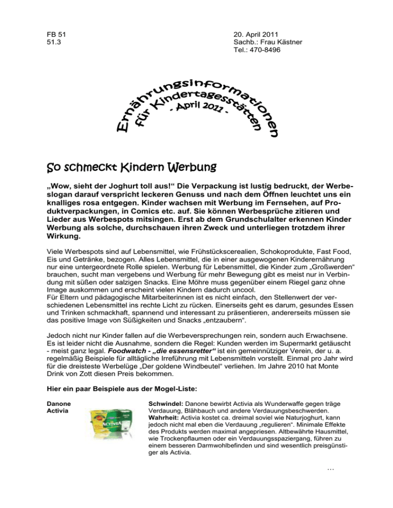 FB 51 51.3 20. April 2011 Sachb.: Frau Kästner Tel.: 470-8496 So schmeckt Kindern Werbung „Wow, sieht der Joghurt toll aus!“ Die Verpackung ist lustig bedruckt, der Werbeslogan darauf verspricht leckeren Genuss und nach dem Öffnen leuchtet uns ein knalliges rosa entgegen. Kinder wachsen mit Werbung im Fernsehen, auf Produktverpackungen, in Comics etc. auf. Sie können Werbesprüche zitieren und Lieder aus Werbespots mitsingen. Erst ab dem Grundschulalter erkennen Kinder Werbung als solche, durchschauen ihren Zweck und unterliegen trotzdem ihrer Wirkung. Viele Werbespots sind auf Lebensmittel, wie Frühstückscerealien, Schokoprodukte, Fast Food, Eis und Getränke, bezogen. Alles Lebensmittel, die in einer ausgewogenen Kinderernährung nur eine untergeordnete Rolle spielen. Werbung für Lebensmittel, die Kinder zum „Großwerden“ brauchen, sucht man vergebens und Werbung für mehr Bewegung gibt es meist nur in Verbindung mit süßen oder salzigen Snacks. Eine Möhre muss gegenüber einem Riegel ganz ohne Image auskommen und erscheint vielen Kindern dadurch uncool. Für Eltern und pädagogische Mitarbeiterinnen ist es nicht einfach, den Stellenwert der verschiedenen Lebensmittel ins rechte Licht zu rücken. Einerseits geht es darum, gesundes Essen und Trinken schmackhaft, spannend und interessant zu präsentieren, andererseits müssen sie das positive Image von Süßigkeiten und Snacks „entzaubern“. Jedoch nicht nur Kinder fallen auf die Werbeversprechungen rein, sondern auch Erwachsene. Es ist leider nicht die Ausnahme, sondern die Regel: Kunden werden im Supermarkt getäuscht - meist ganz legal. Foodwatch - „die essensretter“ ist ein gemeinnütziger Verein, der u. a. regelmäßig Beispiele für alltägliche Irreführung mit Lebensmitteln vorstellt. Einmal pro Jahr wird für die dreisteste Werbelüge „Der goldene Windbeutel“ verliehen. Im Jahre 2010 hat Monte Drink von Zott diesen Preis bekommen. Hier ein paar Beispiele aus der Mogel-Liste: Danone Activia Schwindel: Danone bewirbt Activia als Wunderwaffe gegen träge Verdauung, Blähbauch und andere Verdauungsbeschwerden. Wahrheit: Activia kostet ca. dreimal soviel wie Naturjoghurt, kann jedoch nicht mal eben die Verdauung „regulieren“. Minimale Effekte des Produkts werden maximal angepriesen. Altbewährte Hausmittel, wie Trockenpflaumen oder ein Verdauungsspaziergang, führen zu einem besseren Darmwohlbefinden und sind wesentlich preisgünstiger als Activia. … -2Stockmeyer Ferdi Fuchs Mini Würstchen Schwindel: Stockmeyer bezeichnet die Würstchen als „täglichen Beitrag für die gesunde Ernährung“. Wahrheit: Der Salzgehalt in den Würstchen ist mit 2 g/100 g sehr hoch und auch der Fettgehalt und die gesättigten Fette würden eine „rote Ampel“ bekommen. Hin und wieder in kleinen Mengen, ist der Verzehr dieser Würstchen in Ordnung, jedoch nicht als täglicher Snack. Monte Drink von Zott Schwindel: Früher wurde das Produkt als „gesunder Drink“, später als „Zwischenmahlzeit“ beworben. Neuerdings fehlen diese Angaben auf der Verpackung, allerdings soll nun Nationaltorwart René Adler für einen sportlichen und gesunden Anstrich sorgen. Wahrheit: Das Milchmischgetränk liefert vor allem Zucker. Er ist mit 7 Stück Würfelzucker pro Flasche genauso zuckerhaltig wie Coca Cola. Schwartau Corny Schoko Schwindel: Der „locker-kernige“ Riegel mit den angeblich „ausgewogenen Zutaten“ und dem „Besten aus dem Korn“ wird als „optimaler Energiespender“ beschrieben. Wahrheit: Corny ist eine Süßigkeit. Getreide ist vor allem in hochgradig verarbeiteter Form enthalten, zusammengehalten mit jeder Menge Zucker. Wild/SiSi-Werke: Capri Sonne Schwindel: Capri Sonne ist ein „sportliches“ Getränk mit „gesunden Früchten“ und somit ein guter Durstlöscher für Kinder. Wahrheit: Etwa 12 % Saft werden aufgefüllt mit Wasser, Zucker und Aromastoffen. Der Zuckergehalt von 9 Stück Würfelzucker pro Packung wird verschwiegen und somit hat Capri Sonne mit Früchten genauso wenig zu tun, wie mit dem Begriff „gesund“. Ferrero Kinder-Riegel Schwindel: Dank der „Extra-Portion Milch“ mit vielem guten Kalzium kann der Kinder-Riegel ohne schlechtes Gewissen genascht werden. Wahrheit: 13 Riegel würden den Tagesbedarf eines Kindes an Kalzium decken. Das sind ca. 48 Stück Würfelzucker und ein halbes Paket Butter plus Aromen und Zusatzstoffe. Bauer Biene Maja Schwindel: Der Kinderjoghurt „Biene Maja“ ist ein „ausgewogenes“ Milchgetränk für Kinder. Wahrheit: Biene Maja enthält 44 Stück Würfelzucker auf 1 Liter. Cola im Vergleich dazu nur 28. Danone Actimel Schwindel: Actimel - ein Joghurt-Drink, der das Immunsystem „aktiviert“ und „wetterfest“ macht. Wahrheit: Jeder Joghurt aktiviert das Immunsystem ein wenig. Actimel ist zusätzlich jedoch viermal so teuer und enthält doppelt so viel Zucker wie ein herkömmlicher Naturjoghurt. Wissenschaftliche Beweise für einen Erkältungsschutz gibt es nicht. Eckes-Granini Frucht-Tiger Schwindel: Frucht-Tiger der gesunde Durstlöscher für Kinder. Wahrheit: Ein Gemisch aus Wasser und Saftkonzentrat enthielt bisher umstrittene Süßstoffe und auch jede Menge zahnschädliche Citronensäure. Neue Rezeptur: Eckes-Granini hat sich die Verbraucherwünsche zu Herzen genommen und die Rezeptur umgestellt. Der Frucht-Tiger enthält jetzt weder Citronensäure noch Süßstoffe oder Aromen, sondern nur noch Wasser, Fruchtsaftkonzentrat und ein wenig Fruchtsüße. Verbraucherprotest hat Erfolg. … -3Schwartau Fruit2Day Schwindel: 100 % der täglichen Portion Obst stecken in Fruit2Day. Wahrheit: 200 ml der aromatisierten Mischung aus Fruchtsaftkonzentraten und Püree sind nicht vergleichbar mit 200 g unverarbeitetem Obst. Fruit2Day ersetzt höchstens ein Glas Saft, ist jedoch viermal so teuer. Nestlé Fitness Fruits Schwindel: Frühstücksflocken, die zur „Wunschfigur“ und zu einem „gesunden Lebensstil“ beitragen und eine ausgewogene Ernährung 