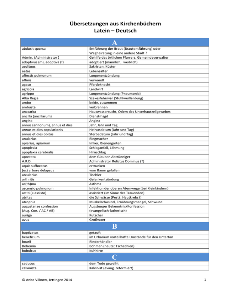Übersetzungen aus Kirchenbüchern Latein – Deutsch A abduxit sponsa Admin. (Administrator ) adoptivus (m), adoptiva (f) aedituus aetas affectis pulmonum affinis agaso agricola agrippo Alba Regia ambo ambusta anasarka ancilla (ancillarum) angina annus (annonum), annus et dies annus et dies copulationis annus et dies obitus anularius apiarius, apiarium apoplexia apoplexia cerebralis apostata A.R.D. aquis suffocatus (ex) arbore delapsus arcularius arthritis as(th)ma ascensio pulmonum astiti (= assisto) atritas atrophia augustanae confession (Aug. Con. / AC / AB) auriga avus Entführung der Braut (Brautentführung) oder Wegheiratung in eine andere Stadt ? Gehilfe des örtlichen Pfarrers, Gemeindeverwalter adoptiert (männlich, weiblich) Sakristan, Küster Lebensalter Lungenentzündung verwandt Pferdeknecht Landwirt Lungenentzündung (Pneumonia) Szekesfehérvár (Stuhlweißenburg) beide, zusammen verbrennen Hautwassersucht, Ödem des Unterhautzellgewebes Dienstmagd Angina Jahr, Jahr und Tag Heiratsdatum (Jahr und Tag) Sterbedatum (Jahr und Tag) Ringmacher Imker, Bienengarten Schlaganfall, Lähmung Hirnschlag dem Glauben Abtrünniger Administrator Relictus Dominus (?) ertrunken vom Baum gefallen Tischler Gelenkentzündung Asthma Infektion der oberen Atemwege (bei Kleinkindern) assistiert (im Sinne des Trauenden) die Schwärze (Pest?, Hautkrebs?) Muskelschwund, Ernährungsmangel, Schwund Augsburger Bekenntnis/Konfession (evangelisch-lutherisch) Kutscher Großvater baptizatus beneficium boarii Bohemia bubulcus getauft im Urbarium vorteilhafte Umstände für den Untertan Rinderhändler Böhmen (heute: Tschechien) Kuhhirte B C caducus calvinista © Anita Villnow, Jettingen 2014 dem Tode geweiht Kalvinist (evang. reformiert) 1 cancor (cancher) caaces caninus, canina canini dentes capax capitis dolores carpentarius Castriferio, Castri Ferrei catabolenses catanus coeleb (juvenis / virgo) catharrus suffocatius catholicus caupo cephalitis (enzephalitis) cerdo circator dominalis circulator coelibatus coemeterium cognomen collati s. baptismi colonus colyra Kompossessorat compossessoris communis conditio confessionis capax confessionis incapax confirmatio, confirmatus conjugata conjugatus conjunx, conjus consanguinitas, -atis consangvinei conscriptio conscriptio animarum consiliarius SCM contribulus conversus convulsiones Coop. (Cooperator) copulata (f), copulatus (m) cum coquus (cocus) © Anita Villnow, Jettingen 2014 Krebs (Tumor) fähig, pflichtig hündisch, hundeähnlich, bissig Hundszähne, Spitzzähne erhalten (Sterbesakrament) körperliche Schmerzen Wagner, Wagenbauer Eisenburg (Komitat) Lastfuhrleute ledig, unverheiratet (junger Mann / Mädchen) Kehlkopfentzündung ? katholisch Gastwirt Hirnhautentzündung Schuhmacher Aufseher auf einem herrschaftlichen Gut Marktschreier, Kleinhändler, Trödler ledig Begräbnisstätte, Friedhof Nachname, Familienname Taufsakrament empfangen ? Grundbesitzer, Bauer, Kolonist, an die Scholle gebundener Bauer mit Recht auf freien Fortzug Cholera Landwirtschaftliche Berufsorganisation (so wie ein Verein). Aufgaben: Verwaltung und Betreuung des Gemeindehotters samt Feld- und Gewannwegen, der Feldbrunnen, Schutz der Ernte (Feldhütereinsatz), Beschaffung von ertragreichem Saatgut, dessen Reinigung und Behandlung gegen Schädlinge, Förderung der Tierzucht, Beschaffung und Haltung hochwertiger Vatertiere, Verwaltung und Betreuung der Gemeinschaftshutweide und der dazugehörigen Gebäude (Stallungen plus Wohnung für die Wärter und Hirten). Mitgliedschaft oder 'Amtsstellung' innerhalb der Organisation als Präses (Vorsitzenden), Kurator, Sekretär (Schriftführer), Vorstandsmitglied (Ausschussmitglied), einfaches Mitglied oder als bezahlter Mitarbeiter: Kassierer, Buchhalter, Bote, Hauswart, Hengstenwärter, Hirte, Betreuer für die Reinigungsmaschinen, Lagerarbeiter, Feldhüter. natürlicher Tod, unbekannte Todesursache Beruf, sozialer Stand (Adeliger, Bürgerlicher) religiös nicht religiös Firmung, gefirmt Ehefrau verheiratet, Ehemann Ehepartner Blutsverwandter Verwandten Protokoll, Bericht Volkszählung kaiserlicher Rat Steuerzahler ? bekehrt, umgewandelt klomische, zuckende Krämpfe, meist mit Gehirnblutung geistlicher Mitarbeiter des Gemeindepfarrers verheiratet mit ...(weiblich, männlich) Koch 2 coturnarius crura fregis (cruri fragius) cum consu (cum consensus) custos custos circulany Schauspieler (tragischer Schauspieler) ? gebrochene Schienbeine mit Übereinstimmung (bei Eheschließung) Wächter, Hüter Wächter, Hüter eines Marktes D D. (dominus – als Namensvorsatz bei Pfarrern) debilitas debilitas nervosum defunctus delirium devotus (vir) dies dimittieren (von: verbum dimittere, Substantiv dimissio) - Hauptwort: Dimissionierung diphtheritis disparitas religionis dispensatus dissenteria, dysenterie docens dominus terrestris domus parachialis Herr Schwäche, Altersschwäche, Lähmung, Entkräftung Muskelschwäche tot Wahnsinn frommer (Mann) Tag (aus dem Dienst) entlassen - einem Brautpaar, das in einem anderen Pfarrbezirk heiraten will, die Zustimmung erteilen; es erhält ein "Dimissoriale" (ein "Attest", einen "Losbrief") des örtlich zuständigen Pfarrers, worin dieser sein Einverständnis zur Vornahme der Trauung durch einen anderen Geistlichen erklärt. Diphterie Religionsverschiedenheit Hinderungsgrund (Ehehindernis) Ruhr (Dysenterie) Lehrer Grundherr Pfarrhaus E ecclampsia (eclampsia) ecclampia ecclesiae educilator elutus emaceratis emendatio emeritus emollities emollities nervosa emphysema emphisema pulmonum enbritis gangrenosa enervis, enervatio enteralgia entericki (enteron = Darm), enteritis enubo (oder: nupsi, nuptum) eorum ex arbore delapsus excussiones rubea (oder: rube rosa) ex iodem Muskelzerrung, Verkrampfung, Krampf, Fallsucht (bei Schwangeren mit Gefahr des Absterbens der Frucht) nach der Geburt auftretende lebensbedrohliche Krämpfanfälle kirchliche Gemeinde Gastwirt getauft ausgemergelt Verbesserung, Korrektur ausgedient, ehemalig Er