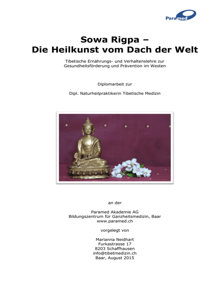 Sowa Rigpa – Die Heilkunst vom Dach der Welt Tibetische Ernährungs- und Verhaltenslehre zur Gesundheitsförderung und Prävention im Westen Diplomarbeit zur Dipl. Naturheilpraktikerin Tibetische Medizin an der Paramed Akademie AG Bildungszentrum für Ganzheitsmedizin, Baar www.paramed.ch vorgelegt von Marianna Neidhart Furkastrasse 17 8203 Schaffhausen [email protected] Baar, August 2015 Sowa Rigpa – Die Heilkunst vom Dach der Welt Eigenständigkeitserklärung Hiermit bestätige ich, die vorliegende Arbeit selbstständig unter Nutzung keiner anderen als der angegebenen Hilfsmittel verfasst zu haben. _____________________________ Schaffhausen, August 2015 Autorin: Fachexpertin: Marianna Neidhart Brigitte Ingold, Fachbereichsleiterin Lehrgang TIBMED Copyright Diplomarbeit Paramed Diese Diplomarbeit ist als Abschluss der Ausbildung zum Dipl. Naturheilpraktiker/in Tibetische Medizin persönlich verfasst. Veröffentlicht im September 2015. Das Recht, diese Diplomarbeit zu kopieren, auf das Netz zu setzen, liegt bei der Verfasserin und der Paramed. Ein gedrucktes Exemplar liegt zur Ansicht in der Bibliothek der Paramed auf. Veröffentlichung: Eine Veröffentlichung oder jegliche Verwendung von Inhalten bedarf einer schriftlichen Einverständniserklärung der Autorin. Alle gewählten Bezeichnungen gelten sinngemäss für beide Geschlechter. Marianna Neidhart Seite 2 von 57 Sowa Rigpa – Die Heilkunst vom Dach der Welt Inhaltsverzeichnis Eigenständigkeitserklärung .................................................................................. 2 1. Zusammenfassung ........................................................................................ 5 2. Einleitung ..................................................................................................... 5 2.1. Einführung in die tibetische Medizin ............................................................. 5 2.1.1. Grundlagen der tibetischen Medizin .......................................................... 5 2.1.2. Herzstück der tibetischen Medizin ............................................................. 6 2.1.3. Ursache aller Krankheiten aus tibetischer Sicht .......................................... 7 2.1.4. Haupttext der medizinischen Überlieferung: Das rGyud-bzhi ........................ 7 2.2. Fragestellung und Hypothese ...................................................................... 8 2.3. Zielsetzung ............................................................................................... 8 2.4. Begründung .............................................................................................. 8 2.5. Eingrenzung ............................................................................................. 9 2.6. Methodik .................................................................................................. 9 2.7. Erklärung des Ablaufs ................................................................................ 9 3. Tib. Ernährungs- und Verhaltenslehre zur Gesundheitsförderung und Prävention ..10 3.1. Einführung ..............................................................................................10 3.2. Die individuelle Konstitution: Basis für die Therapie ......................................11 3.3. Tibetische Ernährungslehre ........................................................................12 3.3.1. Allgemeine Empfehlungen zur Ernährung .................................................12 3.3.2. Die Verdauungshitze: Voraussetzung für ein gesundes und langes Leben .....13 3.3.3. Geschmacksrichtungen und ihre heilende Wirkung ....................................14 3.3.4. Wirkungsweise von Nahrungsmitteln........................................................16 3.3.5. Unverträgliche Kombinationen von Nahrungsmitteln ..................................19 3.4. Tibetische Verhaltenslehre .........................................................................19 3.4.1. Allgemeine Verhaltensregeln ...................................................................20 3.4.2. Verhalten gemäss der individuellen Konstitution ........................................20 3.4.3. Lu Jong – Tibetisches Heilyoga nach Tulku Lobsang ...................................21 3.4.4. Wirkungsweise von Lu Jong ....................................................................21 3.4.5. Lu-Jong-Übungen und ihre spezifischen Wirkungen....................................22 3.5. 4. Gesundheit aus tibetischer Sicht ................................................................23 Ergebnis .....................................................................................................24 4.1. Gegenüberstellung: Tibetische Medizin – Westliche Medizin ...........................24 4.2. Therapieansatz gemäss der individuellen Konstitution ...................................25 5. Diskussion ...................................................................................................29 5.1. Interpretation der Ergebnisse ....................................................................29 5.2. Bezugnahme auf die Fragestellung / Hypothese ...........................................30 5.2.1. Adaption an den Westen ........................................................................30 5.2.2. Compliance ..........................................................................................31 Marianna Neidhart Seite 3 von 57 Sowa Rigpa – Die Heilkunst vom Dach der Welt 5.2.3. Gesunde westliche Ernährung aus tibetischer Sicht ....................................32 5.2.4. Beantwortung der Frage / Begründung der Hypothese ...............................34 5.3. Reflexion zur Zielerreichung ......................................................................35 5.4. Schlussfolgerung ......................................................................................35 Literatur- und Quellenverzeichnis ...........................................................
