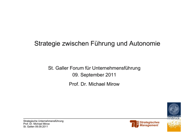 Strategie zwischen Führung und Autonomie St. Galler Forum für Unternehmensführung 09. September 2011 Prof. Dr. Michael Mirow Strategische Unternehmensführung Prof. Dr. Michael Mirow St. Gallen 09.09.2011 Strategisches Management Macht und ihre Grenzen • Die Theorie: • Der Vorstand/Geschäftsführung hat die Macht der Exekutive. Er ist verantwortlich für die Strategie des Unternehmens und ihre Durchsetzung. Ein Teil der Macht wird über ein hierarchisches System an untergeordnete Einheiten (Divisionen, Bereiche, Abteilungen) delegiert, Ziele werden vereinbart. Die Untereinheiten sind gegenüber ihrer jeweils übergeordneten Einheit verantwortlich für das Erreichen der Ziele – im Rahmen der verabredeten Strategien. • • • Die tägliche Praxis... • • • Kaum verabredet werden Strategien der Unternehmensleitung infrage gestellt, erneut diskutiert und – zerredet. Handlungsanweisungen (sofern nicht „hoheitlich“) werden eher als unverbindliche Meinungsäußerungen angesehen oder gar als „Störung“ abgewehrt.. Delegation, Autonomie oder Dezentralisierung bestimmen das Verhalten erfolgreicher Unternehmen. Prof. Dr. Michael Mirow HSG-Forum St. Gallen 09.09.2011 -2- Strategisches Management Einige Fragen...: • Wie viel Macht (der Exekutive) verträgt ein Unternehmen? • Wo liegt die Grenze zwischen Unführbarkeit und gesunder Selbstorganisation? • Was kann/muss eine Unternehmensleitung tun, um die Umsetzung beschlossener Strategien sicherzustellen? • Was bedeutet Macht in komplexen Unternehmensnetzwerken und wie können dort Strategien umgesetzt werden? Prof. Dr. Michael Mirow HSG-Forum St. Gallen 09.09.2011 -3- Strategisches Management Die Sicht der Systemtheorie/Kybernetik Macht im Unternehmen: • Fähigkeit, die Ziele der Unternehmensleitung und die erforderlichen Maßnahmen auf allen Ebenen durchzusetzen. Systemtheorie (Kybernetik): • Wie kann eine Organisation als zielgerichtetes System ihre Ziele in einer hochkomplexen und ständigen Änderungen unterworfenen Umwelt verfolgen und erreichen? • Es geht letztlich um den Umgang mit Komplexität. (Norbert Wiener 1948: Cybernetics: Communication and Control in the Animal and the Machine) Prof. Dr. Michael Mirow HSG-Forum St. Gallen 09.09.2011 -4- Strategisches Management Mehrere Einflussfaktoren treiben die Komplexität Technischer Fortschritt Globalisierung Wettberbsdruck Globale Information Komplexität Weltweite Arbeitsteilung Soziopolitische Entwicklung Differenzierung der Kundenwünsche Aufbrechen von Wertschöpfungsketten Prof. Dr. Michael Mirow HSG-Forum St. Gallen 09.09.2011 Strategisches Management Ein wenig Theorie... : • Komplexität: • Umweltkomplexität (extern): Wachstum, Größenwettbewerb, Globalisierung, Innovation, Zeitwettbewerb,... • Systemkomplexität (intern): getrieben durch Umwelt, Größe, Ausdifferenzierung, Globalisierung, beschleunigte Innovationszyklen, Realisierung von Synergien,... • Abwehr durch Abschirmung: • • • Schildkröten, Festungen, Finanzpolster, Patente, Kartelle oder auch – mentale Sperren. Normen, Gesetze, Richtlinien, Tarifverträge. Das Problem: Trägheit, Blockade von Innovation und Anpassung. Komplexität muss aktiv bewältigt werden Prof. Dr. Michael Mirow HSG-Forum St. Gallen 09.09.2011 -6- Strategisches Management Das Gesetz der Schwerkraft der Systemtheorie: Ashby‘s „Law of Requisite Variety“ Only Variety can destroy Variety“ (W. Ross Ashby 1956): Die Vielfalt der möglichen Verhaltensweisen einer Organisation muss mindestens der Vielfalt der auf sie einwirkenden Störungen (von innen oder außen) entsprechen. Keep it simple and stupid? („KISS“) Keep it simple but Intelligent! („KISI“) Komplexität kann man nur mit Komplexität begegnen Prof. Dr. Michael Mirow HSG-Forum St. Gallen 09.09.2011 Strategisches Management Komplexe Organisationen brauchen ein hierarchisches Systeme von Regelkreisen und koordinierende Stäbe Organisationen müssen als Regelkreissysteme konzipiert werden (Zielvorgabe, Kontrolle, Nachregelung) Die Regelungskapazität eines Regelkreises muss „Ashby‘s Law “ genügen Ein hierarchisches System von Regelkreisen kann ein hohes Maß an Komplexität bewältigen Stäbe übernehmen die Koordination der Geschäftseinheiten, übergreifende Dienstleistungen werden angeboten und ein zentrales Regelwerk sichert den Zusammenhalt Es gibt keine „hierarchiefreien Räume“ in komplexen Unternehmen Prof. Dr. Michael Mirow HSG-Forum St. Gallen 09.09.2011 Strategisches Management Führungssysteme müssen Regeln setzen, aber auch Freiheit/Autonomie zu lassen Es wird immer ein Komplexitätsgefälle zwischen Umwelt und Unternehmen geben Auf Unvorhergesehenes muss unvorhersehbar reagiert werden – Unternehmen brauchen Handlungsfreiheit auf allen Ebenen Handlungsfreiheit zu geben, bedeutet Autonomie zu verleihen Autonomie führt zwangsläufig auch zu einer eigenen Deutung der „Welt“ und damit zu „Eigensinn“ Zentrale Führung wird als „Störung“ empfunden und systemspezifisch abgewehrt Prof. Dr. Michael Mirow HSG-Forum St. Gallen 09.09.2011 Die Balance zwischen Freiheit und Chaos, zwischen Regelung und Bürokratie muss immer wieder neu gefunden werden. Strategisches Management Die Führung komplexer Systeme als Balanceakt Wie viel Freiheit verträgt eine Organisation? „Zuviel“ destabilisiert „Zuwenig“ Schränkt nach innen Spielraum ein zerstört Identität Unternehmen nach außen. erstarren Chaos Immobilität Aufgaben der Unternehmensleitung Das Selbstverständnis autonomer Einheiten durch Führung und Machtausübung in geordnete Bahnen lenken Gemeinsamen Verständnis für Leitenden Gedanken und Strategie Anreize schaffen, die den Eigennutz des Einzelnen für das Wohl des Ganzen nutzen Freiheit muss gegeben und gleichzeitig gebändigt werden Prof. Dr. Michael Mirow HSG-Forum St. Gallen 09.09.2011 Strategisches Management Leitender Gedanke des Unternehmens Der leitende Gedanke beantwortet die Kernfra