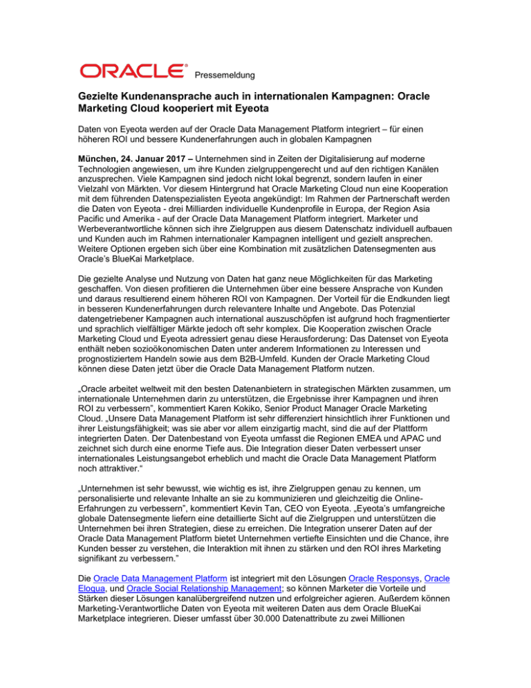Pressemeldung Gezielte Kundenansprache auch in internationalen Kampagnen: Oracle Marketing Cloud kooperiert mit Eyeota Daten von Eyeota werden auf der Oracle Data Management Platform integriert – für einen höheren ROI und bessere Kundenerfahrungen auch in globalen Kampagnen München, 24. Januar 2017 – Unternehmen sind in Zeiten der Digitalisierung auf moderne Technologien angewiesen, um ihre Kunden zielgruppengerecht und auf den richtigen Kanälen anzusprechen. Viele Kampagnen sind jedoch nicht lokal begrenzt, sondern laufen in einer Vielzahl von Märkten. Vor diesem Hintergrund hat Oracle Marketing Cloud nun eine Kooperation mit dem führenden Datenspezialisten Eyeota angekündigt: Im Rahmen der Partnerschaft werden die Daten von Eyeota - drei Milliarden individuelle Kundenprofile in Europa, der Region Asia Pacific und Amerika - auf der Oracle Data Management Platform integriert. Marketer und Werbeverantwortliche können sich ihre Zielgruppen aus diesem Datenschatz individuell aufbauen und Kunden auch im Rahmen internationaler Kampagnen intelligent und gezielt ansprechen. Weitere Optionen ergeben sich über eine Kombination mit zusätzlichen Datensegmenten aus Oracle’s BlueKai Marketplace. Die gezielte Analyse und Nutzung von Daten hat ganz neue Möglichkeiten für das Marketing geschaffen. Von diesen profitieren die Unternehmen über eine bessere Ansprache von Kunden und daraus resultierend einem höheren ROI von Kampagnen. Der Vorteil für die Endkunden liegt in besseren Kundenerfahrungen durch relevantere Inhalte und Angebote. Das Potenzial datengetriebener Kampagnen auch international auszuschöpfen ist aufgrund hoch fragmentierter und sprachlich vielfältiger Märkte jedoch oft sehr komplex. Die Kooperation zwischen Oracle Marketing Cloud und Eyeota adressiert genau diese Herausforderung: Das Datenset von Eyeota enthält neben sozioökonomischen Daten unter anderem Informationen zu Interessen und prognostiziertem Handeln sowie aus dem B2B-Umfeld. Kunden der Oracle Marketing Cloud können diese Daten jetzt über die Oracle Data Management Platform nutzen. „Oracle arbeitet weltweit mit den besten Datenanbietern in strategischen Märkten zusammen, um internationale Unternehmen darin zu unterstützen, die Ergebnisse ihrer Kampagnen und ihren ROI zu verbessern”, kommentiert Karen Kokiko, Senior Product Manager Oracle Marketing Cloud. „Unsere Data Management Platform ist sehr differenziert hinsichtlich ihrer Funktionen und ihrer Leistungsfähigkeit; was sie aber vor allem einzigartig macht, sind die auf der Plattform integrierten Daten. Der Datenbestand von Eyeota umfasst die Regionen EMEA und APAC und zeichnet sich durch eine enorme Tiefe aus. Die Integration dieser Daten verbessert unser internationales Leistungsangebot erheblich und macht die Oracle Data Management Platform noch attraktiver.“ „Unternehmen ist sehr bewusst, wie wichtig es ist, ihre Zielgruppen genau zu kennen, um personalisierte und relevante Inhalte an sie zu kommunizieren und gleichzeitig die OnlineErfahrungen zu verbessern”, kommentiert Kevin Tan, CEO von Eyeota. „Eyeota’s umfangreiche globale Datensegmente liefern eine detaillierte Sicht auf die Zielgruppen und unterstützen die Unternehmen bei ihren Strategien, diese zu erreichen. Die Integration unserer Daten auf der Oracle Data Management Platform bietet Unternehmen vertiefte Einsichten und die Chance, ihre Kunden besser zu verstehen, die Interaktion mit ihnen zu stärken und den ROI ihres Marketing signifikant zu verbessern.” Die Oracle Data Management Platform ist integriert mit den Lösungen Oracle Responsys, Oracle Eloqua, und Oracle Social Relationship Management; so können Marketer die Vorteile und Stärken dieser Lösungen kanalübergreifend nutzen und erfolgreicher agieren. Außerdem können Marketing-Verantwortliche Daten von Eyeota mit weiteren Daten aus dem Oracle BlueKai Marketplace integrieren. Dieser umfasst über 30.000 Datenattribute zu zwei Millionen Kundenprofilen von 1.500 Datenpartnern. Die Oracle Marketing Cloud ist Teil der Oracle Customer Experience (CX) Cloud, einer der umfassendsten CX-Lösungen der Branche. Mit der Oracle CX Cloud können Unternehmen konsistente, vernetzte und personalisierte Markenerfahrungen über alle Kanäle und Geräte hinweg schaffen. Der Vorteil: Sie optimieren ihre Kundenerfahrungen, stärken die Loyalität mit dem eigenen Unternehmen, differenzieren ihre Marken vom Wettbewerb und erzielen messbare Resultate. Über Eyeota Eyeota ist ein international führender Anbieter für Publikumsdaten; sein Bestand umfasst drei Milliarden individuelle Profile in Europa, Asia/Pacific und Amerika. Mit diesen Daten versetzt Eyeota Marketer in die Lage, die richtigen Online-Zielgruppen anzusprechen und Streuverluste zu vermeiden. Gleichzeitig können auch Publisher auf diese Weise ihren Zielgruppen bessere Angebote machen und werden dadurch profitabler. Eyeota ist zertifiziertes Mitglied der Network Advertising Initiative (NAI), der führenden selbst-regulierenden Association, die sich für ein verantwortliches Sammeln von Daten und deren Nutzung für digitale Werbung engagiert. Außerdem verfügt das Unternehmen über verschiedene internationale Zertifikate zum Verbraucherdatenschutz. Weitere Informationen: http://www.eyeota.com/. About Oracle Oracle offers a comprehensive and fully integrated stack of cloud applications and platform services. For more information about Oracle (NYSE:ORCL), visit www.oracle.com. Trademarks Oracle and Java are registered trademarks of Oracle and/or its affiliates. Other names may be trademarks of their respective owners. Ansprechpartner Oracle Presseservice Claudia Wittwer/Volker Schmidt Burson Marsteller +49 89 17 959 1884 [email protected]