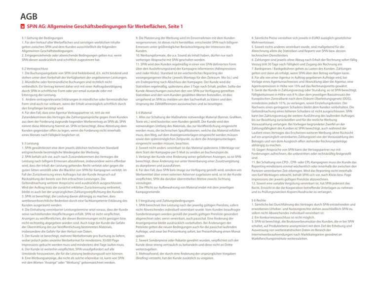 AGB SPiN AG: Allgemeine Geschäftsbedingungen für Werbeflächen, Seite 1 § 1 Geltung der Bedingungen 1. Für den Verkauf aller Werbeflächen und sonstigen werblichen Inhalte gelten zwischen SPiN und dem Kunden ausschließlich die folgenden Allgemeinen Geschäftsbedingungen. 2. Entgegenstehende oder abweichende Bedingungen gelten nur, wenn SPiN diesen ausdrücklich und schriftlich zugestimmt hat. § 2 Vertragsschluss 1. Die Buchungsangebote von SPIN sind freibleibend, d.h. nicht bindend und stehen unter dem Vorbehalt der Verfügbarkeit der angebotenen Leistungen. 2. Mündliche oder fernmündliche Buchungen sind rechtlich nicht verbindlich. Ein Vertrag kommt daher erst mit einer Auftragsbestätigung durch SPIN in schriftlicher Form oder per email zustande oder mit Erbringung der Leistung. 3. Andere vertragsrelevante Erklärungen in mündlicher oder fernmündlicher Form sind auch nur wirksam, wenn der Erhalt unverzüglich schriftlich durch den Empfänger bestätigt wird. 4. Für den Fall, dass eine Agentur Vertragspartner ist, tritt sie mit Zutandekommen des Vertrages die Zahlungsansprüche gegen ihren Kunden aus dem der Forderung zugrunde liegenden Werbevertrag an SPiN ab. SPiN nimmt diese Abtretung hiermit an. SPiN ist berechtigt, diese Abtretung dem Kunden gegenüber offen zu legen, wenn die Forderung nicht innerhalb eines Monats nach Fälligkeit beglichen ist. § 3 Leistung 1. SPiN gewährleistet eine dem jeweils üblichen technischen Standard entsprechende bestmögliche Wiedergabe der Werbung. 2. SPiN behält sich vor, auch nach Zustandekommen des Vertrages die Leistung nach billigem Ermessen abzulehnen, insbesondere wenn offenbar wird, dass der Inhalt der Leistung geltendes Recht verletzt oder gegen die guten Sitten verstößt oder die Blacklist von SPIN für Kampagnen verletzt. Im Fall der Zurückweisung eines Auftrages hat der Kunde Anspruch auf Rückzahlung der bereits von ihm erbrachten Leistungen. Die Geltendmachung weiterer Ansprüche wird ausdrücklich ausgeschlossen. Wird der Auftrag trotz der zunächst erklärten Zurückweisung verbreitet, bleibt es auch bei der ursprünglichen Zahlungsverpflichtung des Kunden. 3. SPiN ist berechtigt, die Leistung davon abhängig zu machen, dass wettbewerbsrechtliche Bedenken durch eine fachkompetente Erklärung des Kunden ausgeräumt werden. 4. Die Einhaltung vereinbarter Leistungstermine setzt voraus, dass der Kunde seine nachstehenden Verpflichtungen erfüllt. SPiN ist nicht verpflichtet, Anzeigen zu veröffentlichen, die diesen Bestimmungen nicht genügen bzw. nicht rechtzeitig abgegeben worden sind. Auch trägt der Kunde die Gefahr der Übermittlung des zur Veröffentlichung bestimmten Materials, insbesondere die Gefahr für den Verlust von Daten. 5. Der Kunde ist berechtigt, mehrere Werbeformate pro Buchung zu liefern, wobei jedoch jedes einzelne Werbeformat für mindestens 30.000 Page Impressions gebucht werden muss und mindestens drei Tage laufen muss. 6. Der Kunde ist weiterhin verpflichtet, SPiN unaufgefordert auf alle Umstände hinzuweisen, die für die Leistung bedeutungsvoll sein können. 8. Eine Werbungsanzeige, die nicht als solche erkennbar ist, kann von SPiN mit den Worten "Anzeige" oder "Werbung" gekennzeichnet werden. 9. Die Platzierung der Werbung wird im Einvernehmen mit dem Kunden vorgenommen. Ist dieses nicht herstellbar, entscheidet SPiN nach billigem Ermessen unter größtmöglicher Berücksichtigung der Interessen des Kunden. 10. Werbungsformate, die u.a. Sound als Inhalt haben, dürfen nur nach vorheriger Absprache mit SPiN geschaltet werden. 11. SPiN wird den Kunden regelmäßig in einer von SPiN definierten Form über den Auslieferungsstand der Kampagne informieren (AdImpressions und /oder Klicks). Standard ist ein wöchentliches Reporting der vorangegangenen Woche (jeweils Montags für den Zeitraum Mo-So.) und ein Endreporting nach Abschluss der Kampagne. Der Kunde wird die Statistiken regelmäßig, spätestens aber 3 Tage nach Erhalt, prüfen. Sollte der Kunde Abweichungen zwischen den von SPiN zur Verfügung gestellten Statistiken und den vom Kunden gezählten Werten feststellen, ist dies umgehend an SPiN zu melden um den Sachverhalt zu klären und den Ursprung der Zähldifferenzen auszumachen und zu beseitigen. § 4 Material 1. Alles zur Schaltung der Maßnahme notwendige Material (Banner, Grafiken, Texte etc.) wird kostenlos vom Kunden gestellt. Der Kunde wird den notwendigen Umfang des Materials, das zur Veröffentlichung eingereicht werden muss, die technischen Spezifikationen, welche das Material erfüllen muss, den Weg, auf dem Anzeigenunterlagen eingereicht werden müssen sowie den spätestmöglichen Zeitpunkt, zu dem die Anzeigenunterlagen eingereicht werden müssen, beachten. 2. Soweit nicht anders vereinbart ist das Material spätestens 3 Werktage vor dem Start der Kampagne per E-Mail zu senden an [email protected]. 3. Verlangt der Kunde eine Änderung seiner gelieferten Anzeigen, so ist SPiN berechtigt, diese Änderung nur unter Vereinbarung einer Zusatzvergütung zu akzeptieren und auszuführen. 4. Für den Fall, dass SPiN kein Image zur Verfügung gestellt wird, sondern ein Werbemittel über einen externen Adserver zugelassen wird, so ist der Kunde verpflichtet, SPiN die darüber übermittelten Motive zwecks Sichtung vorzulegen. 5. Die Pflicht zur Aufbewahrung von Material endet mit dem jeweiligen Kampagnenende. § 5 Vergütung und Zahlungsbedingungen 1. SPiN berechnet ihre Leistung nach der jeweilig gültigen Preisliste, sofern nicht Abweichendes individuell vereinbart wurde. Vom Kunden beauftragte Sonderleistungen werden gemäß der jeweils gültigen Preisliste gesondert abgerechnet oder, wenn vereinbart, auch pauschal. Eine Änderung der Anzeigenpreise bleibt ausdrücklich vorbehalten. Bei Änderungen der Preisliste gelten die neuen Bedingungen auch für die pauschal laufenden Aufträge, und zwar bei Preissenkung sofort, bei Preiserhöhung einen Monat später. 2. Soweit Sonderpreise oder Rabat