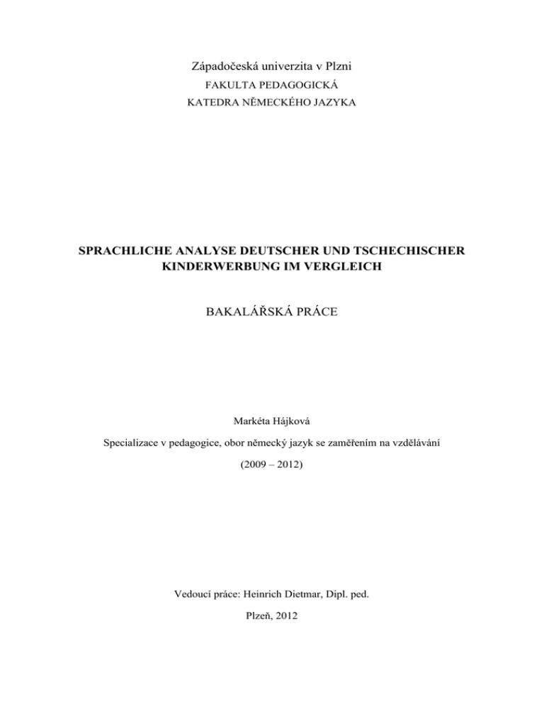 Západočeská univerzita v Plzni FAKULTA PEDAGOGICKÁ KATEDRA NĚMECKÉHO JAZYKA SPRACHLICHE ANALYSE DEUTSCHER UND TSCHECHISCHER KINDERWERBUNG IM VERGLEICH BAKALÁŘSKÁ PRÁCE Markéta Hájková Specializace v pedagogice, obor německý jazyk se zaměřením na vzdělávání (2009 – 2012) Vedoucí práce: Heinrich Dietmar, Dipl. ped. Plzeň, 2012 Čestně prohlašuji, že jsem tuto bakalářskou práci vypracovala samostatně s použitím uvedené literatury a zdrojů informací. Plzeň, 26.6.2012 Vlastnoruční podpis Ich möchte mich beim Herrn Dietmar Heinrich, Dip. ped. herzlich bedanken - für sein Entgegenkommen, geduldige Unterstützen beim Schreiben dieser Arbeit und für seine wissenschaftliche Betreuung. Abkürzungen ggf. gegebenenfalls vgl. Vergleich jmdn. jemanden od. oder jmds. jemandes z.B. zum Beispiel zit. n. zitiert nach d.h. das heißt usw. und so weiter Bsp. Beispiel u.a. und andere Inhaltsverzeichnis 1. EINLEITUNG .............................................................................................................. 8 2. THEORETISCHER TEIL.......................................................................................... 10 2.1. Einführung in den Begriff Werbung .......................................................................... 10 2.1.1. Definition der Werbung ............................................................................................. 10 2.1.2. Bausteine der Werbung .............................................................................................. 11 2.1.3. Ziele der Werbung...................................................................................................... 15 2.1.4. Werbemittel und Werbeträger .................................................................................... 15 2.1.5. Arten der Werbung ..................................................................................................... 16 2.1.5.1. Fernsehwerbung ......................................................................................................... 16 2.1.5.2. Gedruckte Werbung ................................................................................................... 17 2.1.5.3. Rundfunkwerbung ...................................................................................................... 17 2.1.5.4. Internetwerbung ......................................................................................................... 18 2.1.6. Zielgruppe Kind ......................................................................................................... 18 2.2. Kurze Geschichte der Werbung ................................................................................. 21 2.3. Sprache in der Werbung ............................................................................................. 22 2.3.1. Lexikalische Mittel..................................................................................................... 22 2.3.1.1. Wortschatz.................................................................................................................. 22 2.3.1.2. Wortarten.................................................................................................................... 22 2.3.1.3. Modewörter und Neologismen................................................................................... 25 2.3.2. Syntaktische Mittel .................................................................................................... 25 2.3.3. Stilistische Mittel ....................................................................................................... 26 2.3.3.1. Rhetorische Figuren ................................................................................................... 26 2.3.3.2. Tropen ........................................................................................................................ 31 3. PRAKTISCHER TEIL – ANALYSE ........................................................................ 34 4. ZUSAMMENFASENDE ANALYSE DER DEUTSCHEN UND TSCHECHISCHEN KINDERWERBUNGEN ......................................................... 84 5. SCHLUSSBEMERKUNG ......................................................................................... 88 6. RESUMÉ ................................................................................................................... 90 7. LITERATURVERZEICHNIS ................................................................................... 91 8. INTERNETQUELLEN .............................................................................................. 92 1. EINLEITUNG Die vorliegende Arbeit trägt den Namen „Sprachliche Analyse deutscher und tschechischer Kinderwerbung im Vergleich“. Das Thema wurde aufgrund seiner ständigen Präsenz und des sprachlichen Reichtums der Werbetexte aufgegriffen. Außerdem ist die Werbesprache, durch die ununterbrochene Entwicklung der Massenmedien ein aktuelles Thema. Das Ziel dieser Bachelorarbeit ist, ausgewählte deutsche und tschechische Fernsehwerbungen zu untersuchen, um festzustellen, ob dieselben sprachlichen Mittel verwendet werden - d.h. sie zu vergleichen und die gewonnenen Ergebnisse auszuwerten. Eines der Kriterien für die Wahl der Werbungen war die Gleichheit der deutschen und tschechischen Werbespots. Alle zu analysierenden Fernsehwerbungen spezialisieren sich auf die Zielgruppe Kind und werden aus drei Perspektiven untersucht, aus der lexikalischen, der syntaktischen und der stilistischen. Die Arbeit ist in zwei Teile gegliedert, den theoretischen und den praktischen. Der theoretische Teil befasst sich erstens mit der „Einführung in den Begriff Werbung“. Es wird auf die Definition, die Bausteine und die Ziele der Werbung hingewiesen. Unter anderem wird auch der Unterschied zwischen Werbemitteln und -trägern erklärt. Es werden die vier aktuellen Werbearten unserer Zeit vorgestellt und die Zielgruppe Kind näher beschrieben, diese spielt in meiner A