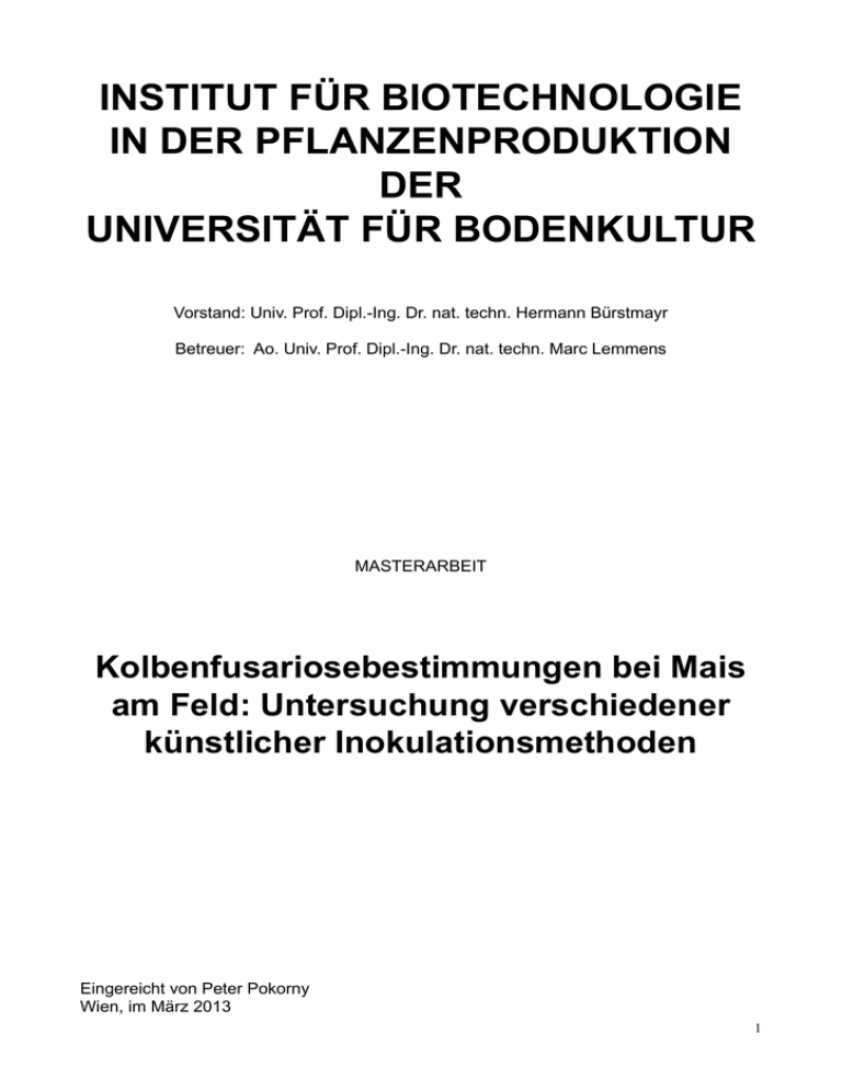 INSTITUT FÜR BIOTECHNOLOGIE IN DER PFLANZENPRODUKTION DER UNIVERSITÄT FÜR BODENKULTUR Vorstand: Univ. Prof. Dipl.-Ing. Dr. nat. techn. Hermann Bürstmayr Betreuer: Ao. Univ. Prof. Dipl.-Ing. Dr. nat. techn. Marc Lemmens MASTERARBEIT Kolbenfusariosebestimmungen bei Mais am Feld: Untersuchung verschiedener künstlicher Inokulationsmethoden Eingereicht von Peter Pokorny Wien, im März 2013 1 DANKSAGUNGEN An erster Stelle bedanke ich mich bei meinem Betreuer, Herrn Prof. Dr. Marc Lemmens, der mein Interesse der mein Interesse an der Erforschung der Resistenzmechanismen von Fusarium spp. geweckt hat und auch ermöglichte, dass ich mich mit einem so interessanten Thema auseinandersetzen konnte und auch stets eine Antwort auf meine Fragen parat hatte, mir bei den vielen Stunden am Feld zur Seite stand und auch nie den Überblick für das Wesentliche verloren hat. Weiters bedanke ich mich auch beim gesamten IFA Team der Biotechnologie in der Pflanzenproduktion für ihre Unterstützung. Des weiteren bedanke ich mich noch von ganzem Herzen bei meinen Eltern, die mir meine Ausbildung ermöglichten und mir den finanziellen und geistigen Rückhalt geboten haben, der für einen erfolgreichen Abschluss eines Studiums notwendig ist. Schließlich richtet sich mein Dank auch noch an meine Großeltern, die mich während meines gesamten Studiums freundlicherweise bei sich wohnen ließen, sodass ich mich nicht um eine Unterkunft zu sorgen hatte, und mir auch mit Rat und Tat während des gesamten Studiums beiseite standen. 2 Einleitung, Problemstellung, Ziele der Arbeit und experimentelle Vorgangsweise!..........................................................................................6 Einleitung und Problemstellung!.............................................................................6 Ziele der Arbeit!.........................................................................................................7 Experimentelle Vorgangsweise!..............................................................................7 Literatur!......................................................................................................7 Die Gattung Fusarium!.............................................................................................7 Krankheitsbild und Symptome!...............................................................................8 Negative Effekte durch Kolbenfusariose! ..............................................................9 Zyklus der Krankheit!.............................................................................................10 Umweltabhängigkeit der Krankheit!......................................................................11 Kontrolle von Kolbenfusariose!............................................................................12 Resistenzmechanismen der Maispflanze!............................................................12 Inokulationsmethoden und Resistenzkomponenten!.........................................13 Molekulare Genetik und QTL-Mapping!................................................................15 QTL-Mapping für Resistenz gegen Gibberellafäule!...........................................15 QTL-Mapping für Resistenz gegen Fusariumfäule!.............................................15 Zusammenhang zwischen QTL für Resistenz gegen Fusariumfäule, gegen andere Kolbenfäulen und ackerbaulichen Eigenschaften!.................................16 Molekulargenetik von Gibberella-Kolbenfäule und Mykotoxinanreicherung!..16 Molekulargenetik von Fusarium-Kolbenfäule und Mykotoxinanreicherung!....16 Verwendung der QTL-Kartierung in der praktischen Züchtung!........................17 Aspekte der Pflanzenzucht!...................................................................................17 Material und Methoden!...........................................................................19 Maishybriden!..........................................................................................................19 Versuchsaufbau für die Resistenzuntersuchung mit künstlicher Inokulation!19 Versuchsaufbau für die Untersuchung der natürlichen Infektion!.....................20 Herstellung und Eigenschaften der Isolate!.........................................................20 3 Inokulationsmethoden!..........................................................................................21 Bonituren der Krankheit!........................................................................................21 Statistische Datenverarbeitung!............................................................................23 Ergebnisse!...............................................................................................23 Injektion in den Seidenkanal!................................................................................24 Zahnstochermethode!............................................................................................27 Natürliche Infektion!...............................................................................................30 Korrelationsanalysen!..............................................................................32 Vergleichbarkeit der Wirkung der Resistenzmechanismen gegen verschiedene Fusariumarten!................................................................................32 Korrelation des Gesamtbefalls nach Injektion von F. graminearum und F. verticillioides!..........................................................................................................32 Korrelation des Gesamtbefalls nach mechanischer Verletzung von F. culmorum und F. verticillioides!............................................................................33 Vergleichbarkeit verschiedener Inokulationstechniken!.....................................33 Korrelation des Gesamtbefalls nach mechanischer Verletzung und nach Injektion in den Seidenkanal!................................................................