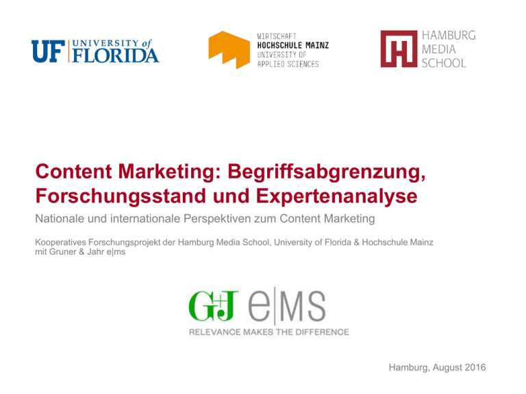 Content Marketing: Begriffsabgrenzung, Forschungsstand und Expertenanalyse Nationale und internationale Perspektiven zum Content Marketing Kooperatives Forschungsprojekt der Hamburg Media School, University of Florida & Hochschule Mainz mit Gruner & Jahr e|ms Hamburg, August 2016 1 Zielsetzung, Methodik und Studiendesign Ziele der Studie Trotz der zunehmenden wirtschaftlichen Bedeutung von Content Marketing werden Begrifflichkeiten und anlehnende Konzepte von den zugehörigen Akteuren noch sehr uneinheitlich verwendet. G+J e|MS und die Hamburg Media School haben sich dem Forschungsbedarf hinsichtlich dieser Thematik angenommen und dabei folgende Ziele erreicht: Eine theoretische Fundierung zur einheitlichen Verwendung von relevanten Begrifflichkeiten geschaffen Die Strukturen und Wertschöpfungskette des CM-Marktes analysiert Wichtige Entwicklungen im internationalen Kontext identifiziert, die zukünftig auch in Deutschland relevant werden können Die Studie beinhaltet einen literaturbasierten und einen empirischen Part: Studiendesign / Methodik 2 Literaturanalyse: Ziel war es, den State of the Art zu ermitteln Aus über 400 gelesenen Artikeln wurden 60 relevante Artikel identifiziert und analysiert Qualitative Experteninterviews (leitfadengestützt): Befragung von 24 deutschen/internationalen Experten zur Generierung neuer Erkenntnisse Experten wurden aus Theorie und Praxis entlang der gesamten Wertschöpfungskette des CM selektiert Forschungsstand Definition und die strategische Bedeutung des Content Marketings (Konzepte) Konzepte Was ist Content Marketing? Content Marketing ist das Erzählen von Geschichten anstelle von Werbebotschaften Dient dazu, Aufmerksamkeit der Zielgruppe zu erlangen und potentielle Konsumenten abzuholen Mehrwert für die Zielgruppe steht dabei im Fokus Ist eine Möglichkeit, Unternehmenskompetenzen und -ressourcen nutzbarer zu machen (Leads) Beziehung zu Konzepten Content Marketing und Native Advertising sind miteinander verwandt Gutes Content Marketing benötigt Storytelling Branded Entertainment ist eine Art von Content Marketing Content Marketing dient als Tool für Inbound Marketing Durch Content Marketing kann die Beziehung zum Rezipienten gestärkt werden Präsenz und Relevanz Hohe Präsenz, gerade in der digitalen Branche, da Rezipienten klassische Werbung kaum noch akzeptieren Technologien und Medienentwicklung bieten Marken die Möglichkeit selbst zum Publisher zu werden Wandel durch Content Marketing von Bezug auf Produkt zum Endkunden Kernziel von CM: Den Rezipienten informativ und unterhaltsam über alle Kanäle erreichen 3 Quelle: Josche, Tanja; von Hirschfeld, Sascha Tobias. (2016). Lean Content Marketing: Wenn das Publikum mitmischt Dr. Nirmalarajah, Asokan. (2016) Content Marketing generiert nachhaltig profitablen Online-Umsatz. Hilker Consulting. Whitepaper Content-Marketing Übersicht Begriffsabgrenzung Zusammenfassung der deutschen Expertenaussagen über die Beziehungen der Konzepte Storytelling Product Placement Native Advertising Content Marketing Branded Entertainment 4 • • • Inbound Marketing Corporate Publishing Anm.: N=15 Je größer die Überschneidungsmenge, desto mehr Experten sahen einen großen Zusammenhang zwischen den jeweiligen Begriffen und 'Content Marketing'. Es wurden nur die Beziehungen zwischen den jeweiligen Begriffen gegenüber ‚Content Marketing‘ berücksichtigt, nicht die Beziehungen untereinander Content Marketing Best Cases – Commercials Leitfadenfrage: Was sind positive Beispiele? Volvo – Epic Split 83.500.000 Views „Dann ganz klar, alles was Volvo gemacht hat rund um ihre LKW und Trucks. Klar, das Jean-Claude van Damme-Thema, wobei das ja nur eine Facette davon war, die haben ja noch viele, viele andere Dinge gemacht, rund um diese LKW und die Fähigkeiten, die die LKW eben haben. Das haben sie eben sehr unterhaltsam gemacht, sicherlich am herausragendsten über das Jean-Claude van Damme-Beispiel.“ (PD_5) Webmeeting 13.000.000 Views 5 „Ein YouTube-Video: Da geht es um Webmeeting in Real Life. Und zwar wird dort in dem Video dargestellt, innerhalb eines Konferenzraums, wie es aussehen würde, wenn dieses Webmeeting in diesem Raum mit echten Menschen passieren würde. […] Extrem witzig. […] Und am Ende der ganzen Geschichte wird eine Webmeeting-Lösung vorgeschlagen. Also man schaut sich dieses Video bis zum Ende an, weil es einfach extrem unterhaltsam ist und man kann dem Typ am Ende auch nicht mal sauer sein, wenn sie dann das Produkt verkaufen möchten.“ (PD_8) Auswirkungen auf Marketing und Kommunikation Leitfadenfrage: Welche Auswirkungen hat CM auf Marketing und Kommunikation? Negative Meinungen „Content Wettbewerb zwischen Unternehmen führt zur Desorientierung für den Konsumenten.“ „Unternehmen trachten danach, ihre Kosten zu reduzieren. Viele erhoffen sich von Content Marketing, dass sie ihre Media-Budgets eindampfen können und damit Kosten sparen können.“ 6 Positive Meinungen „Die ganze Orchestrierung der Kanäle, an was ich denken muss, für was ich Content produzieren muss, wird einerseits komplizierter, aber auch spannender.“ „Anstieg an journalistischem Know-how.“ „Leads liefern oder produzieren wird extrem wichtig.“ „Paradigmenwechsel von Kommunikation über Bilder zu textuellen Inhalten.“ „Von einem Monolog zu einem Dialog.“ Content Marketing Measurement Leitfadenfrage: Welche KPIs werden zur Erfolgsmessung angewendet? Genannte KPIs im Content Marketing Traffic Leads (quantity and quality) Engagement Awareness KPIs im Content Marketing ROI Bounce-Rate Klicks, Views, Aufenthaltsdauer, PIs Social Media Reaktionen (Shares, Likes, Kommentare, Followers) 7 Subscriber Hürden und Herausforderungen des Content Marketings Leitfadenfrage: Wo liegen zurzeit die größten Hürden oder Probleme (Strategie + Umsetzung)? Allgemein Das Budget Keine genaue Definition Momentan teurer und aufwändiger als klassisches Marketing Ungünstig verteilt (zu wenig für D