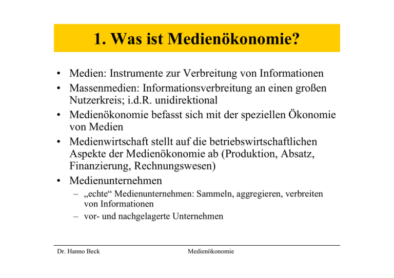 1. Was ist Medienökonomie? • Medien: Instrumente zur Verbreitung von Informationen • Massenmedien: Informationsverbreitung an einen großen Nutzerkreis; i.d.R. unidirektional • Medienökonomie befasst sich mit der speziellen Ökonomie von Medien • Medienwirtschaft stellt auf die betriebswirtschaftlichen Aspekte der Medienökonomie ab (Produktion, Absatz, Finanzierung, Rechnungswesen) • Medienunternehmen – „echte“ Medienunternehmen: Sammeln, aggregieren, verbreiten von Informationen – vor- und nachgelagerte Unternehmen Dr. Hanno Beck Medienökonomie Was tun Medienunternehmen? Informationen sammeln verifizieren bewerten einordnen bündeln Aufbereitung Vertrieb Schreiben, layouten, Vertonen, verfilmen Medienökonomie Kabel Satellit Netz Post Produkt „Meer der Informationen“ Dr. Hanno Beck Redaktion Werkzeuge in Medienunternehmen Aufbereitung Vertrieb Agentursysteme Archive OnlineDatenbanken Analysetools Reports Clippings Redaktionssysteme Autorensysteme CM-Systeme Studios Selbstfahrerstudios Medienökonomie Kabel Satellit Netz Post Produkt „Meer der Informationen“ Dr. Hanno Beck Redaktion Vor- und nachgelagerte Medienunternehmen • Vorgelagerte Medienunternehmen: – Nachrichtenagenturen (dpa, vwd, Reuters) – Datenanbieter (Bloomberg; Lexis-Nexis, Genios, GBI) – Studios, Casting-Agenturen, Computergrafik, Produzenten, Postproduktion (Schnitt etc.); Bühnenbau; Spezialeffekte • Medienunternehmen: Print, Radio, TV, Internet • Nachgelagerte Medienunternehmen – Kabelnetzanbieter; Infrastrukturanbieter – Kino, Video; CD- und DCD-Produktion – Lizenzhändler und Rechteverwerter Dr. Hanno Beck Medienökonomie 2. Warum Medienökonomie? 2.1 Besonderheiten des Gutes Information • Informationen sind nicht-stoffliche Güter – sie unterliegen keiner physischen Abnutzung – sie sind zu geringen Kosten beliebig reproduzierbar (first-copycosts) oder auch änderbar – Nicht-Rivalität im Konsum – Ausschluß von der Nutzung nur begrenzt möglich – Urheberrechtsverletzungen als Folge • Informationen unterliegen oft raschem Zeitwertverfall • Informationen sind kulturabhängig und unterliegen damit nur begrenzter Verwertbarkeit • Medienprodukte sind teilweise Unikate (Einzelfertigung) Dr. Hanno Beck Medienökonomie SindSind Informationen öffentliche Güter? Informationen öffentliche Güter? Rivalität im Konsum Ausschluss vom private Güter: Konsum möglich Hosen, Lebensmittel Ausschluss Konsum möglich Dr. Hanno Beck Nicht-Rivalität im Konsum Straßen, Sportevents, Kabelfernsehen vom Umweltgüter: Luft, Öffentliche Güter: nicht Wasser Verteidigung, Leuchtturm Medienökonomie Digitalisierung von Informationen • Aufgrund der Nicht-Stofflichkeit möglich • Kosten der Produktion sinken; aber: Qualität steigt und damit auch wieder Aufwand; Angebot steigt • Interaktivität steigt • Mehr Raum für Individualisierung des Informations- und Werbeangebots; bessere Erfassung von Kundenpräferenzen • Leistungsfähiger Vertrieb • Möglichkeit der Mehrfachverwertung • Zunehmende Dezentralisierung der Produktion • Steigende Probleme mit dem Schutz der Urheberrechte • Konvergenz der Medien: Steigende Substitutionselastizität zwischen den Medien Dr. Hanno Beck Medienökonomie Informationen als Vertrauensgüter • Informationen sind experience goods: erst beim Konsum weiß man um die Güte des Produkts • Die Qualität von Informationen lässt sich nicht ohne weiteres feststellen oder gar messen • „Rattenrennen“: Weil die Konsumenten die Qualität der Informationen nicht einschätzen können, weigern sie sich, mehr zu zahlen. Folge: Produzenten stellen auch mindere Qualität her • Lösung I: wiederholte Konsumakte • Lösung II: Signalling und der Aufbau von Reputation • Lösung III: Selber denken Dr. Hanno Beck Medienökonomie 2.2 Der doppelte Absatzmarkt • Kuppelproduktion: Herstellung von zwei Produkten gleichzeitig: Information und Werbefläche • Medienunternehmen konkurrieren auf zwei Märkten: – der Markt für Rezipienten – der Markt für Werbekunden • Hohe Interdependenzen zwischen den beiden Märkten • Forderung der Werbeindustrie: hoher Verbreitungsgrad bei geringen Streuverlusten • Zielkonflikt zwischen Reichweite und Zielgenauigkeit der Werbung • Ist die Objektivität der Medien gegenüber den Anzeigenkunden gesichert? Dr. Hanno Beck Medienökonomie 5% 3% 44% 48% Brutto-Werbeaufwendungen 2002 in Prozent Dr. Hanno Beck Medienökonomie Plakat Print Fernsehen Radio Die Anzeigen-Auflagen-Spirale • Problem: Absatzerfolg auf dem Rezipientenmarkt hat Erfolg auf dem Markt für Werbekunden zur Folge • Preisgestaltung auf Rezipientenmarkt hat Folgen für den Inserentenmarkt • Geringere Absatzzahlen führen zu geringeren Werbeeinnahmen, da die Werbewirkung des Mediums sinkt • Anzeigen-Auflagen-Spirale: Steigende Werbeeinnahmen führen zur Verbesserung des Produktes, das führt zu höheren Auflagenzahlen und damit wieder zu steigenden Werbeeinnahmen • Wettbewerbspolitisch bedenkliche Spirale? Dr. Hanno Beck Medienökonomie 2.3 Theorie der natürlichen Monopole • Beispielunternehmen: 1000 Euro Fixkosten; die unabhängig von der produzierten Menge anfallen • Variable Kosten: hängen von der Ausbringungsmenge ab, steigen oft bei steigender Ausbringungsmenge • Grenzkosten: Geben die Kosten einer zusätzlich produzierten Einheit an • Durchschnittskosten: Ausbringungsmenge dividiert durch Gesamtkosten der jeweiligen produzierten Menge • Kostenfunktion: Zusammenhang zwischen Ausbringungsmenge und den durch sie verursachten Kosten Dr. Hanno Beck Medienökonomie Stückzahl Variable Kosten Gesamtkosten Grenzkosten Durchschnittskosten 10 100 1100 100 110 20 210 1210 110 60,5 30 330 1330 120 44,3 50 450 1450 170 29 100 700 1700 250 17 Dr. Hanno Beck Medienökonomie Ergebnisse • Mit steigender Produktion steigen auch die variablen Kosten und die Gesamtkosten • Mit steigender Produktion steigen auch die Grenzko