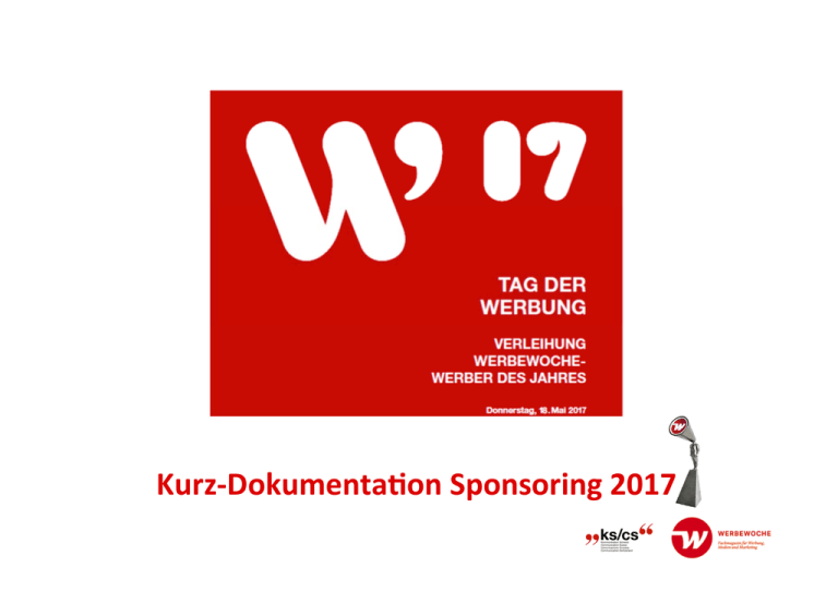 Kurz-Dokumenta.onSponsoring2017 KS-CSKommunika.onSchweiz-Communica.onSuisse KS/CSKommunika-onSchweizist1925alsersterVerbandderWerbebranchegegründet wordenundstehtimDiensteihrerMitglieder,denWerbeagenturen,WerbeauDraggebern undMedienanbietern. WeiterintegriertindieKS/CSKommunika-onSchweizsindnebenUnternehmen verschiedeneBranchenverbändesowiewich-geWirtschaDsverbände.DieKS/CSsetztsich mitallihrenMiJelnundRessourcenindenBereichenPoli-k,RechtundAusbildungfürdie kommerzielleKommunika-onein. IntegriertinKS/CSsindUnternehmen,Branchenverbändeundwich-ge WirtschaDsverbändesowieEinzelmitgliederfolgenderdreiGruppierungen: - WerbeauDraggeber - Werbeagenturen/Werbeberater - Medienanbieter/AuDragnehmer TagderWerbung/Journéedelapublicité/Rückblick Ims-mmungsvollenRahmendesMuséeOlympiqueinLausannefandenam27.Mai 2016derTagderWerbungmitder91.MitgliederversammlungvonKS/CS,derersten MitgliederversammlungenderbeidensprachregionalenSek-onenDeutsch-und WestschweizunddieVerleihung«WerberdesJahres»mitderÜbergabeder Egon-TrophäestaJ.Zudenrund300TeilnehmerInnensprachenderRegierungsrat Waadt,PascalBroulis,ClaudeNicollier(Nasa-TestpilotundAstronaut)undIanLogan (GeneraldirektorOlympischeJugendspiele2020Lausanne). TagderWerbung/Journéedelapublicité/2017 ProvisorischesProgrammvomDonnerstag,18.Mai2017«TagderWerbung» mitVerleihungdes«WerberdesJahres» 13:00-EintreffenderGäste-Empfang/KaffeeundSandwiches 13:30-GVSAWI 14:00-EintreffenweitererGästeundTeilnehmender 14:30-MitgliederversammlungenKS/CS2017 15:15-Kaffeepause/Networking 16:00-ReferatundPodiumsdiskussionzumHaupJhema«KünstlicheIntelligenzundKrea-vität» 18:00-Präsenta-onundVerleihung«WerberdesJahres2017» 19:00-ApéroundNetworking ca.20:30-EndederVeranstaltung(mitfolgendemBarbetrieb) Veranstaltungsort:X-Tra,Zürich HaupThemaTagderWerbung2017 Krea.vitätundKünstlicheIntelligenz ComputersindheutebereitsinderLage,eigenständigzulernen.DiekünstlicheIntelligenzhilD sogarKunstschaffendenoderWerber,neuekrea-veWegezubeschreiten. ZumBeispiel:imMärzkündigteMcCannEricksonJapandieErweiterungseinesTeamsumeinen äusserstungewöhnlichenKollegenan:AI-CDβ,einen„Ar-ficiallyIntelligentCrea-veDirector“. AI-CDβentstandimRahmendesinnova-venMcCann-Millennials-Projekts,andemMitarbeiter derAgenturzwischen1980und2000arbeiteten.„DadasMcCann-Millennials-Projektjungwar, gabesniemanden,derdiePosi-oneinesCrea-veDirectorinnehaJe“,erklärteMatsuzaka. „DaherfasstenwirdenEntschluss,selbsteinenzuerschaffen.“ «WerberdesJahres2017» 40.VerleihungderEgon-Trophäe DieJuryfürdenWerberdesJahres2017steht EndeMärz2017gehtderWerberdesJahresineineneueRunde:Dannbeginntdie14-köpfige JurymitderVorauswahldersechsKandidaten,diedenWerbewoche-Lesernab13. Aprilzur Wahlstehenwerden.Am18.MaifindetschliesslichinZürichdiefeierlicheÜbergabedesseit 39JahrenvonderWerbewocheverliehenenEgonstaJ. DieJurysetztsich2017zusammenausdenletztenachtWerbewoche-WerberndesJahres, pluszweiVertreternderWestschweizundvierNachwuchsjuroren. Diekri-schen14sind: LukasAmgwerd/FrankBodin/NadineBorter/PeterBrönnimann/ RegulaBührerFecker/AlexanderJaggy/CurdinJaneJ/ GabrielMauron/ValériePecalvel/SandyPfuhl/UrsSchneider/ CinthiaSteJlerLlorente/ThomasWildberger/KevinZysset SponsoringPackageszumTagderWerbung/2017 Package#1 CHF10000.— GegenleistungenimWertvonCHF10‘000.—++ -LogoPräsenz(Fotowand,Bühnelinksundrechts,imSponsoren-LoopvordenReferatenundindenPausen aufderLeinwand) -AuflagevonWerbematerialimKaffeepause-Bereich -AufstellenvonzweiRoll-UpDisplaysimEingangsbereich -GastgeschenkfürdieTeilnehmendeninGiveaway-BagsundStand(oderSpotbis30Sekunden) -1/1SeiteInseratimWerbewoche-Branchenreport«Werbung» -1WochePräsenzaufWerbewoche.chmiteinemRectangleRoS -WerbungimWerbewoche-NewsleJer(5Versände) -Logo-PräsenzbeiderBewerbungdesAnlassesaufsämtlichenMedien(Einladung,Plakate,Flyer,Mailings undNewsleJers) -NamentlicheVerdankungalsSponsorpartner SponsoringPackageszumTagderWerbung/2017 Package#2 CHF7’500.— GegenleistungenimWertvonCHF7500.—++ - LogoPräsenzen(Fotowand,Bühnerechtsoderlinks,imSponsoren-Loop - VordenReferatenundindenPausenaufderLeinwand) - Logo-PräsenzaufderFotowand - GiveawayfürdieTeilnehmerundStand(oderSpotbis30Sekunden) - 1/2SeiteInseratimWerbewoche-Branchenreport«Werbung» - 1WochePräsenzaufWerbewoche.chmiteinemRectangleRoS - Logo-PräsenzbeiderBewerbungdesAnlassesaufsämtlichenMedien(Einladung,Plakate,Flyer, MailingsundNewsleJers -NamentlicheVerdankungalsSponsorpartner SponsoringPackageszumTagderWerbung/2017 Package#3 CHF5000.— GegenleistungenimWertvonCHF5000.—++ - LogoPräsenzen(Fotowand,Bühnerechtsoderlinks,imSponsoren-Loop - VordenReferatenundindenPausenaufderLeinwand) - 1WochePräsenzaufWerbewoche.chmiteinemRectangleRoS - WerbungimWerbewoche-NewsleJer(3Versände) - Logo-PräsenzbeiderBewerbungdesAnlassesaufsämtlichenMedien(Einladung,Plakate,Flyer, MailingsundNewsleJers) -NamentlicheVerdankungalsSponsorpartner SponsoringPackageszumTagderWerbung/2017 Package#4 CHF3000.— -AufstellenRoll-upFirma/ProduktundProspektständer,VerkaufspersonvorOrtmitSampling,Verteilung– Prospekte/weiteresMaterial -LogoPräsenzen(Fotowand,Bühnerechtsoderlinks,imSponsoren-LoopvordenReferatenundinden PausenaufderLeinwand) -Logo-PräsenzbeiderBewerbungdesAnlassesaufsämtlichenMedien(Einladung,Plakate,Flyer,Mailings undNewsleJers) -NamentlicheVerdankungalsSponsorpartner -5Gra-seintriJefürSieundIhreKunden SponsoringPackageszumTagderWerbung/2017 Package#5 CHF1900.— -AufstellenRoll-upFirma/ProduktundProspektständer(ohneVerkaufspersonal) -LogoPräsenzen(Fotowand,Bühnerechtsoderlinks,imSponsoren-LoopvordenReferatenundinden PausenaufderLeinwand) -Logo-PräsenzbeiderBewerbungdesAnlassesaufsämtlichenMedien(Einladung,Plakate,Flyer,Mailings undNewsleJers) -NamentlicheVerdankungalsSponsorpartner -2Gra-seintriJefürSieundIhrenKunden Kontakte KS-CSKommunika.onSchweiz: PatrickZanello,[email protected],Tel0796322199 Werbewoche: ThomasStuckert,[email protected],Tel0763438155