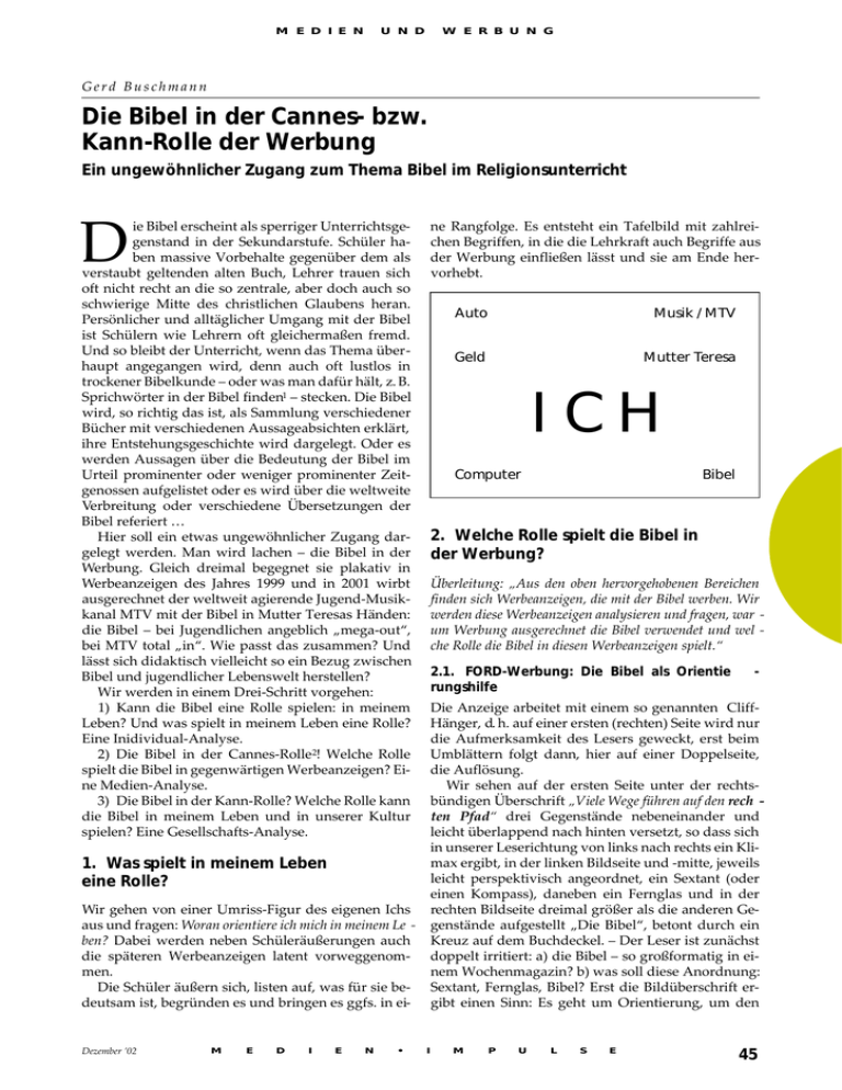 M E D I E N U N D W E R B U N G Gerd Buschmann Die Bibel in der Cannes- bzw. Kann-Rolle der Werbung Ein ungewöhnlicher Zugang zum Thema Bibel im Religionsunterricht D ie Bibel erscheint als sperriger Unterrichtsgegenstand in der Sekundarstufe. Schüler haben massive Vorbehalte gegenüber dem als verstaubt geltenden alten Buch, Lehrer trauen sich oft nicht recht an die so zentrale, aber doch auch so schwierige Mitte des christlichen Glaubens heran. Persönlicher und alltäglicher Umgang mit der Bibel ist Schülern wie Lehrern oft gleichermaßen fremd. Und so bleibt der Unterricht, wenn das Thema überhaupt angegangen wird, denn auch oft lustlos in trockener Bibelkunde – oder was man dafür hält, z. B. Sprichwörter in der Bibel finden1 – stecken. Die Bibel wird, so richtig das ist, als Sammlung verschiedener Bücher mit verschiedenen Aussageabsichten erklärt, ihre Entstehungsgeschichte wird dargelegt. Oder es werden Aussagen über die Bedeutung der Bibel im Urteil prominenter oder weniger prominenter Zeitgenossen aufgelistet oder es wird über die weltweite Verbreitung oder verschiedene Übersetzungen der Bibel referiert … Hier soll ein etwas ungewöhnlicher Zugang dargelegt werden. Man wird lachen – die Bibel in der Werbung. Gleich dreimal begegnet sie plakativ in Werbeanzeigen des Jahres 1999 und in 2001 wirbt ausgerechnet der weltweit agierende Jugend-Musikkanal MTV mit der Bibel in Mutter Teresas Händen: die Bibel – bei Jugendlichen angeblich „mega-out“, bei MTV total „in“. Wie passt das zusammen? Und lässt sich didaktisch vielleicht so ein Bezug zwischen Bibel und jugendlicher Lebenswelt herstellen? Wir werden in einem Drei-Schritt vorgehen: 1) Kann die Bibel eine Rolle spielen: in meinem Leben? Und was spielt in meinem Leben eine Rolle? Eine Inidividual-Analyse. 2) Die Bibel in der Cannes-Rolle2! Welche Rolle spielt die Bibel in gegenwärtigen Werbeanzeigen? Eine Medien-Analyse. 3) Die Bibel in der Kann-Rolle? Welche Rolle kann die Bibel in meinem Leben und in unserer Kultur spielen? Eine Gesellschafts-Analyse. ne Rangfolge. Es entsteht ein Tafelbild mit zahlreichen Begriffen, in die die Lehrkraft auch Begriffe aus der Werbung einfließen lässt und sie am Ende hervorhebt. E D I E N • Geld Mutter Teresa Computer Bibel 2. Welche Rolle spielt die Bibel in der Werbung? Überleitung: „Aus den oben hervorgehobenen Bereichen finden sich Werbeanzeigen, die mit der Bibel werben. Wir werden diese Werbeanzeigen analysieren und fragen, war um Werbung ausgerechnet die Bibel verwendet und wel che Rolle die Bibel in diesen Werbeanzeigen spielt.“ 2.1. FORD-Werbung: Die Bibel als Orientie rungshilfe - Die Anzeige arbeitet mit einem so genannten CliffHänger, d. h. auf einer ersten (rechten) Seite wird nur die Aufmerksamkeit des Lesers geweckt, erst beim Umblättern folgt dann, hier auf einer Doppelseite, die Auflösung. Wir sehen auf der ersten Seite unter der rechtsbündigen Überschrift „Viele Wege führen auf den rech ten Pfad“ drei Gegenstände nebeneinander und leicht überlappend nach hinten versetzt, so dass sich in unserer Leserichtung von links nach rechts ein Klimax ergibt, in der linken Bildseite und -mitte, jeweils leicht perspektivisch angeordnet, ein Sextant (oder einen Kompass), daneben ein Fernglas und in der rechten Bildseite dreimal größer als die anderen Gegenstände aufgestellt „Die Bibel“, betont durch ein Kreuz auf dem Buchdeckel. – Der Leser ist zunächst doppelt irritiert: a) die Bibel – so großformatig in einem Wochenmagazin? b) was soll diese Anordnung: Sextant, Fernglas, Bibel? Erst die Bildüberschrift ergibt einen Sinn: Es geht um Orientierung, um den Wir gehen von einer Umriss-Figur des eigenen Ichs aus und fragen: Woran orientiere ich mich in meinem Le ben? Dabei werden neben Schüleräußerungen auch die späteren Werbeanzeigen latent vorweggenommen. Die Schüler äußern sich, listen auf, was für sie bedeutsam ist, begründen es und bringen es ggfs. in ei- M Musik / MTV ICH 1. Was spielt in meinem Leben eine Rolle? Dezember ’02 Auto I M P U L S E 45 M E D I E N U N D W E R B U N G Ford-Werbung aus: DER SPIEGEL1999, Heft 23, 221–223. rechten Weg, zweimal im wörtlichen Sinn, einmal im übertragenen Sinn. Gleichwohl klingt die Überschrift nicht wirklich logisch; denn eigentlich müsste es heißen „viele Hilfsmittel führen auf den rechten Pfad“, aber das klänge wohl zu nüchtern. Hier wird schon (unter-)bewusst auf religiöse Sprache abgehoben – wie der Text der folgenden Doppelseite bestätigen wird. „Viele Wege führen …“ setzen wir umgangssprachlich überlicherweise fort mit „… nach Rom“. „Weg“ ist ein biblisch besetzter Terminus – nicht nur über die Exodus- und Weg-Symbolik des Alten Testaments3, sondern auch vom Neuen Testament her: „Jesus Christus spricht: Ich bin der Weg, die Wahrheit und das Leben; niemand kommt zum Vater denn durch mich.“ (Joh 14,6). Und der „rechte Pfad“ klingt ebenfalls religiös und arachisch wie „Pfad der Erleuchtung“ o.Ä. Vom Bildaufbau her völlig parallel ist die folgende Doppelseite gestaltet; denn auch sie präsentiert in der Horizontalen drei ganz analog von links nach rechts nebeneinander und leicht hintereinander geordnete „Gegenstände“: Ford Cougar, Fort Galaxy, Ford Mondeo. Auch hier fällt das Licht von rechts ins Bild, auch hier erscheinen im vertikalen Bildaufbau die drei Gegenstände präsentiert wie auf einem Tablett oder Tisch, indem der Betrachter sich auf Tischhöhe befindet und die Gegenstände durch einen breiten dunklen Streifen wie unterstrichen wirken. Am unteren Bildrand findet sich ein dritter hellerer Streifen, der bei der Doppelseite den Werbetext aufnimmt, während er auf der ersten Seite leer blieb. Wir haben es in der Bildstruktur also mit einer jeweils klaren Dreigliederung sowohl in der Horizontalen wie in der Vertikalen zu tun. Das bringt eine klare Struktur, Statik, Solidität und Festigkeit zum Ausdruck, die auf