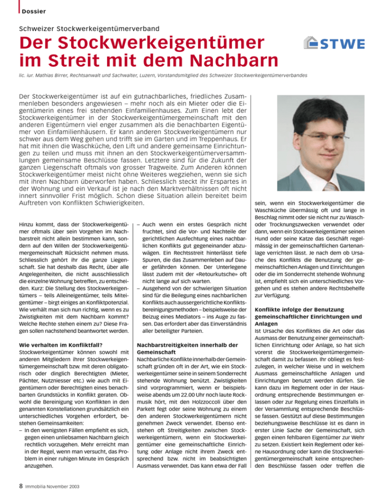 Dossier Schweizer Stockwerkeigentümerverband Der Stockwerkeigentümer im Streit mit dem Nachbarn lic. iur. Mathias Birrer, Rechtsanwalt und Sachwalter, Luzern, Vorstandsmitglied des Schweizer Stockwerkeigentümerverbandes Der Stockwerkeigentümer ist auf ein gutnachbarliches, friedliches Zusammenleben besonders angewiesen – mehr noch als ein Mieter oder die Eigentümerin eines frei stehenden Einfamilienhauses. Zum Einen lebt der Stockwerkeigentümer in der Stockwerkeigentümergemeinschaft mit den anderen Eigentümern viel enger zusammen als die benachbarten Eigentümer von Einfamilienhäusern. Er kann anderen Stockwerkeigentümern nur schwer aus dem Weg gehen und trifft sie im Garten und im Treppenhaus. Er hat mit ihnen die Waschküche, den Lift und andere gemeinsame Einrichtungen zu teilen und muss mit ihnen an den Stockwerkeigentümerversammlungen gemeinsame Beschlüsse fassen. Letztere sind für die Zukunft der ganzen Liegenschaft oftmals von grosser Tragweite. Zum Anderen können Stockwerkeigentümer meist nicht ohne Weiteres wegziehen, wenn sie sich mit ihren Nachbarn überworfen haben. Schliesslich steckt ihr Erspartes in der Wohnung und ein Verkauf ist je nach den Marktverhältnissen oft nicht innert sinnvoller Frist möglich. Schon diese Situation allein bereitet beim Auftreten von Konflikten Schwierigkeiten. Hinzu kommt, dass der Stockwerkeigentümer oftmals über sein Vorgehen im Nachbarstreit nicht allein bestimmen kann, sondern auf den Willen der Stockwerkeigentümergemeinschaft Rücksicht nehmen muss. Schliesslich gehört ihr die ganze Liegenschaft. Sie hat deshalb das Recht, über alle Angelegenheiten, die nicht ausschliesslich die einzelne Wohnung betreffen, zu entscheiden. Kurz: Die Stellung des Stockwerkeigentümers – teils Alleineigentümer, teils Miteigentümer – birgt einiges an Konfliktpotenzial. Wie verhält man sich nun richtig, wenn es zu Zwistigkeiten mit dem Nachbarn kommt? Welche Rechte stehen einem zu? Diese Fragen sollen nachstehend beantwortet werden. – Auch wenn ein erstes Gespräch nicht fruchtet, sind die Vor- und Nachteile der gerichtlichen Ausfechtung eines nachbarlichen Konflikts gut gegeneinander abzuwägen. Ein Rechtsstreit hinterlässt tiefe Spuren, die das Zusammenleben auf Dauer gefährden können. Der Unterlegene lässt zudem mit der «Retourkutsche» oft nicht lange auf sich warten. – Ausgehend von der schwierigen Situation sind für die Beilegung eines nachbarlichen Konflikts auch aussergerichtliche Konfliktsbereinigungsmethoden – beispielsweise der Beizug eines Mediators – ins Auge zu fassen. Das erfordert aber das Einverständnis aller beteiligter Parteien. Wie verhalten im Konfliktfall? Stockwerkeigentümer können sowohl mit anderen Mitgliedern ihrer Stockwerkeigentümergemeinschaft bzw. mit deren obligatorisch oder dinglich Berechtigten (Mieter, Pächter, Nutzniesser etc.) wie auch mit Eigentümern oder Berechtigten eines benachbarten Grundstücks in Konflikt geraten. Obwohl die Bereinigung von Konflikten in den genannten Konstellationen grundsätzlich ein unterschiedliches Vorgehen erfordert, bestehen Gemeinsamkeiten: – In den wenigsten Fällen empfiehlt es sich, gegen einen unliebsamen Nachbarn gleich rechtlich vorzugehen. Mehr erreicht man in der Regel, wenn man versucht, das Problem in einer ruhigen Minute im Gespräch anzugehen. Nachbarstreitigkeiten innerhalb der Gemeinschaft Nachbarliche Konflikte innerhalb der Gemeinschaft gründen oft in der Art, wie ein Stockwerkeigentümer seine in seinem Sonderrecht stehende Wohnung benützt. Zwistigkeiten sind vorprogrammiert, wenn er beispielsweise abends um 22.00 Uhr noch laute Rockmusik hört, mit den Holzzoccoli über den Parkett fegt oder seine Wohnung zu einem den anderen Stockwerkeigentümern nicht genehmen Zweck verwendet. Ebenso entstehen oft Streitigkeiten zwischen Stockwerkeigentümern, wenn ein Stockwerkeigentümer eine gemeinschaftliche Einrichtung oder Anlage nicht ihrem Zweck entsprechend bzw. nicht im beabsichtigten Ausmass verwendet. Das kann etwa der Fall 8 Immobilia November 2003 sein, wenn ein Stockwerkeigentümer die Waschküche übermässig oft und lange in Beschlag nimmt oder sie nicht nur zu Waschoder Trocknungszwecken verwendet oder dann, wenn ein Stockwerkeigentümer seinen Hund oder seine Katze das Geschäft regelmässig in der gemeinschaftlichen Gartenanlage verrichten lässt. Je nach dem ob Ursache des Konflikts die Benutzung der gemeinschaftlichen Anlagen und Einrichtungen oder die im Sonderrecht stehende Wohnung ist, empfiehlt sich ein unterschiedliches Vorgehen und es stehen andere Rechtsbehelfe zur Verfügung. Konflikte infolge der Benutzung gemeinschaftlicher Einrichtungen und Anlagen Ist Ursache des Konfliktes die Art oder das Ausmass der Benutzung einer gemeinschaftlichen Einrichtung oder Anlage, so hat sich vorerst die Stockwerkeigentümergemeinschaft damit zu befassen. Ihr obliegt es festzulegen, in welcher Weise und in welchem Ausmass gemeinschaftliche Anlagen und Einrichtungen benutzt werden dürfen. Sie kann dazu im Reglement oder in der Hausordnung entsprechende Bestimmungen erlassen oder zur Regelung eines Einzelfalls in der Versammlung entsprechende Beschlüsse fassen. Gestützt auf diese Bestimmungen beziehungsweise Beschlüsse ist es dann in erster Linie Sache der Gemeinschaft, sich gegen einen fehlbaren Eigentümer zur Wehr zu setzen. Existiert kein Reglement oder keine Hausordnung oder kann die Stockwerkeigentümergemeinschaft keine entsprechenden Beschlüsse fassen oder treffen die Dossier Bestimmungen der Hausordnung oder des Reglements auf den konkreten Sachverhalt nicht zu, so steht der Stockwerkeigentümergemeinschaft auch die Möglichkeit offen, sich auf die gesetzliche Bestimmung in Art. 648 Abs. 1 des Zivilgesetzbuches (ZGB) zu berufen. Gemäss Art. 648 Abs. 1 ZGB darf ein Miteigentümer die gemeinsame Sache – und damit auch die gemeinsamen Einrichtungen und Anlagen – nur insoweit nutzen, als es mit den Rechten der an