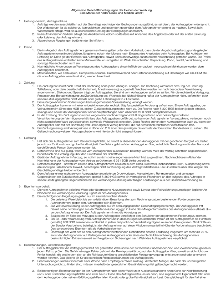 Allgemeine Geschäftsbedingungen der Helden der Werbung Eine Marke der rieder Druck und Medien GmbH 1. Geltungsbereich, Vertragsschluss 1. Aufträge werden ausschließlich auf der Grundlage nachfolgender Bedingungen ausgeführt, es sei denn, der Auftraggeber widerspricht. Der Widerspruch ist als solcher zu kennzeichnen und gesondert gegenüber dem Auftragnehmer geltend zu machen. Soweit kein Widerspruch erfolgt, wird die ausschließliche Geltung der Bedingungen anerkannt. 2. Im kaufmännischen Verkehr erfolgt das Anerkenntnis jedoch spätestens mit Annahme des Angebotes oder mit der ersten Lieferung oder Leistung des Auftragnehmers. 3. Abweichende Regelungen bedürfen der Schriftform. 2. Preise 1. Die im Angebot des Auftragnehmers genannten Preise gelten unter dem Vorbehalt, dass die der Angebotsabgabe zugrunde gelegten Auftragsdaten unverändert bleiben, längstens jedoch vier Monate nach Eingang des Angebotes beim Auftraggeber. Bei Aufträgen mit Lieferung an Dritte gilt der Besteller als Auftraggeber, soweit keine anderweitige ausdrückliche Vereinbarung getroffen wurde. Die Preise des Auftragnehmers enthalten keine Mehrwertsteuer und gelten ab Werk. Sie schließen Verpackung, Porto, Fracht, Versicherung und sonstige Versandkosten nicht ein. 2. Nachträgliche Änderungen auf Veranlassung des Auftraggebers einschließlich der dadurch verursachten Mehrkosten werden dem Auftraggeber berechnet. 3. Materialkosten, wie Farbkopien, Computerausdrucke, Datenfernversand oder Datenabspeicherung auf Dateiträger wie CD-ROM etc., die vom Auftraggeber veranlasst sind, werden berechnet. 3. Zahlung 1. Die Zahlung hat sofort nach Erhalt der Rechnung ohne jeden Abzug zu erfolgen. Die Rechnung wird unter dem Tag der Lieferung, Teillieferung oder Lieferbereitschaft (Holschuld, Annahmeverzug) ausgestellt. Wechsel werden nur nach besonderer Vereinbarung angenommen. Diskont und Spesen trägt der Auftraggeber. Sie sind vom Auftraggeber sofort zu zahlen. Für die rechtzeitige Vorlegung, Protestierung, Benachrichtigung und Zurückleitung des Wechsels bei Nichteinlösung haftet der Auftragnehmer nicht, sofern ihm oder seinem Erfüllungsgehilfen nicht Vorsatz oder grobe Fahrlässigkeit zur Last fallen. 2. Bei außergewöhnlichen Vorleistungen kann angemessene Vorauszahlung verlangt werden. 3. Der Auftraggeber kann nur mit einer unbestrittenen oder rechtskräftig festgestellten Forderung aufrechnen. Einem Auftraggeber, der Vollkaufmann im Sinne des HGB ist, stehen Zurückbehaltungsrechte nicht zu. Die Rechte nach § 320 BGB bleiben jedoch erhalten, solange und soweit der Auftragnehmer seinen Verpfichtungen nach Abschnitt VI. 3 nicht nachgekommen ist. 4. Ist die Erfüllung des Zahlungsanspruches wegen einer nach Vertragsabschluß eingetretenen oder bekanntgewordenen Verschlechterung der Vermögensverhältnisse des Auftraggebers gefährdet, so kann der Auftragnehmer Vorauszahlung verlangen, noch nicht ausgelieferte Ware zurückbehalten, sowie die Weiterarbeit einstellen. Diese Rechte stehen dem Auftragnehmer auch zu, wenn der Auftraggeber sich mit der Bezahlung von Lieferungen in Verzug befndet, die auf demselben rechtlichen Verhältnis beruhen. 5. Bei Zahlungsverzug sind Verzugszinsen in Höhe von 2 % über dem jeweiligen Diskontsatz der Deutschen Bundesbank zu zahlen. Die Geltendmachung weiteren Verzugsschadens wird hierdurch nicht ausgeschlossen. 4. Lieferung 1. Hat sich der Auftragnehmer zum Versand verpfichtet, so nimmt er diesen für den Auftraggeber mit der gebotenen Sorgfalt vor, haftet jedoch nur für Vorsatz und grobe Fahrlässigkeit. Die Gefahr geht auf den Auftraggeber über, sobald die Sendung an die den Transport durchführende Person übergeben worden ist. 2. Liefertermine sind nur gültig, wenn sie vom Auftragnehmer ausdrücklich bestätigt werden. Wird der Vertrag schriftlich abgeschlossen, bedarf auch die Bestätigung über den Liefertermin der Schriftform. 3. Gerät der Auftragnehmer in Verzug, so ist ihm zunächst eine angemessene Nachfrist zu gewähren. Nach fruchtlosem Ablauf der Nachfrist kann der Auftraggeber vom Vertrag zurücktreten. § 361 BGB bleibt unberührt. 4. Betriebsstörungen – sowohl im Betrieb des Auftragnehmers als auch in dem eines Zulieferers, insbesondere Streit, Aussperrung sowie alle sonstigen Fälle höherer Gewalt, berechtigen nicht zur Kündigung des Vertragsverhältnisses. Die Grundsätze über den Wegfall der Geschäftsgrundlage bleiben unberührt. 5. Dem Auftragnehmer steht an vom Auftraggeber angelieferten Druckvorlagen, Manuskripten, Rohmaterialien und sonstigen Gegenständen ein Zurückbehaltungsrecht gemäß § 369 HGB sowie ein vertragliches Pfandrecht an den aufgrund des Auftrages in seinen Besitz gelangten Gegenständen bis zur vollständigen Erfüllung aller fälligen Forderungen aus der Geschäftsverbindung zu. 5. Eigentumsvorbehalt 1. Die vom Auftragnehmer gelieferte Ware oder übertragene Nutzungsrechte sowie Layout oder Reinzeichnungsunterlagen jeglicher Art bleiben bis zur vollständigen Bezahlung Eigentum des Auftragnehmers. 2. Die nachfolgenden Regelungen gelten nur im kaufmännischen Verkehr: 1. Die gelieferte Ware bleibt bis zur vollständigen Bezahlung aller zum Rechnungsdatum bestehenden Forderungen des Auftragnehmers gegen den Auftraggeber sein Eigentum. 2. Zur Weiterveräußerung ist der Auftraggeber nur im ordnungsgemäßen Geschäftsgang berechtigt. Der Auftraggeber tritt hiermit seine Forderungen aus der Weiterveräußerung ggf. in Höhe des Miteigentumsanteils des Auftragnehmers (Absatz d) – an den Auftragnehmer ab. Der Auftragnehmer nimmt die Abtretung an. 3. Spätestens im Falle des Verzuges ist der Auftraggeber verpfichtet den Schuldner der abgetretenen Forderung zu nennen. 4. Bei Be– oder Verarbeitung vom Auftragnehmer und in dessen Eigentum stehender Waren ist der Auftragnehmer als Hersteller gemäß § 950 BGB anzusehen und behält in jedem Zeitpunkt der Verarbeitung Eigentum an den Erzeugnissen. Sind Dritte an der Beoder Verarbei