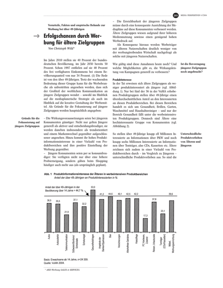................................................................................................................................................................ Vorurteile, Fakten und empirische Befunde zur Werbung bei über 49-Jährigen U Erfolgschancen durch Werbung für ältere Zielgruppen Von Christoph Wild* Im Jahre 2010 stellen sie 40 Prozent der bundesdeutschen Bevölkerung, im Jahr 2030 bereits 50 Prozent. Schon 1997 entfielen auf sie 48 Prozent des frei verfügbaren Einkommens bei einem Bevölkerungsanteil von nur 34 Prozent. (1) Die Rede ist von den über 49-Jährigen. Trotz der wachsenden Bedeutung dieser Gruppe kann für die Werbebranche als unbestritten angesehen werden, dass sich der Großteil der werblichen Kommunikation an jüngere Zielgruppen wendet – sowohl im Hinblick auf die mediaplanerische Strategie als auch im Hinblick auf die kreative Gestaltung der Werbemittel. Als Gründe für die Fokussierung auf jüngere Zielgruppen werden hauptsächlich angegeben: Gründe für die Fokussierung auf jüngere Zielgruppen – Die Wirkungsvoraussetzungen seien bei jüngeren Konsumenten günstiger: Nicht nur gelten Jüngere generell als aktiver und entscheidungsfreudiger, sie werden daneben insbesondere als trendorientiert und einem Markenwechsel gegenüber aufgeschlossener angesehen. Hinzu kommt ihr hohes Produktinformationsinteresse in einer Vielzahl von Produktbereichen und ihre positive Einstellung der Werbung gegenüber. – Jüngere Konsumenten seien per se konsumfreudiger: Sie verfügten nicht nur über eine höhere Probierneigung, sondern gäben beim Shopping häufiger auch mehr aus (als ursprünglich geplant). ................................................................................. ** ARD-Werbung SALES & SERVICES. x 251 media perspektiven 6/ 2004 – Die Erreichbarkeit der jüngeren Zielgruppen müsse durch eine konsequente Ausrichtung der Mediapläne auf diese Konsumenten verbessert werden. Ältere Zielgruppen wiesen aufgrund ihrer höheren Mediennutzung sowieso einen genügend hohen Werbedruck auf. Als Konsequenz hieraus werden Werbeträger mit älteren Nutzerschaften deutlich weniger von der werbungtreibenden Wirtschaft nachgefragt als solche mit jüngeren Nutzerschaften. Wie gültig sind diese Annahmen heute noch? Und welche Möglichkeiten gibt es, die Wirkungsleistung von Kampagnen generell zu verbessern? Ist die Bevorzugung jüngerer Zielgruppen noch angebracht? Produktinteresse In der Tat erweisen sich ältere Zielgruppen als weniger produktinteressiert als jüngere (vgl. Abbildung 1). Nur bei fünf der 56 in der VuMA erhobenen Produktgruppen stellen über 49-Jährige einen überdurchschnittlichen Anteil an den Interessierten an diesen Produktbereichen. Bei diesen Bereichen handelt es sich um Gesundheit, Brillen, Garten, Waschmittel und Haushaltsreiniger – und nur der Bereich Gesundheit fällt unter die werbeintensivsten Produktgruppen. Dennoch sind Ältere eine hochinteressante Gruppe von Konsumenten (vgl. Abbildung 2). So stellen über 49-Jährige knapp elf Millionen Interessierte an Informationen über PKW und noch knapp sechs Millionen Interessierte an Informationen über Tonträger, also CDs, Kassetten etc. Ältere zeichnen sich zudem in einer Vielzahl von Produktbereichen durch – im Vergleich zu Jüngeren – unterschiedliche Produktvorlieben aus. So sind die Unterschiedliche Produktvorlieben von Älteren und Jüngeren media perspektiven 6/ 2004 Vier Typen von älteren Zielgruppen x Christoph Wild 252 . . . . . . . . . . . . . . . . . . . . . . . . . . . . . . . . . . . . . . . . . . . . . . . . . . . . . . . . . . . . . . . . . . . . . . . . . . . . . . . . . . . . . . . . . . . . . . . . . . . . . . . . . . . . . . . . . . . . . . . . . . . . . . . . . . . . . . . . . . . . . . . . . . . . . . . . . . . . . . . . Älteren zwar auch bei den Personen mit PKWKaufabsicht in den nächsten zwei Jahren mit „nur“ 3,2 Millionen oder 29,3 Prozent unterdurchschnittlich vertreten (2), doch gehen deren Kaufwünsche in Bezug auf die PKW-Klassen in Richtung (obere) Mittelklasse und Luxusklasse (48 % der älteren Kaufwilligen, gegenüber 33 % bei den jüngeren), während Jüngere einen PKW aus der unteren Mittelklasse bzw. gar nur einen Kleinst- oder Kleinwagen auf ihrer Einkaufsliste stehen haben (56 % zu 48 %). Ältere können sich ihre anspruchsvolleren Kaufwünsche offensichtlich auch erfüllen, da sie zu einem hohen Prozentsatz (44 %, jüngere 25 %) bereit sind, mehr als 15 000 Euro für den „neuen“ PKW auszugeben. Jüngeren potenziellen PKW-Käufern sitzt dagegen das Geld nicht so locker: In dieser Gruppe will jeder zweite nur bis zu 10 000 Euro ausgeben. In der Regel dürfte bei dieser Summe nur ein Gebrauchtwagen herausspringen. Hinsichtlich der Markenpräferenz zeigen sich nur geringe Unterschiede: Dass Ältere eine Vorliebe für Mercedes und Jüngere als Mitglieder der Generation Golf eine Vorliebe für VW besitzen, dürfte nicht sonderlich überraschen. Ältere Zielgruppen stellen also in weitgehend allen Produktbereichen eine in der Regel auch quantitativ wichtige Gruppe. Zudem weisen sie innerhalb der einzelnen Produktgruppen andere Vorlieben als Jüngere auf. unterschiedliche Gruppen einzuteilen. (3) Die ARDWerbung lässt diese Statementbatterie seit einigen Jahren in der Verbrauchs- und Medienanalyse (VuMA) mit erheben. Vier Typen von älteren Zielgruppen lassen sich isolieren: Lebens- und Konsumeinstellung Bereits in den frühen 90er Jahren entwickelte die Bayerische Rundfunkwerbung (BRW) eine Statementbatterie, die es ermöglichte, ältere Menschen in Bayern hinsichtlich ihrer Lebenseinstellung in – Die aktiven, flexiblen Älteren, deren Anteil 22 Prozent an den Erwachsenen über 49 Jahre beträgt und die damit hochgerechnet 6,3 Millionen Bundesbürger stellen. Die sehr aktive, positive Lebenseinstellung dieses Typs, gepaart mit einem breiten Informationsinteresse, erstreckt sich auch auf seine deutlich positive und tolerante Einste