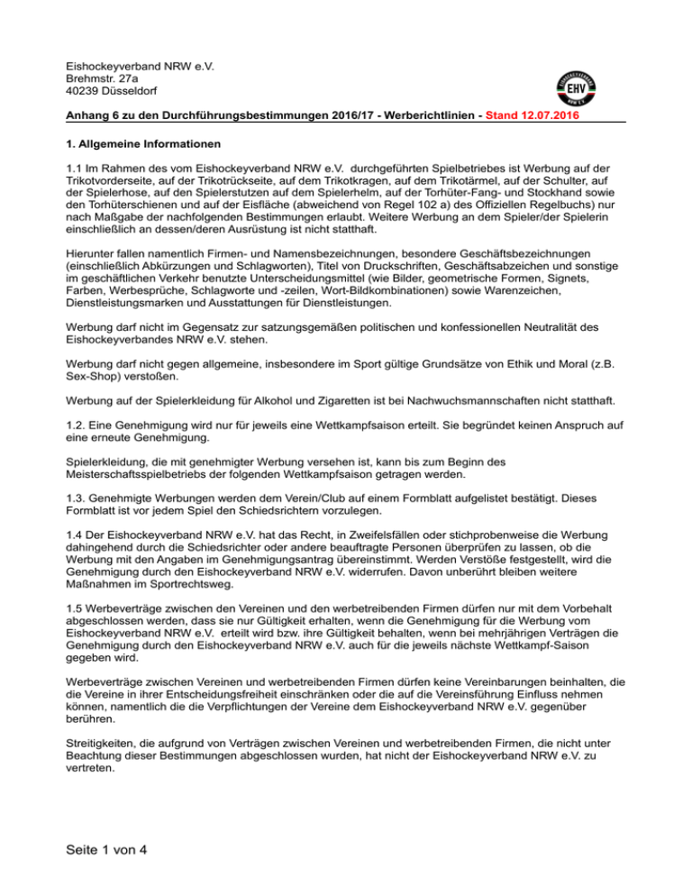 Eishockeyverband NRW e.V. Brehmstr. 27a 40239 Düsseldorf Anhang 6 zu den Durchführungsbestimmungen 2016/17 - Werberichtlinien - Stand 12.07.2016 1. Allgemeine Informationen 1.1 Im Rahmen des vom Eishockeyverband NRW e.V. durchgeführten Spielbetriebes ist Werbung auf der Trikotvorderseite, auf der Trikotrückseite, auf dem Trikotkragen, auf dem Trikotärmel, auf der Schulter, auf der Spielerhose, auf den Spielerstutzen auf dem Spielerhelm, auf der Torhüter-Fang- und Stockhand sowie den Torhüterschienen und auf der Eisfläche (abweichend von Regel 102 a) des Offiziellen Regelbuchs) nur nach Maßgabe der nachfolgenden Bestimmungen erlaubt. Weitere Werbung an dem Spieler/der Spielerin einschließlich an dessen/deren Ausrüstung ist nicht statthaft. Hierunter fallen namentlich Firmen- und Namensbezeichnungen, besondere Geschäftsbezeichnungen (einschließlich Abkürzungen und Schlagworten), Titel von Druckschriften, Geschäftsabzeichen und sonstige im geschäftlichen Verkehr benutzte Unterscheidungsmittel (wie Bilder, geometrische Formen, Signets, Farben, Werbesprüche, Schlagworte und -zeilen, Wort-Bildkombinationen) sowie Warenzeichen, Dienstleistungsmarken und Ausstattungen für Dienstleistungen. Werbung darf nicht im Gegensatz zur satzungsgemäßen politischen und konfessionellen Neutralität des Eishockeyverbandes NRW e.V. stehen. Werbung darf nicht gegen allgemeine, insbesondere im Sport gültige Grundsätze von Ethik und Moral (z.B. Sex-Shop) verstoßen. Werbung auf der Spielerkleidung für Alkohol und Zigaretten ist bei Nachwuchsmannschaften nicht statthaft. 1.2. Eine Genehmigung wird nur für jeweils eine Wettkampfsaison erteilt. Sie begründet keinen Anspruch auf eine erneute Genehmigung. Spielerkleidung, die mit genehmigter Werbung versehen ist, kann bis zum Beginn des Meisterschaftsspielbetriebs der folgenden Wettkampfsaison getragen werden. 1.3. Genehmigte Werbungen werden dem Verein/Club auf einem Formblatt aufgelistet bestätigt. Dieses Formblatt ist vor jedem Spiel den Schiedsrichtern vorzulegen. 1.4 Der Eishockeyverband NRW e.V. hat das Recht, in Zweifelsfällen oder stichprobenweise die Werbung dahingehend durch die Schiedsrichter oder andere beauftragte Personen überprüfen zu lassen, ob die Werbung mit den Angaben im Genehmigungsantrag übereinstimmt. Werden Verstöße festgestellt, wird die Genehmigung durch den Eishockeyverband NRW e.V. widerrufen. Davon unberührt bleiben weitere Maßnahmen im Sportrechtsweg. 1.5 Werbeverträge zwischen den Vereinen und den werbetreibenden Firmen dürfen nur mit dem Vorbehalt abgeschlossen werden, dass sie nur Gültigkeit erhalten, wenn die Genehmigung für die Werbung vom Eishockeyverband NRW e.V. erteilt wird bzw. ihre Gültigkeit behalten, wenn bei mehrjährigen Verträgen die Genehmigung durch den Eishockeyverband NRW e.V. auch für die jeweils nächste Wettkampf-Saison gegeben wird. Werbeverträge zwischen Vereinen und werbetreibenden Firmen dürfen keine Vereinbarungen beinhalten, die die Vereine in ihrer Entscheidungsfreiheit einschränken oder die auf die Vereinsführung Einfluss nehmen können, namentlich die die Verpflichtungen der Vereine dem Eishockeyverband NRW e.V. gegenüber berühren. Streitigkeiten, die aufgrund von Verträgen zwischen Vereinen und werbetreibenden Firmen, die nicht unter Beachtung dieser Bestimmungen abgeschlossen wurden, hat nicht der Eishockeyverband NRW e.V. zu vertreten. Seite 1 von 4 Eishockeyverband NRW e.V. Brehmstr. 27a 40239 Düsseldorf Anhang 6 zu den Durchführungsbestimmungen 2016/17 - Werberichtlinien - Stand 12.07.2016 2. Helm-, Trikot- und Hosenwerbung 2.1. Im Rahmen des Spielbetriebs, welcher vom Eishockeyverband NRW e.V. veranstaltet wird, ist Werbung auf der Spielkleidung eines Spielers wie folgt möglich. Spielerhelm: Werbung vorne, hinten und seitlich bis maximal 50% der gesamten Helmfläche ist zulässig Spielertrikot: Werbung Vorderseite, Rückseite, Kragen, Ärmel und Schulter ist zulässig. Es ist zu beachten, dass von der gesamten Trikotfläche nach Abzug der Werbung, LEV-Logo, Spielername, Spielernummer, Clublogo, Vereins-/Clubnamen sowie Ort jeweils 50% der Trikotfläche frei bleiben. Zu beachten ist auch, dass die Grundfläche der Nummern (Rücken- und Ärmelnummern) von Werbung frei zu halten sind. Kragenwerbung: Der Kragen ist für gemeinsame Ligenvermarktung reserviert. Wird für eine Liga bis spätestens 15.06. eines jeden Jahres vor Beginn des jeweiligen Meisterschaftsspielbetriebs kein gemeinsamer Ligensponsor gefunden, kann der Verein/Club den Spielerkragen selbst vermarkten. Hosenwerbung: Werbung vorne, hinten sowie seitlich ist zulässig. Jedoch müssen von den unteren sichtbaren, nicht durch Trikot verdeckten Teilen der Hose mindestens 50% frei von Werbung sein. Spielerstutzen: Werbung vorne, hinten sowie seitlich ist zulässig. Jedoch müssen von den sichtbaren, nicht durch die Hose verdeckten Teilen 50% der gesamten Fläche frei von Werbung sein. Torwart-Fang-u. Stockhand sowie Torwartschienen: Werbung ist auf diesen Ausrüstungsgegenständen zulässig, sofern sie nicht 50% der Grundfläche überschreiben. 2.2. Unter Ziff. 1) fallen namentlich Firmen- und Namensbezeichnungen, besondere Geschäftsbezeichnungen (einschließlich Abkürzungen und Schlagworte), Titel von Druckschriften, Geschäftsabzeichen und sonstige im geschäftlichen Verkehr benutzte Unterscheidungsmittel (wie Bilder, geometrische Formen, Signets, Farben, Werbesprüche, Schlagworte und -zeilen, Wort-Bildkombinationen) sowie Warenzeichen, Dienstleistungsmarken und Ausstattungen für Dienstleistungen. 2.3 Hinweise auf den Hersteller von Spielerkleidung und -ausrüstung sind in folgender Größe statthaft: Auf dem Trikot, auf der Hose und auf den Stutzen je einmal bis maximal 25 cm Bei allen anderen Ausrüstungsgegenständen kann handelsübliche Ware verwendet werden. 3. Werbung auf der Eisfläche 3.1 Bei Wettkämpfen im Spielbetrieb des Eishockeyverband NRW e.V. ist Werbung auf der Eisfläche, 