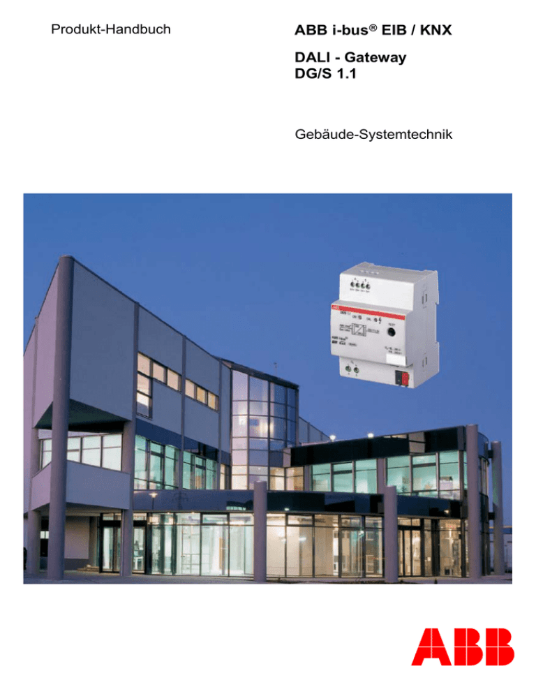 Produkt-Handbuch ABB i-bus EIB / KNX DALI - Gateway DG/S 1.1 Gebäude-Systemtechnik ABB Dieses Handbuch beschreibt die Funktion des 1fach DALI Gateway mit seinem Anwendungsprogrammen "Dimmen Slave Lichtszenen Dynamik 1f/1". Technische Änderungen und Irrtümer sind vorbehalten. Haftungsausschluss: Trotz Überprüfung des Inhalts dieser Druckschrift auf Übereinstimmung mit der Hardund Software können Abweichungen nicht vollkommen ausgeschlossen werden. Daher können wir hierfür keine Gewähr übernehmen. Notwendige Korrekturen fließen in neue Versionen des Handbuchs ein. Bitte teilen Sie uns Verbesserungsvorschläge mit. ABB i-bus EIB / KNX DG/S 1.1, DALI-Gateway Inhalt 1 Allgemein Seite 1 1.1 Produkt- und Funktionsübersicht..........................................................2 1.2 DALI allgemein......................................................................................3 1.2.1 DALI Systembeschreibung.................................................................3 1.2.2 DALI Funktionsbeschreibung .............................................................5 1.2.3 Verhalten DALI-Geräte bei Betriebsspannungswiederkehr ...............5 1.2.4 Verhalten DALI-Geräte bei DALI-Spannungsausfall..........................5 1.3 ABB i-bus® DALI-Gateways DG/S .......................................................6 1.3.1 DALI-Gateways DG/S 1.1 ..................................................................6 1.3.2 DALI-Gateways DG/S 8.1 ..................................................................9 2 Gerätetechnik 11 2.1 2.2 2.3 2.4 2.5 2.6 2.7 2.8 2.9 2.10 Technische Daten DG/S 1.1 ...............................................................11 Anschlussbild DG/S 1.1 ......................................................................13 Maßbild DG/S 1.1 ...............................................................................13 Montage und Installation.....................................................................14 Inbetriebnahme ...................................................................................15 Vergabe der physikalischen EIB / KNX-Adresse................................15 Anzeige Elemente...............................................................................15 Manuelle Bedienung ...........................................................................16 Auslieferungszustand .........................................................................16 Wartung und Reinigen ........................................................................16 3 Inbetriebnahme 17 3.1 DALI - Inbetriebnahme........................................................................17 3.1.1 Testen der DALI-Geräte mit der ETS...............................................17 3.1.2 DALI-Zuordnung durch gezieltes Anschließen der DALI-Geräte.....17 3.1.3 DALI-Zuordnung mit separaten DGS11-Software-Tool ...................18 3.2 EIB / KNX – Inbetriebnahme...............................................................19 3.3 Überblick .............................................................................................19 3.4 Parameterfenster ................................................................................19 3.4.1 Parameterfenster „Allgemein" ..........................................................20 3.4.2 Parameterfenster „Teilnehmer Kanal A" ..........................................25 3.4.2.1 Betriebsart "Normal" ......................................................................26 3.4.2.2 Betriebsart "Dynamik"....................................................................30 3.4.2.3 Betriebsart "Slave".........................................................................34 3.4.3 Parameterfenster „Teilnehmer Kanal B" ..........................................35 3.4.4 Parameterfenster „Zentralfunktion A&B“..........................................36 3.4.5 Parameterfenster „Dynamikverlauf“ .................................................40 3.4.6 Parameterfenster „Szenen“..............................................................42 3.4.7 Parameterfenster „Status“................................................................46 3.5 Kommunikationsobjekte......................................................................49 3.5.1 Kommunikationsobjekte für den gesamten Kanal............................51 3.5.2 Kommunikationsobjekte für jeden DALI-Teilnehmer........................54 3.5.3 Lichtszenen Kommunikationsobjekte...............................................58 3.5.4 Kommunikationsobjekte für individuellen Teilnehmer im Kanal A ...61 3.5.5 Allgemeine Kommunikationsobjekte ................................................63 © 2006 ABB STOTZ-KONTAKT GmbH 1 ABB i-bus EIB / KNX © 2006 ABB STOTZ-KONTAKT GmbH DG/S 1.1, DALI-Gateway 4 Planung und Anwendung 66 4.1 4.2 4.3 4.4 4.5 4.6 4.7 4.8 4.9 4.10 4.11 4.12 Handbedienung / Test-Funktion .........................................................66 Ansteuerung der DALI Teilnehmer .....................................................67 Überwachung von Lampen und EVG .................................................69 Austausch von DALI Teilnehmer ........................................................70 Einbrennzeiten ....................................................................................71 8-Bit-Szene .........................................................................................72 Farbiges Licht mit LED-Technik und DALI .........................................74 Treppenlichtfunktion mit Dynamikverlauf............................................75 Facility Management...........................................................................79 Belegung Tastsensor..........................................................................80 Verhalten bei Spannungsausfall .........................................................82 Verhalten bei Spannungswiederkehr..................................................