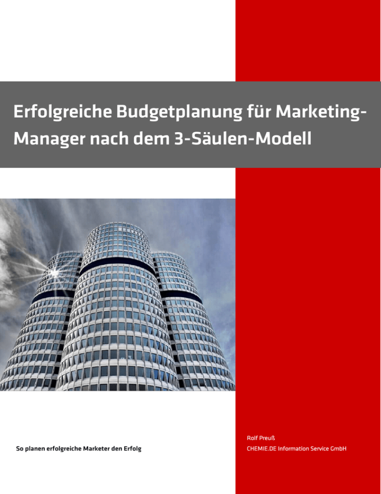 Erfolgreiche Budgetplanung für MarketingManager nach dem 3-Säulen-Modell Rolf Preuß So planen erfolgreiche Marketer den Erfolg CHEMIE.DE Information Service GmbH Erfolgreiche Budgetplanung für Marketing-Manager nach dem 3-Säulen-Modell 2 Inhalt 1. Zusammenfassung ..................................................................... 4 2. Tappen Sie als Marketer nicht in die Falle ................................. 5 3. Alles hat seinen Anfang im Internet .......................................... 5 4. Erfolgreiche Budgetplanung nach dem Drei-Säulen-Modell .... 6 4.1 Ziel: Was wollen Sie erreichen? .............................. 6 4.1.1 Marketingziel: Wie viele Sales Leads benötigen Sie, um das Umsatzziel zu erreichen? ........................... 7 4.2 Strategien: Wie wollen Sie die Ziele erreichen? .... 8 4.3 Taktische Maßnahmen: Womit wollen Sie das Marketingziel erreichen? ......................................... 8 5. Die Sichtbarkeit für das eigene Unternehmen und dessen Produkte erhöhen ................................................................................ 9 5.1 Eine Firmenpräsentation auf Online-Portalen macht Ihr Unternehmen weithin sichtbar.............. 9 5.2 Anzeigen-Banner wirken besser und kosten weniger als Print-Anzeigen .................................... 11 5.3 Mit direkter Produktwerbung das Umsatzziel erreichen .................................................................. 12 5.3.1 Eigene Adressen für die Werbung nutzen ............ 12 5.3.2 Mit fremden Adressen erhöhen Sie die Reichweite Ihrer Werbung .........................................................14 6. Was kostet erfolgreiche Werbung?........................................... 15 7. Fazit .............................................................................................16 Über den Autor ....................................................................... 17 Über CHEMIE.DE Information Service® ................................ 17 Bildnachweise: Seite 1: Paul Bergmeir Seite 9: Joshua Hibbert Erfolgreiche Budgetplanung für Marketing-Manager nach dem 3-Säulen-Modell 3 1. Zusammenfassung Erfolgreiche Marketer planen den Erfolg und setzen zielgerichtete Marketing-Maßnahmen ein. Mit einer durchdachten Planung nach dem 3-Säulen-Modell legen Sie den Grundstein, um die Umsatzziele zu erreichen: 1. Erhöhen Sie die allgemeine Sichtbarkeit für Ihr Unternehmen und dessen Produkte. 2. Informieren Sie Bestandskunden und Interessenten, die Sie in Ihrem Customer-Relationship-Management-System (CRM) haben. 3. Investieren Sie in gute Sichtbarkeit. Dadurch stärken Sie die Marke, locken Interessenten an und gewinnen Sales Leads für den Vertrieb. 4. Eine gut gemachte Firmenpräsentation auf Fachportalen erhöht die Sichtbarkeit Ihres Unternehmens beträchtlich und generiert Anfragen. 5. Vergessen Sie Print-Anzeigen. Anzeigen-Banner sind um den Faktor 2,5 günstiger als Anzeigen in Fachmagazinen und erreichen Interessenten dort, wo sie nach Informationen suchen: im Internet. 6. Mit einem professionellen E-Newsletter erreichen Sie Ihr Werbeziel für 1/5 der Kosten im Vergleich zum klassischen Post-Mailing. 7. Lassen Sie sich von Experten eine Kampagne entwickeln. Dann wird die Wirkung der Bausteine verstärkt und Sie erhalten mehr Sales Leads als bei isolierten Einzelmaßnahmen. 8. Kämpfen Sie für ein Marketing-Budget von mind. 1 % des Umsatzes. Kleinere Unternehmen müssen eher 3 % vom Umsatz in Marketing-Kommunikation investieren. Sonst werden Sie die Erwartungen in Ihre Arbeit nicht erfüllen können. Erfolgreiche Budgetplanung für Marketing-Manager nach dem 3-Säulen-Modell 4 2. Tappen Sie als Marketer nicht in die Falle Der stolze Entwickler kennt sein neues Werk in- und auswendig, der Geschäftsführer ist begeistert von der Technik und sieht im Stillen schon den Umsatz explodieren. Lassen Sie sich nicht beeinflussen von internen Aussagen wie „Unser neues Produkt ist so gut, das verkauft sich von alleine.“ Potenzielle Kunden werden von diesem Wunderwerk der Technik nie erfahren, wenn Sie im Marketing nichts tun. Fazit: Kämpfen Sie für ein Marketingbudget, das im B2B bei 1 %– 3 % vom Umsatz liegt. Das hilft Ihrem Unternehmen und Ihnen. Denn sonst werden Ihnen am Ende Vertrieb und Geschäftsleitung zu Recht Vorwürfe machen, wenn zu wenig Sales Leads in die Pipeline gelangt sind. 3. Alles hat seinen Anfang im Internet Inzwischen beginnen über 80 % der Käufe im B2B mit einer Recherche im Internet1. Ohne eigene Website ist ein Unternehmen unsichtbar für potenzielle Kunden. Aber auch eine Firmen-Website stößt schnell an Grenzen, weil sie aus dem Blickwinkel des Unternehmens aufgebaut ist. Die Nutzer haben darunter zu leiden. Einige besonders schwere Fehler sind: die Website gibt es nur in Englisch Seitenbesucher müssen endlos klicken, um an eine Information zu gelangen Kontaktdaten der Firma sind auf der Website nicht zu finden Kontaktformulare enthalten überflüssige Pflichtfelder Als Konsequenz bekommt das Unternehmen weniger Anfragen als erhofft, und Interessenten erhalten einen schlechten Eindruck. Beides ist Gift für Ihre Umsatzziele. 1 https://www.thinkwithgoogle.com/articles/the-changing-face-b2b-marketing.html Erfolgreiche Budgetplanung für Marketing-Manager nach dem 3-Säulen-Modell 5 Fazit: Erfolgreiche Unternehmen haben Websites, die optimiert sind für Kunden und Interessenten. Diese Unternehmen investieren kontinuierlich in erhöhte Sichtbarkeit im Markt. Nur so lassen sich Umsatzziele in Märkten mit vielen Wettbewerbern erreichen. 4. Erfolgreiche Budgetplanung nach dem DreiSäulen-Modell Wenn Sie kein Ziel haben, ist jede Marketingmaßnahme willkürlich. Das zeigt sich bei Unternehmen in Form von Aktionismus: „Wir wissen zwar nicht, warum wir das tun, aber wir sind aktiv.“ Die Grundlage für erfolgreiche Budgetplanung sind die drei Säulen Ziel, Strategie und taktische Maßnahmen. 4.1 Ziel: Was wollen Sie erreichen? Nur wenn Sie sich über Ihre