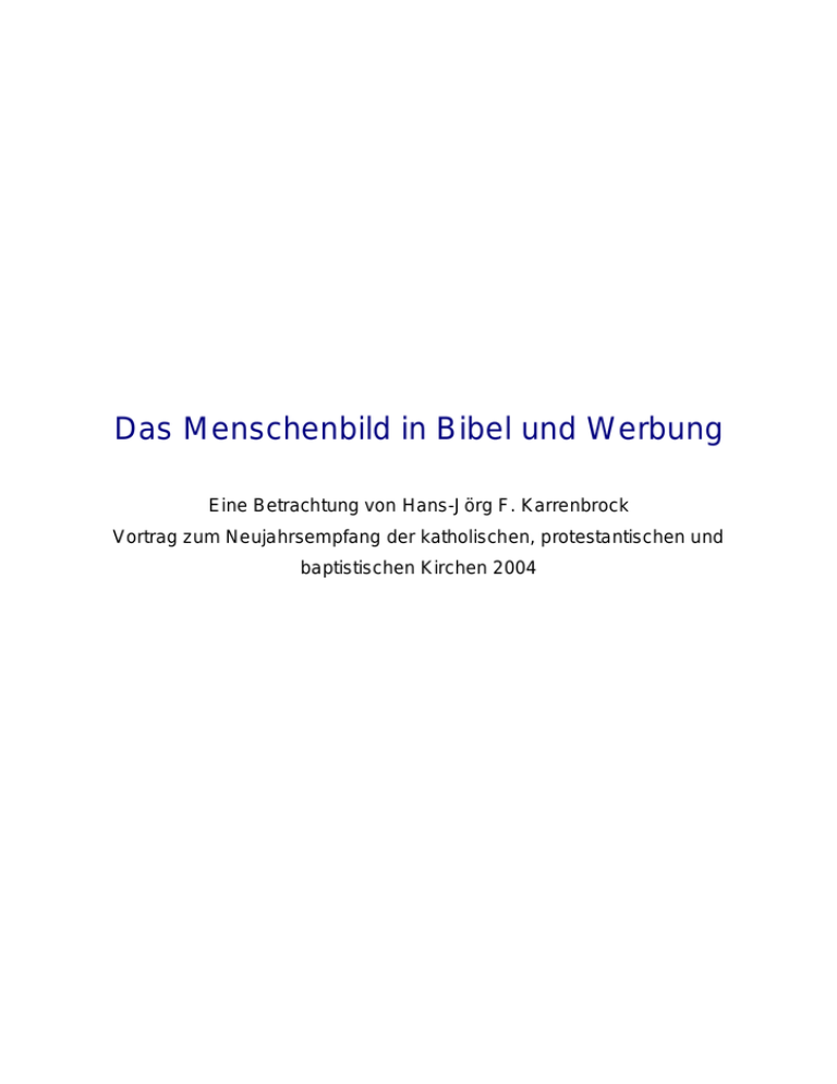 Das Menschenbild in Bibel und Werbung Eine Betrachtung von Hans-Jörg F. Karrenbrock Vortrag zum Neujahrsempfang der katholischen, protestantischen und baptistischen Kirchen 2004 Es ist eine gewaltige Botschaft, die der Welt da offenbart wird. Tag um Tag erreicht sie Milliarden von Menschen auf der ganzen Erde. Allein in Deutschland nehmen Zweidrittel aller Einwohner -vom Kleinkind bis zum Greis- jeden Tag diese Botschaft wahr: für etwas mehr als 7 Minuten. Um diese Botschaft unter das Volk zu bringen, werden enorme finanzielle Mittel aufgeboten: 29 Milliarden Euro allein für Deutschland in 2003, das ist mehr als im ganzen Jahr für Sozialleistungen ausgegeben wurde. Diese Botschaft beinhaltet ein Glücks-Versprechen, Orientierung, Hilfe und Zufriedenheit. Sie offeriert, will man ihr folgen, ein erfülltes Leben, Sorglosigkeit, Liebe, Schönheit, Anerkennung, Achtung und Würde. Doch es ist nicht die Botschaft Gottes, über die wir hier reden. Es ist die Werbebotschaft, die Reklame. Auf vielfältigste Weise kommen wir mit ihr in Berührung: auf Plakaten, in Prospekten und Anzeigen, im Radio, Fernsehen und Kino, am Straßenrand, daheim, in der Bahn, in Geschäften und Fußgängerzonen... kurz: überall, wo unsere Sinne ansprechbar sind, ist Werbung. Und diese Werbung hat das Denken und Handeln der Menschen zunehmend verändert. Weil steter Tropfen jeden Stein höhlt, sickerten die Botschaften und Lebensorientierungen mehr und mehr in unser Bewußtsein. Kaum jemand -eigentlich niemand- kann sich den Werten entziehen, die da vermittelt werden. Die Werbung bietet Vorbilder und Weltbilder, Ansichten und Einsichten, Sinn und Aufgabe. Damit vermittelt sie ein Menschenbild, das unsere 'Sicht auf uns' selbst verändert hat. Das Menschenbild in der Werbung. Unser Thema. Seite 2 Copyright Hans-Jörg F. Karrenbrock, Tel. +49-700-52773627, [email protected] Zitat nur unter Nennung des Autors; Belegexemplar erbeten. Bevor wir betrachten, wie das Menschenbild in der Werbung aussieht und inwieweit es dem Bild des Menschen in der Heiligen Schrift entspricht (oder eben auch nicht), sollten wir einen Moment darüber nachdenken, wie Werbung funktioniert. Einfach nämlich! Werbebotschaften sind ein in sich geschlossenes Argumentationsprinzip: Zunächst wird eine Sehnsucht geweckt und dann sofort erfüllbar gemacht. Vor 35 Jahren legte die westfälische Firma Storck eine solche Argumentation beispielhaft vor: "Wenn Sie nichts so sehr lieben, wie Ihr Kind, und Ihr Kind nichts so sehr liebt, wie Bonbons, geben Sie ihm Nimm' Zwei." Diese perfide Kausalkette ist unwiderlegbar: alle Eltern lieben ihre Kinder, alle Kinder lieben Süßigkeiten, also... Andersherum argumentiert: Geben Sie Ihrem Kind keine Nimm-Zwei-Bonbons, lieben Sie es nicht! Wer will sich das schon vorwerfen lassen?! Besonders praktisch: Ich kann den Beweis meiner Kinderliebe für ein paar Euro kaufen, ohne mich persönlich engagieren zu müssen. Nicht etwa Aufmerksamkeit, Zuwendung, Vorbild und Auseinandersetzung sind nötig, um die Liebe zu meinen Kindern zu entwickeln und unter Beweis zu stellen, sondern eine Ware übernimmt diese höchst-elterliche Aufgabe. Seite 3 Copyright Hans-Jörg F. Karrenbrock, Tel. +49-700-52773627, [email protected] Zitat nur unter Nennung des Autors; Belegexemplar erbeten. Die Reihe solcher einfachen Kausalketten ist beliebig fortsetzbar: Wer in die Luft zu gehen droht, raucht HB. Von Tilly wissen wir, dass eine Frau nur mit gepflegten Händen geheiratet wird. Von Clementine, dass weiße Wäsche ein Garant für ein friedvolles Familienleben ist. Von Frau Sommer, dass Omas inniglich geliebt und geachtet werden, wenn sie Jacobs Cafe auf den Tisch bringen. Ganz so platt und durchschaubar blieben aber die Werbebotschaften nicht. Im Laufe der Jahrzehnte haben sich die Werbeaussagen massiv geändert. Dadurch, daß eine Vielzahl vergleichbarer Produkte und Dienstleistungen auf den Markt kam, genügte es nicht mehr, den Wunsch nach dem eigentlichen Produkt und dessen Eigenschaften zu wecken, sondern den Bedarf weiter zu fassen: Das Bedürfnis nach Geborgenheit und Liebe, Wegweisung und Orientierung, Ordnung und Sicherheit, Selbstbehauptung, Erfüllung und Sinngabe wird an das Produkt gekoppelt. Sie sind alleine und wünschen sich einen Partner? Mit Axe-Deospray und Calgonit klappt es auch mit dem Nachbarn. Liebe ist plötzlich kein Geschenk, kein Wunder, keine Gnade mehr, die (verdient oder nicht) gewährt wird, sondern Liebe ist planbar. Erfolg ist eine Frage der Kleidung, Klugheit beweise ich durch die richtige Wahl meiner Bank, Lebensorientierung finde ich in der richtigen Frauenzeitschrift und zu einem erfüllten Lebensabend gehört ein Bausparvertrag und ein 3-Phasen-Reiniger. Seite 4 Copyright Hans-Jörg F. Karrenbrock, Tel. +49-700-52773627, [email protected] Zitat nur unter Nennung des Autors; Belegexemplar erbeten. Solch simple Verknüpfungen funktionieren auch, wenn das Produkt gar nicht benötigt wird. Vor einigen Jahren erklärte mir ein Fünfjähriger in Frankfurt, er wünsche sich zu seinem Geburtstag einen O.B.-Tampon, weil man damit Reiten und Schwimmen und Radfahren kann. Das klingt jetzt erst einmal lustig, wirft aber ein interessantes Bild auf die Wirksamkeit verknüpfter Werbeargumente. Sie suggerieren die Lösung vielfältiger Probleme und substituieren die eigene Auseinandersetzung mit den zentralen Fragen des Lebens durch Konsum. Ein Beispiel: Hermann W. ist Beamter im Katasteramt Neuss. Als Kind wollte er eigentlich Cowboy werden, nach Amerika auswandern und viele Abenteuer bestehen. "Das schlag Dir mal aus dem Kopf!", bremsten die Eltern seine Vision. "Onkel Heinz kann Dir eine Stelle beim Katasteramt besorgen. Da bist Du auf der sicheren Seite." (Gerne wird als Lebensalternative auch die obligatorische Banklehre, die Übernahme des elterlichen Unternehmens oder das zunächst abzuschließende JuraStudium angeführt.) Nach dem Bild des Menschen in der Bibel wäre es aber notwendig, Hermann W. zu erm