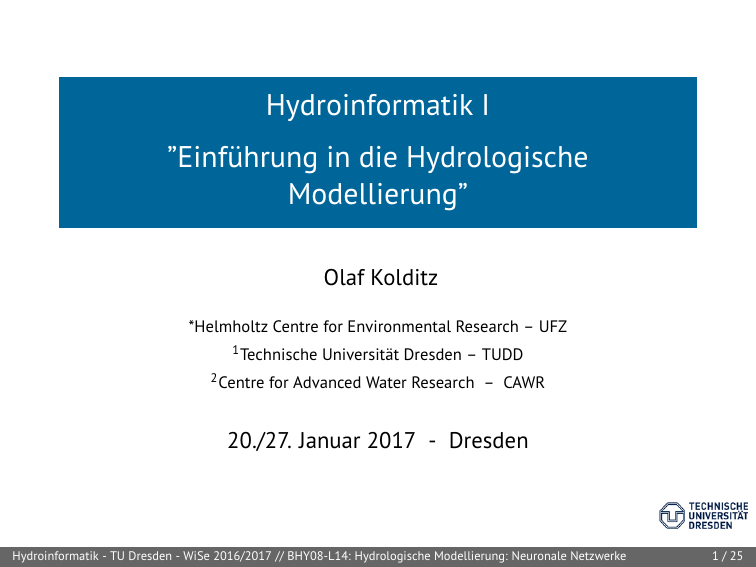 Hydroinformatik I ”Einführung in die Hydrologische Modellierung” Olaf Kolditz *Helmholtz Centre for Environmental Research – UFZ 1 Technische 2 Centre Universität Dresden – TUDD for Advanced Water Research – CAWR 20./27. Januar 2017 - Dresden Hydroinformatik - TU Dresden - WiSe 2016/2017 // BHY08-L14: Hydrologische Modellierung: Neuronale Netzwerke 1 / 25 Übersicht 1 Hydrologische Modelle: Definition 2 Künstliche Neuronale Netzwerke (ANN) 3 Künstliche Neuronale Netzwerke in der Hydrologie 4 Mesoskalige Hydrologische Modellierung (mHM) 5 Anwendungen Hydroinformatik - TU Dresden - WiSe 2016/2017 // BHY08-L14: Hydrologische Modellierung: Neuronale Netzwerke 2 / 25 Modell-Begriff Hydroinformatik - TU Dresden - WiSe 2016/2017 // BHY08-L14: Hydrologische Modellierung: Neuronale Netzwerke 3 / 25 Hydrologische Modelle Definition ”Hydrologisches Modell: Vereinfachte Beschreibung der in einem hydrologischen System ablaufenden physikalischen, chemischen und biologischen Prozesse (hydrologischer Prozeß) oder Teilprozesse mit Hilfe mathematischer Gleichungen. Diese werden zeitlich und räumlich so miteinander verknüpft, wie sie in der Natur ablaufen.” Source: http://www.spektrum.de/lexikon/geowissenschaften/hydrologisches-modell/7239 Hydroinformatik - TU Dresden - WiSe 2016/2017 // BHY08-L14: Hydrologische Modellierung: Neuronale Netzwerke 4 / 25 Hydrologische Modelle Definition I ”Je nach Berücksichtigung des zeitlichen Verhaltens wird zwischen stationären und instationären Modellen unterschieden. I Weitere Unterscheidungen erfolgen nach den Lösungsverfahren der mathematischen Gleichungen in analytische und numerische Modelle, I nach Berücksichtigung zufallsbedingter Systemänderungen in stochastische und deterministische Modelle, I nach der Abhängigkeit der Modellparameter vom momentanen Systemzustand in lineare und nichtlineare Modelle.” Source: http://www.spektrum.de/lexikon/geowissenschaften/hydrologisches-modell/7239 Hydroinformatik - TU Dresden - WiSe 2016/2017 // BHY08-L14: Hydrologische Modellierung: Neuronale Netzwerke 5 / 25 Hydrologische Modelle Definition ”Die deterministischen Modelle werden in drei Hauptgruppen unterteilt, wobei der Grad der Kausalität in Form der Ursachen-Wirkungs-Beziehung Beachtung findet: 1 physikalische Modelle (White-Box-Modelle), die auf den Grundgesetzen der Physik, insbesondere der Hydro- und Thermodynamik, der Chemie und der Biologie beruhen, 2 konzeptionelle Modelle (Grey-Box-Modelle), die sich auf die physikalischen Gesetze in vereinfachter Näherung stützen und ein gewisses Maß an Empirie enthalten und 3 Modelle der Black-Box, die unter Vernachlässigung der physikalischen Grundgesetze nur Ursachen-Wirkungsbeziehungen zwischen den Systemeinund Systemausgaben betrachten.” Source: http://www.spektrum.de/lexikon/geowissenschaften/hydrologisches-modell/7239 Hydroinformatik - TU Dresden - WiSe 2016/2017 // BHY08-L14: Hydrologische Modellierung: Neuronale Netzwerke 6 / 25 Künstliche Neuronale Netzwerke ANN Hydroinformatik - TU Dresden - WiSe 2016/2017 // BHY08-L14: Hydrologische Modellierung: Neuronale Netzwerke 7 / 25 Künstliche Neuronale Netzwerke Definition ”Künstliche neuronale Netze, auch künstliche neuronale Netzwerke, kurz: KNN (engl. artificial neural network, ANN), sind Netze aus künstlichen Neuronen. Sie sind Forschungsgegenstand der Neuroinformatik und stellen einen Zweig der künstlichen Intelligenz dar. Die künstlichen neuronalen Netze haben, ebenso wie künstliche Neuronen, ein biologisches Vorbild. Man stellt sie den natürlichen neuronalen Netzen gegenüber, welche Nervenzellvernetzungen im Gehirn und im Rückenmark bilden. Doch geht es mehr um eine Abstraktion (Modellbildung) von Informationsverarbeitung und weniger um das Nachbilden biologischer neuronaler Netze, was eher Gegenstand der Computational Neuroscience ist.” Source: https://de.wikipedia.org/wiki/Künstliches_neuronales_Netz Hydroinformatik - TU Dresden - WiSe 2016/2017 // BHY08-L14: Hydrologische Modellierung: Neuronale Netzwerke 8 / 25 Künstliche Neuronale Netzwerke Definition In künstlichen neuronalen Netzen bezeichnet die Topologie die Struktur des Netzes. Damit ist im Allgemeinen gemeint, wie viele künstliche Neuronen sich auf wie vielen Schichten befinden, und wie diese miteinander verbunden sind. Künstliche Neuronen können auf vielfältige Weise zu einem künstlichen neuronalen Netz verbunden werden. Dabei werden Neuronen bei vielen Modellen in hintereinander liegenden Schichten (englisch layers) angeordnet; bei einem Netz mit nur einer trainierbaren Neuronenschicht spricht man von einem einschichtigen Netz. Source: https://de.wikipedia.org/wiki/Künstliches_neuronales_Netz Hydroinformatik - TU Dresden - WiSe 2016/2017 // BHY08-L14: Hydrologische Modellierung: Neuronale Netzwerke 9 / 25 Künstliche Neuronale Netzwerke Definition Unter Verwendung eines Graphen können die Neuronen als Knoten und ihre Verbindungen als Kanten dargestellt werden. Die Eingaben werden gelegentlich auch als Knoten dargestellt. Die hinterste Schicht des Netzes, deren Neuronenausgaben meist als einzige außerhalb des Netzes sichtbar sind, wird Ausgabeschicht (engl. output layer) genannt. Davorliegende Schichten werden entsprechend als verdeckte Schicht (engl. hidden layer) bezeichnet. Source: https://de.wikipedia.org/wiki/Künstliches_neuronales_Netz Hydroinformatik - TU Dresden - WiSe 2016/2017 // BHY08-L14: Hydrologische Modellierung: Neuronale Netzwerke 10 / 25 Künstliche Neuronale Netzwerke Definition Hydroinformatik - TU Dresden - WiSe 2016/2017 // BHY08-L14: Hydrologische Modellierung: Neuronale Netzwerke 11 / 25 Künstliche Neuronale Netzwerke Definition Abb. (1) zeigt ein typisches, aus drei Schichten bestehendes KNN (eine Eingangsschicht, eine versteckte Schicht und eine Ausgangsschicht). Jedes Neuron des Netzes verarbeitet die ankommenden Eingaben zu einer Ausgabe. Diese Ausgabe wird dann mit anderen Neuronen verknüpft. Die Informationen g