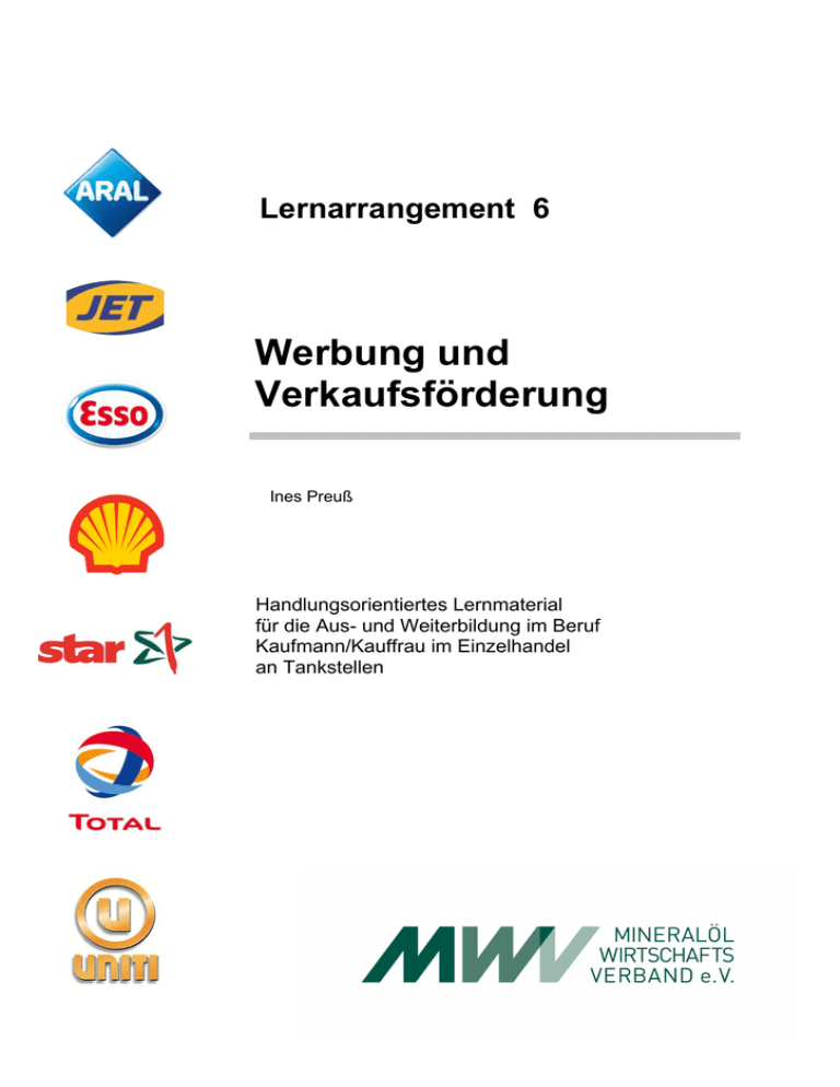 Lernarrangement 6 Werbung und Verkaufsförderung Ines Preuß Handlungsorientiertes Lernmaterial für die Aus- und Weiterbildung im Beruf Kaufmann/Kauffrau im Einzelhandel an Tankstellen Lernarrangements für die Aus- und Weiterbildung von Einzelhändlern an Tankstellen Heft 1: Heft 2: Heft 3: Heft 4: Heft 5: Heft 6: Heft 7: Heft 8: Heft 9: Heft 10: Heft 11: Heft 12: Heft 13: Mein Ausbildungsbeginn Arbeitssicherheit an der Tankstelle Umweltschutz an der Tankstelle Bedeutung und Struktur des Einzelhandels Beratung und Verkauf Werbung und Verkaufsförderung Warenwirtschaftssystem Erfolgsorientiertes Beschaffen und Lagern Buchführen mit Erfolg Von der Einstellung bis zur Kündigung Hygiene im Umgang mit Lebensmitteln Kraftstoffe und Motorenöle Starterbatterien und Reifen Folgende Symbole dienen der Orientierung in den Lernarrangements: Mit bereits erworbenem Wissen beantworten Sie eigenständig Fragen, führen Berechnungen durch und beurteilen Ergebnisse. Ihre Antworten können Sie in den interaktiven Antwortfeldern, z.B. mit dem Adobe-Reader, erfassen und speichern. Nummerierte Aufgaben, z.B. 6.22 verweisen auf eine entsprechende Lösung in den Lösungshinweisen. Bitte nutzen Sie diese Lösungen zur Korrektur und Verbesserung Ihrer Kenntnisse. Sie lösen durch aktives und kreatives Handeln Aufgaben. Dabei ist es teilweise erforderlich, den eigenen Betrieb mit Mitbewerbern zu vergleichen, Bekanntes auf Neues zu übertragen, Zusammenhänge zu erkennen und Schlussfolgerungen zu ziehen. Ihnen wird das Nachschlagen in einem Fachbuch oder im Anhang empfohlen, wenn zur Bearbeitung der Aufgaben auf bereits an anderer Stelle erworbenes Wissen aufgebaut wird. Sie unterstützen Herrn Oilmann bei seinen unternehmenspolitischen Aktivitäten. Sie erhalten Verweise auf andere Lernarrangements. Liebe Leserinnen und Leser, der Einfachheit halber verwenden wir in diesem Lernarrangement immer nur die männliche Form sämtlicher Personen. Heft 6: Werbung und Verkaufsförderung Autorin: Ines Preuß Bearbeitung: Ines Preuß unter Mitarbeit von Petra Walldorf Wertvolle Unterstützung gaben die Mitglieder des Arbeitskreises „Ausbildung an Tankstellen“ des Mineralölwirtschaftsverbandes e. V.. Mineralölwirtschaftsverband e. V. Alle Rechte vorbehalten. Das Lernarrangement darf nicht ohne Zustimmung des Mineralölwirtschaftsverbandes e. V. vervielfältigt, abgebildet, übersetzt und verbreitet werden. Aktualisierte Ausgabe 2012 MWV Werbung und Verkaufsförderung Inhalt 1 Voraussetzungen erfolgreichen Verkaufens 4 2 Werbung im Einzelhandel 6 Werbung - kurz gesagt Ziele Wirkungsweise Grundsätze Gesetzliche Grundlagen Werbearten Werbemittel und Werbeträger Werbeplanung Werbeerfolgskontrolle 3 Verkaufsfördernde Maßnahmen Verkaufsförderung gleich Werbung? Serviceleistungen Produktinformation Warenpräsentation Wirkung des Shops 6 7 8 10 12 19 22 26 28 29 29 31 35 38 58 4 Werbung und Verkaufsförderung bei Mitbewerbern 63 5 Meine Ideen 67 Ideen für den eigenen Ausbildungsbetrieb Meine Aktion Mein Verkaufsraum 67 68 70 Anhang Literaturverzeichnis Lösungshinweise 3 Voraussetzungen erfolgreichen Verkaufens 1 Voraussetzungen erfolgreichen Verkaufens Kunden Ware Werbung Verkaufsförderung Shop Verkaufspersonal 4 Voraussetzungen erfolgreichen Verkaufens Im Lernarrangement 4 „Bedeutung und Struktur des Einzelhandels“ wurde bereits Grundsätzliches zu wichtigen Standortfaktoren und zur Sortimentsgestaltung erarbeitet. Im Lernarrangement 5 „Beratung und Verkauf“ steht alles im Mittelpunkt, was unmittelbar mit dem Verkaufspersonal und dem Kunden zusammenhängt. Wichtige Fachkenntnisse zu Kraftstoffen, Motorenölen, Starterbatterien und Reifen können Sie sich in der Erarbeitung der Lernarrangements 12 und 13 aneignen und in Übungen zu Werbung und Verkaufsförderung einbeziehen. In diesem Heft geht es um Werbung und Verkaufsförderung. Das Verkaufsgespräch als eine sehr wichtige verkaufsfördernde Maßnahme wird hier nicht mehr behandelt, da es im Heft 5 einen Schwerpunkt bildete. Herrn Oilmann konnten Sie bereits in anderen Lernarrangements dieser Reihe1) begegnen und sich mit wichtigen Tätigkeiten in seinem Unternehmen befassen. Er ist gelernter Kaufmann im Einzelhandel und betreibt eine Tankstelle am Rande einer Großstadt. Herr Oilmann hatte schon lange davon geträumt, mit einem eigenen Unternehmen den Autofahrern das Leben noch schöner zu machen. Eine Kombination von Tankstelle, Service und Verkauf - das sollte es sein. Die Wahl des Standortes, des Sortiments, der Betriebsform und der Verkaufsform waren ebenso gut zu überlegen wie die Möglichkeit der Zusammenarbeit mit einer Mineralölgesellschaft. Er hat bisher gute Bedingungen vorgefunden und richtige Entscheidungen getroffen. In diesem Heft erleben Sie seine Aktivitäten in Sachen Werbung und Verkaufsförderung. _______________________________________________________________ 1) Hefte 4, 8, 9, 10 der Lernarrangements für die Aus- und Weiterbildung von Kaufleuten im Einzelhandel an Tankstellen (siehe Titel S. 2) 5 Werbung im Einzelhandel: Werbung – kurz gesagt 2 Werbung im Einzelhandel Werbung – kurz gesagt Werbung begegnet uns im täglichen Leben so häufig, dass wir sie oft gar nicht mehr wahrnehmen. Was fällt Ihnen spontan ein, wenn Sie an den Begriff Werbung denken? Viele Menschen denken sofort - wie Sie vielleicht auch gerade - an einen besonders eingängigen Fernsehspot. Aber Werbung ist viel, viel mehr! Sie stellt immer eine Verbindung zwischen einem Anbieter (Hersteller oder Händler) und den Kunden als Verbraucher her. Durchdenken Sie bitte die folgende Definition aus einem Fachbuch: Werbung ist ein „bewusster Versuch, Menschen durch den Einsatz spezifischer Kommunikationsmittel zu einem bestimmten, absatzwirtschaftlichen Zwecken dienenden Verhalten zu bewegen“ (Nieschlag 1994, Seite 1085). Definitionen fassen viele Merkmale mit wenigen Worten zusammen. Oft erschließt sich erst bei genauem oder mehrfachem Lesen der ganze Inhalt. 