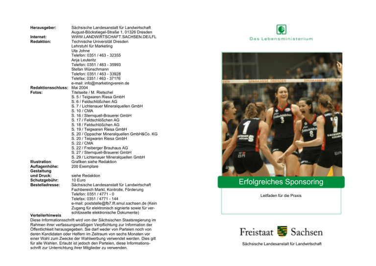 Herausgeber: Sächsische Landesanstalt für Landwirtschaft August-Böckstiegel-Straße 1, 01326 Dresden Internet: WWW.LANDWIRTSCHAFT.SACHSEN.DE/LFL Redaktion: Technische Universität Dresden Lehrstuhl für Marketing Uta Johne Telefon: 0351 / 463 - 32355 Anja Leuteritz Telefon: 0351 / 463 - 35993 Stefan Wünschmann Telefon: 0351 / 463 - 33928 Telefax: 0351 / 463 - 37176 e-mail: [email protected] Redaktionsschluss: Mai 2004 Fotos: Titelseite / M. Rietschel S. 5 / Teigwaren Riesa GmbH S. 6 / Feldschlößchen AG S. 7 / Lichtenauer Mineralquellen GmbH S. 10 / CMA S. 16 / Sternquell-Brauerei GmbH S. 17 / Feldschlößchen AG S. 18 / Feldschlößchen AG S. 19 / Teigwaren Riesa GmbH S. 20 / Oppacher Mineralquellen GmbH&Co. KG S. 20 / Teigwaren Riesa GmbH S. 22 / CMA S. 22 / Freiberger Brauhaus AG S. 27 / Sternquell-Brauerei GmbH S. 29 / Lichtenauer Mineralquellen GmbH Illustration: Grafiken siehe Redaktion Auflagenhöhe: 200 Exemplare Gestaltung und Druck: siehe Redaktion Schutzgebühr: 10 Euro Bestelladresse: Sächsische Landesanstalt für Landwirtschaft Fachbereich Markt, Kontrolle, Förderung Telefon: 0351 / 4771 - 0 Telefax: 0351 / 4771 - 144 e-mail: [email protected] (Kein Zugang für elektronisch signierte sowie für verschlüsselte elektronische Dokumente) Verteilerhinweis Diese Informationsschrift wird von der Sächsischen Staatsregierung im Rahmen ihrer verfassungsmäßigen Verpflichtung zur Information der Öffentlichkeit herausgegeben. Sie darf weder von Parteien noch von deren Kandidaten oder Helfern im Zeitraum von sechs Monaten vor einer Wahl zum Zwecke der Wahlwerbung verwendet werden. Dies gilt für alle Wahlen. Erlaubt ist jedoch den Parteien, diese Informationsschrift zur Unterrichtung ihrer Mitglieder zu verwenden. Erfolgreiches Sponsoring Leitfaden für die Praxis Sächsische Landesanstalt für Landwirtschaft Dieses Projekt entstand in Kooperation mit: Lehrstuhl für Marketing Technische Universität Dresden Sächsisches Staatsministerium für Umwelt und Landwirtschaft Vorwort Gerade kleine und mittelständische Unternehmen sind kaum in der Lage, durch klassische Werbung einen konkurrenzfähigen Werbedruck zu entfalten. Sponsoring bietet ihnen die Chance, die Zielgruppe zu erreichen, neue Produkte bekannt zu machen und das Image ihrer Erzeugnisse zu verbessern. Vor diesem Hintergrund verwundert es kaum, dass zahlreiche Unternehmen der sächsischen Land- und Ernährungswirtschaft im Rahmen einer jährlichen Befragung der Sächsischen Landesanstalt für Landwirtschaft ihr Interesse am Thema „Sponsoring“ äußerten. Deshalb hat sich die Sächsische Landesanstalt entschieden, das Projekt „Gemeinsam zum Sponsoring-Erfolg“ ins Leben zu rufen. Unterstützt durch das Sächsische Staatsministerium für Umwelt und Landwirtschaft und die CMA Centrale MarketingGesellschaft der deutschen Agrarwirtschaft mbH erteilte sie den Auftrag nach einem Ausschreibungsverfahren dem Lehrstuhl für Marketing der Technischen Universität Dresden. Ziel des Projektes war es, Sponsoring-Aktivitäten verschiedener Unternehmen zu untersuchen. Aus den Ergebnissen ließ sich ableiten, aus welchen Gründen manche Sponsoren erfolgreich sind, andere dagegen ihre Ziele nicht erreichen. Dieser Leitfaden fasst zusammen, was Unternehmen beachten sollten, um erfolgreich als Sponsoren aufzutreten. Der ausführliche Berichtsband ist an der Sächsischen Landesanstalt für Landwirtschaft oder im Internet unter www.landwirtschaft.sachsen.de/LFL einzusehen. 32 1 Folgenden Sponsor-Nehmern danken wir herzlich für die entgegengebrachte Unterstützung 2. European Indoor Cup (Leichtathletik Verband Sachsen e.V.) Chemnitzer Fußballclub e.V. Chursächsische Veranstaltungs GmbH Dresden Monarchs e.V. Dresdner Eislöwen (BG ESCD Dresden GmbH) Dresdner Jugendsinfonieorchester (Heinrich-Schütz-Konservatorium Dresden e.V.) Energie Cottbus erdgas arena Riesa (VFG Riesa mbH) Erntedankfest Altmittweida Feldschlößchen Open 2003 Filmnächte am Elbufer (PAN GmbH) Sächsische Bobsportler (Die (Rad) Sport Vermarktungsgesellschaft XXL) SC 1911 Großröhrsdorf Sportcenter "Sportlive" Rammenau Stadtfest Chemnitz TC Blau Weiss Dresden-Blasewitz e.V. VfB Auerbach e.V. VfB Leipzig VfC Plauen Volleyballverein Leipzig e.V. Weihnachtsmarkt Löbau 2 31 Folgenden Sponsoren danken wir herzlich für Inhalt die entgegengebrachte Unterstützung Bäckerei und Konditorei Schwerdtner GmbH Bad Brambacher Mineralquellen GmbH & Co. KG Braustolz GmbH Dr. Quendt Backwaren GmbH Drebacher Fleischwaren GmbH Dresdner Backhaus GmbH Einsiedler Brauhaus GmbH Erzgebirgische Backwaren GmbH Feldschlößchen AG Fleisch- und Wurstwaren Girrbach Sachsen Freiberger Brauhaus AG Heinrichsthaler Milchwerke GmbH Kelterei Oese Köstritz-Wernesgrüner Vertriebs GmbH Krostitzer Brauerei GmbH Landskron Brauerei Görlitz GmbH Leipziger Brauhaus zu Reudnitz GmbH Lichtenauer Mineralquellen GmbH Margon Brunnen GmbH NaturMarkt GmbH Oppacher Mineralquellen GmbH & Co. KG Radeberger Exportbierbrauerei GmbH Radeberger Fleisch- und Wurstwaren Korch GmbH Sachsenmilch AG Sächsische Winzergenossenschaft Meißen e.G. Sächsisches Staatsministerium für Umwelt und Landwirtschaft Sächsisches Staatsweingut GmbH Schloss Wackerbarth Schiebocker Fleischverarbeitungsgesellschaft mbH Sternquell-Brauerei GmbH Teigwaren Riesa GmbH 30 1 Was bedeutet Sponsoring? 5 2 Welche Arten von Sponsoring gibt es? 6 3 Was spricht für Sponsoring? 7 4 Was spricht gegen Sponsoring? 8 5 Wie wurde vorgegangen? 9 6 Was kann Sponsoring erreichen? 11 7 Wie betreiben gute Sponsoren Marketing? 14 8 Wie ist erfolgreiches Sponsoring organisiert? 16 9 Wie tritt ein Sponsor richtig auf? 18 10 Wie arbeiten die Partner optimal zusammen? 21 11 Wie sponsern Unternehmen erfolgreich? (Checkliste) 23 3 Ist es möglich, mit den anderen Sponsoren bei der Zielgruppenansprache zusammenarbeiten (z.B. Sponsoren-Tage organisieren, gemeinsame Veranstaltungen außerhalb)? Lädt man wichtige Kunden und Meinungsführer ein (z.B. Freikarten, V