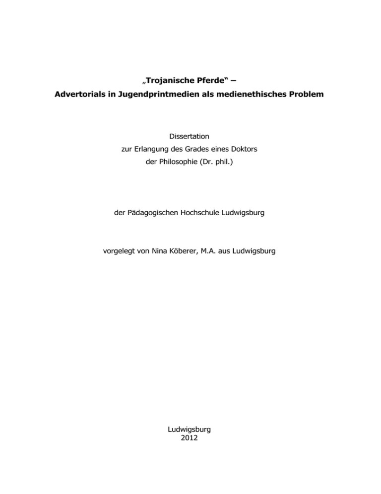„ F B C C ABCDEB FB C CC B F BF B C C BF B B A AB CD Dissertation zur Erlangung des Grades eines Doktors der Philosophie (Dr. phil.) der Pädagogischen Hochschule Ludwigsburg vorgelegt von Nina Köberer, M.A. aus Ludwigsburg Ludwigsburg 2012 B Erstgutachter: Prof. DDr. Matthias Rath Zweitgutachter: Prof. DDr. Matthias KarmasinC C C Datum des Abschlusses der mündlichen Prüfung: 13. Juni 2012 A C B C C C C C C C C! EEB B "C % C$BF B B A C ABC& A #C F FC$ C B C ' 2.1 Medienethik als angewandte Ethik 15 2.2 Medienethik als prinzipien4 und empiriegeleitete Ethik 23 2.2.1 Funktionen und Aufgaben der Medienethik 24 2.2.2 (Medien4)Ethik und Empirie 26 2.3 Bezugspunkte einer normativen Medienethik 27 2.3.1 Der (deskriptive) systemtheoretische Ansatz 29 2.3.2 Individual4 und sozialethische Dimensionen 31 2.3.3 Verantwortungsethische Perspektiven 32 2.3.4 Ethik der intersubjektiven Anerkennung 34 2.3.5 Rawls und Habermas: Verfahren medienethischer Begründung 36 2.4 Verantwortung als medienethisches Prinzip 39 2.4.1 Verantwortungsträger im medialen Handlungsfeld 40 2.4.2 Rollenbezogene Verantwortung der Medienakteure 42 2.5 Freiwillige Selbstkontrolle als medienethisches Konzept 44 2.5.1 Institutionalisierte Ethik: Medienselbstkontrolle 44 2.5.2 Stakeholder4Management als Ansatz einer Ethik der Medienunternehmen 47 (C A #C C AB C) F EB FC ' 3.1 Tätigkeiten und Aufgaben des Journalismus 52 3.2 Journalistische Ethik als Ethik des journalistischen Handlungsfeldes 54 3.3 Zur Konzeption einer Ethik öffentlicher Kommunikation 2.0 56 3.4 Professionsethische Betrachtungen 59 3.4.1 Journalistische Qualität als Aspekt journalistischer Ethik 60 3.4.2 Grundnormen und Praxiswerte des Journalismus 62 3.5 Institutionalisierte Selbstkontrolle des Pressewesens 65 I *C A #C C) F EB FCFB C+B C ,- 4.1 Merkmale und Funktionen von Werbung 70 4.2 Werbung als eigenständiges System 71 4.3 Werbung im Kontext aktueller Entwicklungen 73 4.4 Werbebotschaften above oder below the line 76 4.5 Systematische Überlegungen zur Konzeption der Werbeethik 77 4.5.1 Grundzüge der Werbeethik 77 4.5.2 Transparenz als Wert von Werbung 80 4.6 Institutionalisierte Selbstkontrolle im Bereich der Werbewirtschaft 'C F B C C. A B BC C+B C FC 81 C /* 5.1 Prozesse der Hybridisierung: Werbung auf den zweiten Blick 85 5.2 Advertorials als Sonderwerbeform 86 5.3 Sonderwerbeformen: Zur Trennung von Werbung und Redaktion 89 5.3.1 Rechtliche Regelungen und Vorschriften 90 5.3.2 Professionsethische Richtlinien 92 , C0& 12D BF B C C B F B B AC -3 6.1 Jugendprintmedien – ein Kategorisierungsversuch 98 6.2 Jugendprintmedien als Kulturgüter 101 6.3 Jugendprintmedien als Wirtschaftsgüter 102 6.3.1 Finanzierungsaspekte im Jugendprintbereich 103 6.3.2 Kombination von Print und Online: Werbung crossmedial 104 6.3.3 (Jugend4)Gratiszeitungen als Sonderfall 106 6.4 Jugendliche als Marktfaktor und als Zielgruppe von Werbung 108 6.5 Medienkompetenz als Werturteilskompetenz 110 3 C4 A FB C * 7.1 Wahl des Forschungsthemas 115 7.2 Rückbindung und Anschlussfähigkeit an die bestehende Forschung 117 7.3 Ausführung des empirischen Vorgehens 123 7.3.1 Formulierung der Forschungsziele und der Forschungsfragen 125 7.3.2 Methoden der Datenerhebung 126 7.3.2.1 Kriteriengestützte Inhaltsanalyse: YAEZ, SPIESSER und BRAVO 127 7.3.2.2 Semiotische Werbeanalyse der Advertorials 128 7.3.2.3 Quasi4Experiment zur Wahrnehmung von Werbung 129 7.3.2.4 Qualitative Leitfadeninterviews 130 7.3.3 Datenauswertung 132 II / C! B CFB C B BC (* 8.1 Inhaltsanalytische Auswertung von YAEZ, SPIESSER und BRAVO 134 8.1.1 Verteilung der Werbemittel in den Heften 135 8.1.2 Orientierung am Trennungsgrundsatz 152 8.1.3 Vergleich: Werbung in entgeltlichen Formaten und in Gratistiteln 155 8.2 Semiotische Werbeanalyse der Advertorials in den Heften 159 8.2.1 Gestaltung der Advertorials in den Heften 163 8.2.2 Vergleich: Bildung einer möglichen Typologie der Advertorials 175 8.3 Auswertung des Quasi4Experiments zur Wahrnehmung von Werbung 179 8.3.1 Wahrnehmung der Advertorials in der YAEZ 181 8.3.1.1 Altersspezifische Unterschiede 186 8.3.1.2 Genderspezifische Unterschiede 189 8.3.1.3 Schulartenspezifische Unterschiede 190 8.3.2 Wahrnehmung der Advertorials im SPIESSER 193 8.3.2.1 Altersspezifische Unterschiede 197 8.3.2.2 Genderspezifische Unterschiede 199 8.3.2.3 Schulartenspezifische Unterschiede 201 8.3.3 Zur Wahrnehmung der Advertorials in der YAEZ und im SPIESSER 204 8.4 Auswertung der qualitativen Leitfadeninterviews 208 8.4.1 Einstellung der Jugendlichen zum Thema Werbung 210 8.4.2 Kategorisierungsmerkmale: Werbung vs. Artikel 212 8.4.3 Quasi4Experiment zur Werbewahrnehmung der Interviewteilnehmer 214 8.4.4 Advertorials aus jugendlicher Sicht – Erkennungsmerkmale 219 -C B E5A C FC B B CFB C B BC %%, 9.1 Advertorials in (Gratis4)Jugendtiteln: trojanisch oder transparent? 226 9.2 „Da oben steht‘s ja“ – gekennzeichnet, doch unerkannt 228 6 C. A 7 B B B F E B B C FC #C %(6 B "B A C %*% B "B A C %,6 B "B A C %, C III A C %,%C A Fragebogen Quasi4Experiment 263 B Alle Advertorials der untersuchten Ausgaben: YAEZ, SPIESSER und BRAVO 264 Advertorials in der YAEZ 264 Advertorials im SPIESSER 269 Advertorials in der BRAVO 275 C Angebotene Werbemittel in den Mediadaten (2010) der Verlage 277 D Visualisierung der Verteilung der Werbemittel in den untersuchten Heften 280 E Anteil der einzelnen Werbemittel in YAEZ, SPIESSER und BRAVO 284 F Aufstellung der Werbeeinnahmen: Bezahlte Werbung in YAEZ, SPIESSER, BRAVO 285 G Tabellarischer Überblick der Ergebnisse der semiotischen Werbeanalyse 286 H Kennzeichnungen der Jugendlichen beim Quasi4Experiment 289 I Statistische Auswertung des Quasi4Experiments 290 J Überblick über die Erkennungswerte der Advertorials in der YAEZ 292 K Überblick über die Erkennungswerte der Advertorials im SPIESSER 294 L Codesystem Leitfadeninterviews 296 M Leitfaden der Interviews 301 N Leitfadeninterviews in transkribierter Form 302 IV B C Das Trojanische Epos ist