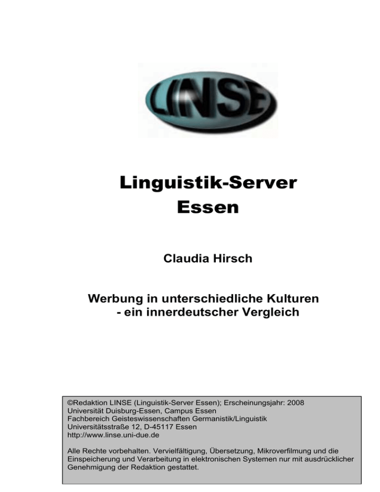Linguistik-Server Essen Claudia Hirsch Werbung in unterschiedliche Kulturen - ein innerdeutscher Vergleich ©Redaktion LINSE (Linguistik-Server Essen); Erscheinungsjahr: 2008 Universität Duisburg-Essen, Campus Essen Fachbereich Geisteswissenschaften Germanistik/Linguistik Universitätsstraße 12, D-45117 Essen http://www.linse.uni-due.de Alle Rechte vorbehalten. Vervielfältigung, Übersetzung, Mikroverfilmung und die Einspeicherung und Verarbeitung in elektronischen Systemen nur mit ausdrücklicher Genehmigung der Redaktion gestattet. 2 Inhaltsverzeichnis 1. Einleitung S. 5 2. Werbung in zwei unterschiedlichen kulturellen und politischen Systemen S. 7 2.1. Werbung in der BRD S. 7 2.1.1. Das politische und wirtschaftliche System der BRD S. 7 2.1.2. Die lexikalischen Besonderheiten im Sprachgebrauch der BRD S. 8 2.1.3. Korrelation der Politik und der lexikalischen Besonderheiten des Sprachgebrauchs mit der Werbewirtschaft in der BRD 2.2. Werbung in der DDR 2.2.1. Das politische und wirtschaftliche System der DDR S. 9 S. 11 S. 11 2.2.2. Die lexikalischen Besonderheiten im Sprachgebrauch der DDR S. 12 2.2.3. Korrelation der Politik und der lexikalischen Besonderheiten des Sprachgebrauchs mit der Werbewirtschaft in der DDR S. 14 3 3. Analyse einer Anzeige von Persil als Beispiel für eine Werbemaßnahme der BRD S. 16 3.1. Erste Skizzierung der textexternen Faktoren S. 16 3.2. Aufbau, Struktur und Form der Texteile S. 17 3.3. Inhalt und Bedeutung der Texteile S. 19 3.4. Zusammenspiel textinterner Faktoren S. 20 3.5. Korrelation von textinternen und textexternen Faktoren S. 22 3.6. Werbeinhalt/ Werbeintention/ Werbewirkung S. 22 4. Analyse eines Spee-Artikels als Beispiel für eine Werbemaßnahme der DDR S. 23 4.1. Erste Skizzierung der Textexternen Faktoren S. 23 4.2. Aufbau, Struktur und Form der Textteile S. 24 4.3. Inhalt und Bedeutung der Texteile S. 25 4.4. Zusammenspiel textinterner Faktoren S. 26 4.5. Korrelation von textinternen und textexternen Faktoren S. 27 4.6. Werbeinhalt/ Werbeintention/ Werbewirkung S. 28 5. Der kulturspezifische Vergleich der beiden Werbemaßnahmen S. 28 6. Resümee S. 21 4 7. Literaturverzeichnis S. 33 8. Anhang S. 35 8.1. Werbeanzeige Persil, 1985 S. 35 8.2. Artikel über Spee, 1984 S. 35 5 1. Einleitung „Werbung wird die geplante, öffentliche Übermittlung von Nachrichten dann genannt, wenn die Nachricht das Urteilen und/oder Handeln bestimmter Gruppen beeinflussen und damit einer Güter, Leistungen oder Ideen produzierenden oder absetzenden Gruppe oder Institutionen (vergrößernd, erhaltend oder bei Verwirklichung ihrer Aufgaben) dienen soll.“ (Hoffmann 1981: 10) Diese Definition von Hoffmann bezieht sich auf Wirtschaftswerbung. Sie ist der bedeutendste Bereich in der werbesprachlichen Forschung. Neben ihr existieren die politische Werbung, welche auch als Propaganda oder Agitation bezeichnet wird, und Werbung für kulturelle Ereignisse. Die Basis der vorliegenden Arbeit stellt die Wirtschaftswerbung dar, welche, in Anlehnung an das obige Zitat, Aufmerksamkeit auf ein Produkt oder eine Dienstleistung richten will, um diese zu verkaufen. Werbung ist Kommunikation mit der Öffentlichkeit, einem großen, heterogenen und anonymen Publikum. Auf Grund der hier vorhandenen kommunikativen Distanz handelt es sich um Einwegkommunikation. Werbekommunikation, die „als soziale Praxis des zielorientierten Zeichenherstellens und –gebrauchens in unserer Alltagskultur einen zentralen Stellenwert einnimmt“ (Stöckl 2007: 233), ist Gegenstand der angewandten Linguistik. Diese hat sich laut Stöckl (2007: 233) die Aufgage gestellt, durch Textanalysen die Kommunikationsstrategien der Werbung transparent zu machen. Außerdem will sie den zielgruppengerechten Einsatz von Werbestrategien und Kommunikationsstilen ermöglichen und durch Forschungsergebnisse eine ständige Neufindung von Formulierungs- und Designalternativen erleichtern. Werbung begegnet uns in vielen Momenten des täglichen Lebens. Ob im Fernsehen, in der Tageszeitung, der Klatsch-Zeitschrift, im Internet oder am Straßenrand in Form von großen Plakaten. Massenmedien sind im westlichen Kulturkreis der Träger der Werbung. Doch wie sah es in den ehemaligen Ostblockstaaten aus? Welchen Grad an Einflussnahme hatte die Werbung in der ehemaligen Deutschen Demokratischen Republik? Diese Arbeit wird klären, inwieweit Werbung in der DDR produziert, in welchen Bereich sie genutzt wurde und welche Unterschiede zu dem Gegenstück in der BRD bestanden. Beeinflussten die vorhandenen kulturellen Unterschiede auch die Werbesprache des jeweiligen Systems? 6 Die Untersuchung eines kulturspezifischen Vergleichs zwischen DDR- und BRDWerbung wurde laut Nina Janich (2005: 219) bisher vernachlässigt und soll Inhalt dieser Arbeit sein. Angelika Hennecke (1999: 76) geht davon aus, dass „[d]ie Befunde über eine unterschiedliche Alltagskultur, unterschiedliche Lebenshaltungen und –gefühle, unterschiedliche Wert- und Moralvorstellungen […] eigentlich eindeutig [sind]“. Ausgehend von diesem Aspekt soll die Frage gestellt werden, ob sich Werbeagenturen in ihrer Arbeit deutlicher auf kulturelle Besonderheiten und Unterschiede einstellen müssen? Sollten auch sprachliche Besonderheiten der Bürger aus den neuen Bundesländern miteinbezogen werden, um diese Zielgruppe besser zu erreichen? Ist in diesem Zusammenhang eine ostspezifische Werbung, die laut Hennecke (1999: 76) „in Printmedien[…] häufig anzutreffen [ist, C.H.]“ sinnvoll? Für die sprachwissenschaftliche Analyse der zu untersuchenden Werbemaßnahmen aus den Jahren 1984 und 1985, zieht die vorliegende Arbeit das von Janich (2005: 204) konzipierte Analysemodell heran. Die Grundannahme dieses Models ist die von Hennecke (1999: 113) bevorzugte Betrachtungsweise, in der die Werbeanzeige als semiotisch komplexer Supertext verstanden wird. Hier besteht die Anzeige aus verschiedenen Teiltexten, sowohl in sprachlicher als auch bildlicher Form, die aufeinander Bez