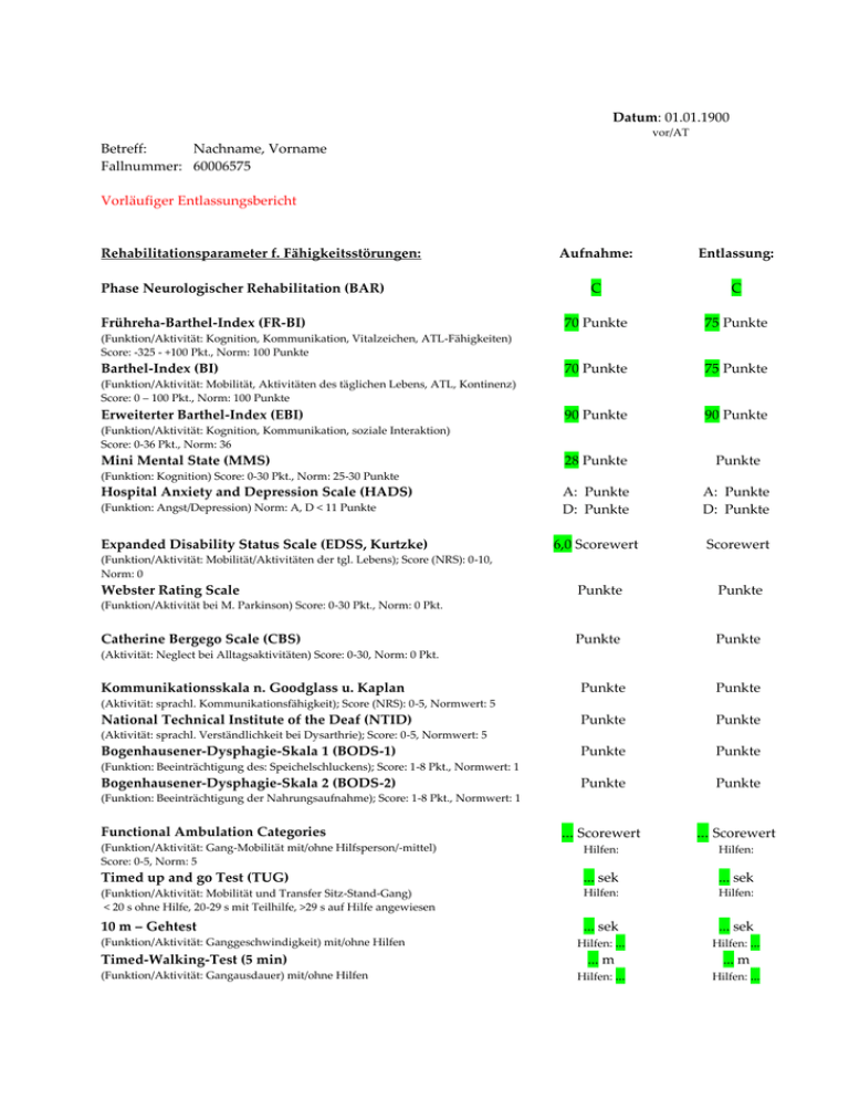 Datum: 01.01.1900 vor/AT Betreff: Nachname, Vorname Fallnummer: 60006575 Vorläufiger Entlassungsbericht Rehabilitationsparameter f. Fähigkeitsstörungen: Phase Neurologischer Rehabilitation (BAR) Frühreha-Barthel-Index (FR-BI) Aufnahme: Entlassung: C C 70 Punkte 75 Punkte 70 Punkte 75 Punkte 90 Punkte 90 Punkte 28 Punkte Punkte A: Punkte D: Punkte A: Punkte D: Punkte 6,0 Scorewert Scorewert Punkte Punkte Punkte Punkte (Funktion/Aktivität: Kognition, Kommunikation, Vitalzeichen, ATL-Fähigkeiten) Score: -325 - +100 Pkt., Norm: 100 Punkte Barthel-Index (BI) (Funktion/Aktivität: Mobilität, Aktivitäten des täglichen Lebens, ATL, Kontinenz) Score: 0 – 100 Pkt., Norm: 100 Punkte Erweiterter Barthel-Index (EBI) (Funktion/Aktivität: Kognition, Kommunikation, soziale Interaktion) Score: 0-36 Pkt., Norm: 36 Mini Mental State (MMS) (Funktion: Kognition) Score: 0-30 Pkt., Norm: 25-30 Punkte Hospital Anxiety and Depression Scale (HADS) (Funktion: Angst/Depression) Norm: A, D < 11 Punkte Expanded Disability Status Scale (EDSS, Kurtzke) (Funktion/Aktivität: Mobilität/Aktivitäten der tgl. Lebens); Score (NRS): 0-10, Norm: 0 Webster Rating Scale (Funktion/Aktivität bei M. Parkinson) Score: 0-30 Pkt., Norm: 0 Pkt. Catherine Bergego Scale (CBS) (Aktivität: Neglect bei Alltagsaktivitäten) Score: 0-30, Norm: 0 Pkt. Kommunikationsskala n. Goodglass u. Kaplan Punkte Punkte Punkte Punkte Punkte Punkte Punkte Punkte (Aktivität: sprachl. Kommunikationsfähigkeit); Score (NRS): 0-5, Normwert: 5 National Technical Institute of the Deaf (NTID) (Aktivität: sprachl. Verständlichkeit bei Dysarthrie); Score: 0-5, Normwert: 5 Bogenhausener-Dysphagie-Skala 1 (BODS-1) (Funktion: Beeinträchtigung des: Speichelschluckens); Score: 1-8 Pkt., Normwert: 1 Bogenhausener-Dysphagie-Skala 2 (BODS-2) (Funktion: Beeinträchtigung der Nahrungsaufnahme); Score: 1-8 Pkt., Normwert: 1 Functional Ambulation Categories ... Scorewert ... Scorewert (Funktion/Aktivität: Gang-Mobilität mit/ohne Hilfsperson/-mittel) Score: 0-5, Norm: 5 Hilfen: Hilfen: Timed up and go Test (TUG) ... sek ... sek (Funktion/Aktivität: Mobilität und Transfer Sitz-Stand-Gang) < 20 s ohne Hilfe, 20-29 s mit Teilhilfe, >29 s auf Hilfe angewiesen Hilfen: Hilfen: 10 m – Gehtest (Funktion/Aktivität: Ganggeschwindigkeit) mit/ohne Hilfen Timed-Walking-Test (5 min) (Funktion/Aktivität: Gangausdauer) mit/ohne Hilfen ... sek ... sek Hilfen: ... Hilfen: ... ... m ... m Hilfen: ... Hilfen: ... Rumpfkontroll-Test (RKT) ... Punkte ... Punkte Punkte Punkte Punkte Punkte R 45 Würfel L 40 Würfel R 40 Würfel L 34 Würfel R 27 sek L 30 sek R 34 sek L 36 sek Punkte Region: Punkte Region: Punkte Region: Punkte Region: (Funktion: Rumpfkontrolle) Score: 0-100 Pkt., Norm: 100 Punkte Fugl-Meyer Test, obere Extremität „Short Form" (Funktion/Aktivität: Armmotorik) Norm: 26 Pkt. Action Research Arm Test (ARAT) (Funktion/Aktivität: Armmotorik mäßiggradige Parese) 19 Items: 0-3 Pkt, Score: 0-57 Pkt., Max.: 57 Punkte Box & Block Test (BBT) (Funktion/Aktivität: Feinmotorik der Hand) Norm: Frauen R >78, L > 75; Männer R > 77; L > 75 Nine-Hole-Peg-Test (NHPT) (Funktion/Aktivität: Feinmotorik der Hand) Norm: 9 Pegs bis 18 sek; Max: 50 sek Brief Pain Inventory (BPI 14) in Ruhe: (Funktion: durchschnittliche Schmerzen in der letzten Woche) Numerische Rating-Skala (NRS): 0 – 10 Punkte Brief Pain Inventory (BPI 14) bei Bewegung: (Funktion: durchschnittliche Schmerzen in der letzten Woche) Numerische Rating-Skala (NRS): 0 – 10 Punkte Schmerzverarbeitung Übernehmen Sie bitte neuropsychologischen Rehabilitationsbericht. Ruhe-EKG vom 13.10.2016: Sinusrhythmus, Indifferenztyp, Herzfrequenz 87/min. PQ-Zeit 0,14 s, QRS 0,1 s, QT-Zeit 0,43 s, vereinzelte ventrikuläre Extrasystolen. Labor: Bestimmt wurden: Siehe Laborwerte oben. Darüber hinaus wurden bestimmt: Vitamin B1, Vitamin B6, sämtliche Werte lagen im Normbereich. Mikrobiologische Urinuntersuchung: Keimidentifikation/Ergebnis: > 10 x 5/ml Proteus mirabilis (B62.2!), sensibel auf Piperacillin + Cefotaxim, Ceftazidim, Imipenem, Meropenem, Gentamicin, Cotrimoxazol, Ciprofloxacin Ampicillin/Sulbactam sowie Cefuroxim) werden bei empfindlichen Enterobakterien als angegeben, um darauf hinzuweisen, dass die klinisch wirksame Dosierung vom Schweregrad Infektion abhängt. Tazobactam, (Ampicillin, intermediär und Ort der 10 x 5/ml Escherichia coli (B96.2!), sensibel auf Piperacillin/Tazobactam, Cefotaxim, Ceftazidim, Imipenem, Meropenem, Gentamicin, Cotrimoxazol, Ciprofloxacin, Phosphomycin und Nitrofurantoin (Ampicillin, Ampicillin/Sulbactam sowie Cefuroxim) werden bei empfindlichen Enterobakterien als intermediär angegeben, um darauf hinzuweisen, dass die klinisch wirksame Dosierung vom Schweregrad und Ort der Infektion abhängt. Restharn-Sonographie vom 13.10.2016: Zirka 200 ml. Restharn-Sonographie vom 28.10.2016: Zirka 410 ml. Therapie und Verlauf: Therapieziele von Frau Vorname Nachname waren Gehfähigkeit zu verbessern sowie allgemeine Kraft und Ausdauer zu steigern. Mit der Patientin am Aufnahmetag abgestimmte Therapieziele waren bezogen auf Funktionen, Fähigkeiten und Partizipation (Teilhabe) eine Steigerung der Kraftausdauer der paretischen Muskulatur sowie der allgemeinen Kraftausdauer, eine Verbesserung der Gangqualität am Hilfsmittel mit Erweiterung der Gehstrecke sowie Verbesserung der Feinmotorik beider Hände. Wir behandelten unter einem multimodalen, interdisziplinären Therapiekonzept mit Krankengymnastik auf neurophysiologischer Grundlage, Ergotherapie, balneophysikalischen Anwendungen sowie Neuropsychologie. In der Krankengymnastik erfolgte Einzel-Krankengymnastik auf neurophysiologischer Basis mit einem Therapeuten, ergänzt durch Ausdauertraining am MOTOmed. Im Rahmen der Behandlung war die Patientin mit Hilfe eine Person am Rollator gehfähig. Die Gehstrecke betrug bei Aufnahme 55 m in 5 Minuten, Treppensteigen alternierend hoch und runter mit Geländer unter Supervision war möglich. Zum Entla
