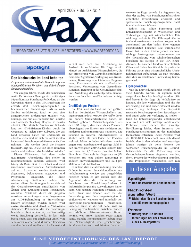 April 2007 • Bd. 5 • Nr. 4 INFORMATIONSBLATT ZU AIDS-IMPFSTOFFEN l WWW.IAVIREPORT.ORG Spotlight Den Nachwuchs im Land behalten Programme zielen darauf die Abwanderung von hochqualifizierten Forschern aus Entwicklungsländern aufzuhalten Vor einigen Jahren wurde der sambischen Ärztin Dr. Veronica Mulenga ein zweijähriges Stipendium zur Forschungsfortbildung an der Universität Miami in den USA angeboten. Sie erwarb dort Forschungsfertigkeiten in hochmodernen Einrichtungen. Als sie nach Sambia zurückkehrte, fand sie dort eine ausgesprochen andersartige Situation vor. Mulenga, die nun als Fachärztin für Pädiatrie am University Teaching Hospital in Lusaka arbeitet, führt klinische Studien zur Behandlung von HIV-infizierten Kindern durch. Im Gegensatz zu vielen ihrer Kollegen, die das Land verlassen haben um andernorts zu arbeiten, entschied sie sich die nicht idealen Labor- und Forschungsverhältnisse in Kauf zu nehmen. „Sie werden durch die Systeme frustriert“, sagt sie. „Viele von ihnen kommen zurück und verlassen das Land dann wieder.“ Dieses Phänomen, bei dem hochqualifizierte Arbeitskräfte ihre Stellen in ressourcenarmen Ländern verlassen, wird häufig als Brain Drain bezeichnet und zieht zunehmend internationale Aufmerksamkeit auf sich. Inzwischen werden Konferenzen abgehalten, Deklarationen abgegeben und Programme eingesetzt, die diese Abwanderung eindämmen sollen. Die meisten dieser Bemühungen haben sich auf das Gesundheitswesen einschließlich von Ärzten und Krankenpflegern konzentriert, nachdem Notstände durch die jüngsten massiven Ausweitungen von Programmen zur AIDS-Behandlung in Entwicklungsländern offengelegt wurden. Jedoch wird einem ähnlichen und damit in Verbindung stehenden Phänomen, das im Forschungsbereich zu beobachten ist, verhältnismäßig wenig Beachtung geschenkt. Es lässt sich beobachten, dass ein erheblicher Anteil von schulmedizinischen und klinischen Forschern aus den Entwicklungsländern ihr Heimatland verläßt und nach ihrer Ausbildung im Ausland nie zurückkehrt. Die Folge ist ein Mangel an qualifizierten Wissenschaftlern, die zur Erforschung von Gesundheitsproblemen nationaler Signifikanz, Verfolgung von Krankheiten, Bewertung von klinischen Programmen, Zusammenarbeit mit ausländischen Forschern, Verbesserung von Gesundheitssystemen, Beratung in der Gesundheitspolitik und Ausbildung der nachfolgenden Generationen an Forschern und Technikern benötigt werden. Großflächiges Problem Die USA sind das Land mit der größten Zahl an berufstätigen Wissenschaftlern und Ingenieuren, jedoch wurden die Hälfte derer, die höhere Studienabschlüsse haben, im Ausland geboren. Volkszählungsdaten aus den USA zeigen, dass viele dieser Personen überwiegend aus Ländern mit niedrigem und mittlerem Einkommensniveau stammen. Die Situation in anderen Industrieländern ist ähnlich. Mehr als zwei Drittel der Forscher weltweit leben in Industrieländern, wohingegen eine atemberaubend geringe Zahl in den am wenigsten entwickelten Ländern lebt, und zwar nur 4,5 Forscher pro eine Million Einwohner. Dies steht im Gegensatz zu 374 Forschern pro eine Million Einwohner in anderen Entwicklungsländern und 3272 pro Million in Industrieländern. Es ist klar, dass die Abwanderung einer der Gründe ist, warum Entwicklungsländer nur verhältnismäßig wenige gut ausgebildete Forscher haben. Es gibt jedoch auch das Argument, dass die Übersiedlung von Forschern aus Entwicklungsländern in Industrieländer positive Auswirkungen haben kann. Gut bezahlte Fachkräfte schicken Geld nach Hause und können auch bei der Entwicklung von Forschungsstrategien in einflussreichen Nationen und innerhalb von Entwicklungsorganisationen mitarbeiten. Experten legen in der Tat nahe, dass die Bewegung von Forschern zwischen Ländern zu erhöhtem Wissensaustausch führen könnte, was armen Ländern sogar zugute käme. Manche Kommentatoren haben sogar die Notwendigkeit der gleichmäßigen Repräsentation von qualifizierten Forschern weltweit in Frage gestellt. Ihr Argument ist, dass der Aufbau von Forschungsinfrastruktur erhebliche Investitionen erfordert und spezialisierte Forschungsprogramme nicht überall existieren können. Jedoch sind solide Forschung und Entwicklungskapazität in Wissenschaft und Technologie eng mit wirtschaftlicher Entwicklung verknüpft. Die Führungskräfte in hochindustrialisierten Ländern sorgen sich zunehmend um den Verlust ihrer eigenen ausgebildeten Forscher. Die Europäische Union hat in den letzten Jahren mehrere wichtige Anstrengungen unternommen, um die Abwanderung von schulmedizinischen Forschern aus Europa in die USA einzudämmen. In manchen Ländern einschließlich China und Indien bemüht sich die politische Führung darum eine wissenschaftliche Arbeitnehmerschaft aufzubauen, da man erwartet, dass dies zu anhaltender Entwicklung beitragen wird. Eigengewächse Was die Entwicklungsländer betrifft, gibt es viele Gründe, warum im eigenen Land ausgebildete Forscher benötigt werden. „Wir sind besser in der Lage die Verhältnisse zu kennen, die hier vorherrschen und die für uns wichtig sind und daher erforscht werden müssen“, sagt Mulenga. Die Kapazität nationale Forschungsprioritäten festzulegen – und Mittel dafür zur Verfügung zu stellen – kann für Entwicklungsländer entscheidend sein, weil sich viele wichtige medizinische Probleme, unter denen ihre jeweilige Bevölkerung leidet, dem Interesse der Forschungseinrichtungen in der nördlichen Hemisphäre entziehen. Dieses Problem wird als 10/90-Kluft bezeichnet, was sich darauf bezieht, dass in den achtziger und neunziger Jahren weniger als zehn Prozent der weltweiten Forschungsgelder im Gesundheitsbereich für die Erforschung von Gesundheitsproblemen eingesetzt wurden, die 90 Prozent der Weltbevölkerung betreffen. Die Proportionen verschieben sich nun In dieser Ausgabe Spotlight n Den Nachwuchs im Land behalten Nachrichten aus aller Welt n Richtlinien für die Beschneidung 