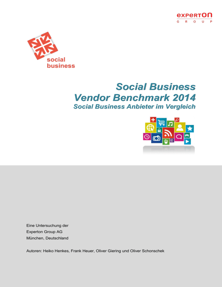 Social Business Vendor Benchmark 2014 Social Business Anbieter im Vergleich Eine Untersuchung der Experton Group AG München, Deutschland Autoren: Heiko Henkes, Frank Heuer, Oliver Giering und Oliver Schonschek © Experton Group AG Seite1 Copyright Die vorliegende Analyse wurde von der Experton Group AG erstellt. Trotz der gewissenhaften und mit größter Sorgfalt erfolgten Ermittlung der Informationen und Daten, kann für deren Vollständigkeit und Richtigkeit keine Garantie übernommen werden. Niemand sollte aufgrund dieser Informationen handeln ohne geeigneten fachlichen Rat und ohne gründliche Analyse der betreffenden Situation. Alle Rechte am Inhalt dieses Untersuchungsberichts liegen bei der Experton Group. Die Daten und Informationen bleiben Eigentum der Experton Group. Vervielfältigungen, auch auszugsweise, bedürfen der schriftlichen Genehmigung der Experton Group AG. Copyright Experton Group, 2013 © Experton Group AG Sei “Social Business ist ein Game Changer, sofern man ein Geben und Nehmen akzeptiert.“ Heiko Henkes, Manger Advisor Experton Group AG © Experton Group AG Seite 3 Social Business Vendor Benchmark 2014 Inhaltsverzeichnis 1. Executive Summary ...............................................................................6 2. Social Business – „der disruptive Wettbewerbsfaktor“ .......................12 3. 4. 5. 2.1. Die neue Ära der Unternehmenskommunikation ......................12 2.2. Social Business – State of the Market.......................................15 2.3. Social Business – Adaption in den Unternehmen .....................16 2.4. Social Business - Challenges für den CIO ................................18 2.5. Social Business – Was gilt es beim Change zu beachten? ......21 2.6. Komplexität beherrschen – Social Business Anbieterauswahl .22 2.7. Datenschutz im Social Business ...............................................23 Methodik ..............................................................................................29 3.1. Definition „Social Business“ .......................................................29 3.2. Methodik und Untersuchungsdesign .........................................31 3.3. Auswahl der untersuchten Anbieter ..........................................35 3.4. Durchführung der Untersuchung ...............................................36 3.5. Zeitlicher Ablauf des Projektes: .................................................37 Social Business Anbieter im Bereich Software ...................................38 4.1. Social Enterprise Networking Suites .........................................40 4.2. Social Collaboration Filesharing ................................................60 4.3. Social Talent Management ........................................................73 4.4. Social Commerce ......................................................................79 4.5. Social CRM ................................................................................85 4.6. Social Media Marketing Management .......................................90 4.7. Social Analytics (Socialytics) .....................................................97 Social Business Dienstleister ............................................................104 5.1. Social Business Beratungsdienstleistungen............................107 5.2. Social Business Integrationsdienstleistungen .........................117 6. Autoren und Kontakt ..........................................................................129 7. Anhang ..............................................................................................134 7.1. Datenschutz Entschließungen .................................................134 7.2. Abkürzungsverzeichnis............................................................135 © Experton Group AG Seite 4 Social Business Vendor Benchmark 2014 Abbildungsverzeichnis Abbildung 1: Social Business im Kontext .................................................. 13 Abbildung 2: Social Business Marktzahlen Deutschland 2013 ................. 15 Abbildung 3: Adaptions-Meilensteile von Social Business ........................ 17 Abbildung 4: Nutzung von Social Collaboration Tools in Unternehmen .... 18 Abbildung 5: CIO challenges - interner und externer Einflüsse ................. 19 Abbildung 6: CIOs am Scheideweg ........................................................... 20 Abbildung 7: Zusammenhang Personen & Social-Komponenten ............. 24 Abbildung 8: Data Security & - Privacy bedingen sich gegenseitig ........... 27 Abbildung 9: Social Business Vendor Benchmark 2014 - Projektschritte . 29 Abbildung 10: Social Business - Begriffsabgrenzung ................................ 30 Abbildung 11: Abstrahierte Berwertungsdetails mit Beispielgrid ............... 32 Abbildung 12: Experton Group Market Insight Quadrant........................... 32 Abbildung 13: Software & Service Komponenten der Benchmarkstudie .. 35 Abbildung 14: Projektablauf Social Business Vendor Benchmark 2014 ... 37 Abbildung 15: Social Enterprise Networking Suites Quadrant .................. 46 Abbildung 16: Social Collaboration Filesharing Quadrant ......................... 64 Abbildung 17: Social Talent Management Quadrant ................................. 76 Abbildung 18: Social Commerce Quadrant ............................................... 82 Abbildung 19: Social CRM Quadrant ......................................................... 88 Abbildung 20: Social Media Marketing Management Quadrant ................ 94 Abbildung 21: Socialytics Quadrant ......................................................... 101 Abbildung 22: SB-Kollaborationsstufen ................................................... 105 Abbildung 23: Social Consulting Services Quadrant ............................... 111 Abbildung 24: Social Integration Services Quadrant ............................... 123 © Experton Group AG Seite 5 Social Business Vendor Benchmark 2014 1. Executive Summary Der 