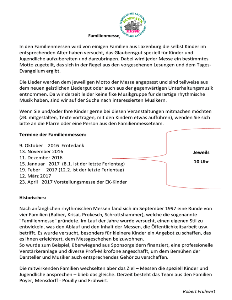 Familienmesse In den Familienmessen wird von einigen Familien aus Laxenburg die selbst Kinder im entsprechenden Alter haben versucht, das Glaubensgut speziell für Kinder und Jugendliche aufzubereiten und darzubringen. Dabei wird jeder Messe ein bestimmtes Motto zugeteilt, das sich in der Regel aus den vorgesehenen Lesungen und dem TagesEvangelium ergibt. Die Lieder werden dem jeweiligen Motto der Messe angepasst und sind teilweise aus dem neuen geistlichen Liedergut oder auch aus der gegenwärtigen Unterhaltungsmusik entnommen. Da wir derzeit leider keine fixe Musikgruppe für derartige rhythmische Musik haben, sind wir auf der Suche nach interessierten Musikern. Wenn Sie und/oder Ihre Kinder gerne bei diesen Veranstaltungen mitmachen möchten (zB. mitgestalten, Texte vortragen, mit den Kindern etwas aufführen), wenden Sie sich bitte an die Pfarre oder eine Person aus den Familienmesseteam. Termine der Familienmessen: 9. Oktober 2016 Erntedank 13. November 2016 11. Dezember 2016 15. Jannuar 2017 (8.1. ist der letzte Ferientag) 19. Feber 2017 (12.2. ist der letzte Ferientag) 12. März 2017 23. April 2017 Vorstellungsmesse der EK-Kinder Jeweils 10 Uhr Historisches: Nach anfänglichen rhythmischen Messen fand sich im September 1997 eine Runde von vier Familien (Balber, Krisai, Prokesch, Schrottshammer), welche die sogenannte "Familienmesse" gründete. Im Lauf der Jahre wurde versucht, einen eigenen Stil zu entwickeln, was den Ablauf und den Inhalt der Messen, die Öffentlichkeitsarbeit usw. betrifft. Es wurde versucht, besonders für kleinere Kinder ein Angebot zu schaffen, das es ihnen erleichtert, dem Messgeschehen beizuwohnen. So wurde zum Beispiel, überwiegend aus Sponsorgeldern finanziert, eine professionelle Verstärkeranlage und diverse Profi-Mikrofone angeschafft, um dem Bemühen der Darsteller und Musiker auch entsprechendes Gehör zu verschaffen. Die mitwirkenden Familien wechselten aber das Ziel – Messen die speziell Kinder und Jugendliche ansprechen – blieb das gleiche. Derzeit besteht das Team aus den Familien Poyer, Mensdorff - Pouilly und Frühwirt. Robert Frühwirt