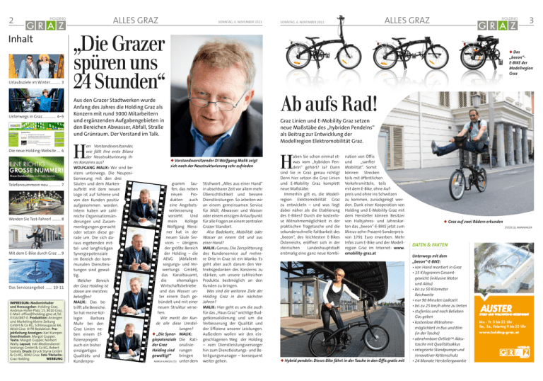 2 Inhalt Urlaubsziele im Winter����������� 3 Unterwegs in Graz��������������� 4–5 Die neue Holding-Website���� 6 Telefonnummern neu������������� 7 Werden Sie Test-Fahrer! ��������� 8 Mit dem E-Bike durch Graz ����9 Das Serviceangebot ������� 10-11 IMPRESSUM: Medieninhaber und Herausgeber: Holding Graz, Andreas-Hofer-Platz 15, 8010 Graz, E-Mail: [email protected],Tel. 0316/887-0­. Produktion: Anzeigen und Marketing Kleine Zeitung GmbH & Co KG, Schönaugasse 64, 8010 Graz. © PR-Redaktion. Projektleitung Anzeigen: Karl Kamper. Koordination: Margot Gupper. Texte: Margot Gupper, Norbert Wally. Layout: m4! Medien­dienst­­ leis­tungs GmbH & Co KG, Robert Szekely. Druck: Druck Styria GmbH & Co KG, 8042 Graz. Foto Titelseite: Graz Holding. WERBUNG ALLES GRAZ SONNTAG, 6. NOVEMBER 2011 „Die Grazer spüren uns 24 Stunden“ H 3 ◆ Das „beeon“E-BIKE der Modellregion Graz Ab aufs Rad! Aus den Grazer Stadtwerken wurde Anfang des Jahres die Holding Graz als Konzern mit rund 3000 Mitarbeitern und ergänzenden Aufgabengebieten in den Bereichen Abwasser, Abfall, Straße und Grünraum. Der Vorstand im Talk. err Vorstandsvorsitzender, wie fällt Ihre erste Bilanz der Neustrukturierung Ihres Konzerns aus? WOLFGANG MALIK: Wir sind bestens unterwegs. Die Neupositionierung mit den drei Säulen und dem Markenauftritt mit dem neuen Logo ist auf Schiene und von den Kunden positiv aufgenommen worden. Intern haben wir zahlreiche Organisationsänderungen und Zusammenlegungen gemacht oder setzen diese gerade um. Die sich daraus ergebenden mittel- und langfristigen Synergiepotenziale im Bereich der kommunalen Dienstleistungen sind gewaltig. Welcher Bereich der Graz Holding ist davon am meistens betroffen? MALIK: Das betrifft alle Bereiche. So hat meine Kollegin Barbara Muhr bei den Graz Linien neben einem Effizienzprojekt auch ein bisher einzigartiges Qualitäts- und Kundenpro- ALLES GRAZ SONNTAG, 6. NOVEMBER 2011 Graz Linien und E-Mobility Graz setzen neue Maßstäbe des „hybriden Pendelns“ als Beitrag zur Entwicklung der Modellregion Elektromobilität Graz. ◆ Vorstandsvorsitzender DI Wolfgang Malik zeigt sich nach der Neustrukturierung sehr zufrieden gramm laufen, das neben neuen Produkten auch eine Angebotsverbesserung vorsieht. Und mein Kollege Wolfgang Messner hat in der neuen Säule Services – übrigens der größte Bereich der Holding – die AEVG (Abfallentsorgungs- und Verwertungs GmbH), das Kanalbauamt, die ehemaligen Wirtschaftsbetriebe und das Wasser unter einem Dach gebündelt und mit einer neuen Struktur versehen. Wie merkt der Kunde alle diese Umstellungen? ◆ „Die Syner- MALIK: giepotenziale Die Rationalisieder Graz Holding sind rungen gewaltig!“ bringen MARIJA KANIZAJ (5) unter dem Stichwort „Alles aus einer Hand“ in absehbarer Zeit vor allem mehr Übersichtlichkeit und bessere Dienstleistungen. So arbeiten wir an einem gemeinsamen Service für Müll, Abwasser und Wasser oder einem einzigen Anlaufpunkt für alle Fragen an einem zentralen Grazer Standort. Also Badekarte, Mobilität oder Wasser an einem Ort und aus einer Hand? MALIK: Genau. Die Zersplitterung des Kundenservice auf mehrere Orte in Graz ist ein Manko. Es geht aber auch darum den Vertriebsgedanken des Konzerns zu stärken, um unsere zahlreichen Produkte bestmöglich an den Kunden zu bringen. Was sind die weiteren Ziele der Holding Graz in den nächsten Jahren? MALIK: Hier geht es um die auch für das „Haus Graz“ wichtige Budgetkonsolidierung und um die Verbesserung der Qualität und der Effizienz unserer Leistungen. Außerdem wollen wir den eingeschlagenen Weg der Holding – vom Dienstleistungsversorger hin zum Dienstleistungs- und Beteiligungsmanager – konsequent weiter gehen. H aben Sie schon einmal etwas vom „hybriden Pendeln“ gehört? Ja? Dann sind Sie in Graz genau richtig! Denn hier setzen die Graz Linien und E-Mobility Graz komplett neue Maßstäbe. Immerhin gilt es, die Modellregion Elektromobilität Graz zu entwickeln – und was liegt dabei näher als die Etablierung des E-Bikes? Durch die kostenlose Mitnahmemöglichkeit in der praktischen Tragetasche und die sekundenschnelle Faltbarkeit des „beeon“, des leichtesten E-Bikes Österreichs, eröffnet sich in der steirischen Landeshauptstadt erstmalig eine ganz neue Kombi- nation von Öffis und „sanfter Mobilität“. Somit können Strecken teils mit öffentlichen Verkehrsmitteln, teils mit dem E-Bike, ohne Aufpreis und ohne ins Schwitzen zu kommen, zurückgelegt werden. Dank einer Kooperation von Holding und E-Mobility Graz mit dem Hersteller können Besitzer von Halbjahres- und Jahreskarten das „beeon“-E-BIKE jetzt zum Minus-zehn-Prozent-Sonderpreis von 1791 Euro erwerben. Mehr Infos zum E-Bike und der Modellregion Graz im Internet: www. emobility-graz.at ◆ Hybrid pendeln: Dieses Bike fährt in der Tasche in den Öffis gratis mit ◆ Graz auf zwei Rädern erkunden ZYZZX (2), MANNINGER DATEN & FAKTEN Unterwegs mit dem „beeon“-E-BIKE: • von Hand montiert in Graz • 15 Kilogramm Gesamtgewicht (inklusive Motor und Akku) • bis zu 50 Kilometer Reichweite • nur 90 Minuten Ladezeit • bis zu 25 km/h ohne zu treten • stufenlos und nach Belieben Gas geben • kostenlose Mitnahmemöglichkeit in Bus und Bim (in der Tasche) • abnehmbare OrtliebTM Akkutasche mit Qualitätsakkus • integrierte Standpumpe und innovativer Kettenschutz • 24 Monate Herstellergarantie