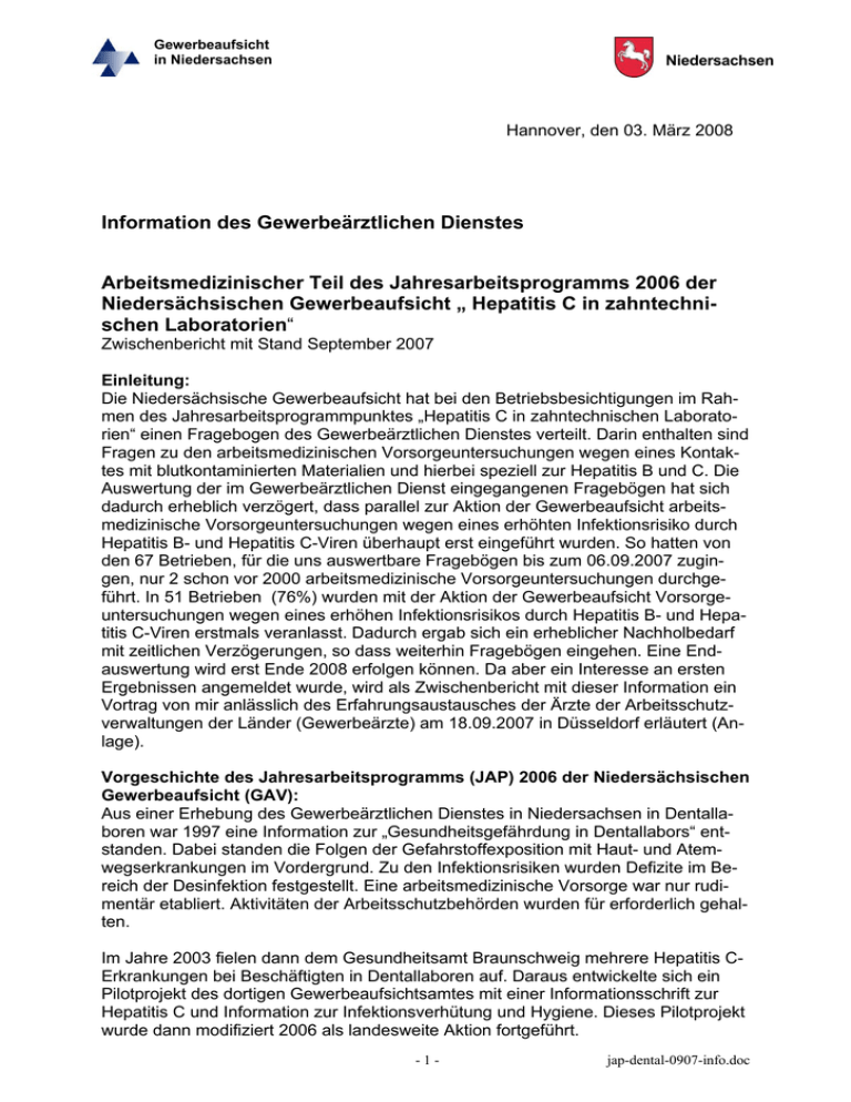 Gewerbeaufsicht in Niedersachsen Niedersachsen Hannover, den 03. März 2008 Information des Gewerbeärztlichen Dienstes Arbeitsmedizinischer Teil des Jahresarbeitsprogramms 2006 der Niedersächsischen Gewerbeaufsicht „ Hepatitis C in zahntechnischen Laboratorien“ Zwischenbericht mit Stand September 2007 Einleitung: Die Niedersächsische Gewerbeaufsicht hat bei den Betriebsbesichtigungen im Rahmen des Jahresarbeitsprogrammpunktes „Hepatitis C in zahntechnischen Laboratorien“ einen Fragebogen des Gewerbeärztlichen Dienstes verteilt. Darin enthalten sind Fragen zu den arbeitsmedizinischen Vorsorgeuntersuchungen wegen eines Kontaktes mit blutkontaminierten Materialien und hierbei speziell zur Hepatitis B und C. Die Auswertung der im Gewerbeärztlichen Dienst eingegangenen Fragebögen hat sich dadurch erheblich verzögert, dass parallel zur Aktion der Gewerbeaufsicht arbeitsmedizinische Vorsorgeuntersuchungen wegen eines erhöhten Infektionsrisiko durch Hepatitis B- und Hepatitis C-Viren überhaupt erst eingeführt wurden. So hatten von den 67 Betrieben, für die uns auswertbare Fragebögen bis zum 06.09.2007 zugingen, nur 2 schon vor 2000 arbeitsmedizinische Vorsorgeuntersuchungen durchgeführt. In 51 Betrieben (76%) wurden mit der Aktion der Gewerbeaufsicht Vorsorgeuntersuchungen wegen eines erhöhen Infektionsrisikos durch Hepatitis B- und Hepatitis C-Viren erstmals veranlasst. Dadurch ergab sich ein erheblicher Nachholbedarf mit zeitlichen Verzögerungen, so dass weiterhin Fragebögen eingehen. Eine Endauswertung wird erst Ende 2008 erfolgen können. Da aber ein Interesse an ersten Ergebnissen angemeldet wurde, wird als Zwischenbericht mit dieser Information ein Vortrag von mir anlässlich des Erfahrungsaustausches der Ärzte der Arbeitsschutzverwaltungen der Länder (Gewerbeärzte) am 18.09.2007 in Düsseldorf erläutert (Anlage). Vorgeschichte des Jahresarbeitsprogramms (JAP) 2006 der Niedersächsischen Gewerbeaufsicht (GAV): Aus einer Erhebung des Gewerbeärztlichen Dienstes in Niedersachsen in Dentallaboren war 1997 eine Information zur „Gesundheitsgefährdung in Dentallabors“ entstanden. Dabei standen die Folgen der Gefahrstoffexposition mit Haut- und Atemwegserkrankungen im Vordergrund. Zu den Infektionsrisiken wurden Defizite im Bereich der Desinfektion festgestellt. Eine arbeitsmedizinische Vorsorge war nur rudimentär etabliert. Aktivitäten der Arbeitsschutzbehörden wurden für erforderlich gehalten. Im Jahre 2003 fielen dann dem Gesundheitsamt Braunschweig mehrere Hepatitis CErkrankungen bei Beschäftigten in Dentallaboren auf. Daraus entwickelte sich ein Pilotprojekt des dortigen Gewerbeaufsichtsamtes mit einer Informationsschrift zur Hepatitis C und Information zur Infektionsverhütung und Hygiene. Dieses Pilotprojekt wurde dann modifiziert 2006 als landesweite Aktion fortgeführt. -1- jap-dental-0907-info.doc Das Berufskrankheitengeschehen bei Zahntechnikern: Für die Vorbereitung der Aktion „Hepatitis C in zahntechnischen Laboratorien“ wurde das Berufskrankheitengeschehen bei Zahntechnikern in Niedersachsen ausgewertet. Selbstverständlich konnten nur die Fälle berücksichtigt werden, die von den Unfallversicherungsträgern oder direkt dem Gewerbeärztlichen Dienst übermittelt wurden. Nach einer eigenen Erhebung erfolgt die Übermittlung der Berufskrankheitenfälle, zu der die Unfallversicherungsträger nach den Vorschriften des Sozialgesetzbuches VII und der Berufskrankheitenverordnung verpflichtet sind, nicht bei allen Unfallversicherungsträgern vollständig. Die Auswertung des Berufskrankheitengeschehens wurde in 2 Zeitabschnitte gegliedert. Einmal die Fälle aus dem Zeitraum 1995 – 99. Aus diesem Zeitraum liegen 67 Fälle vor. 85% stammen von der Berufsgenossenschaft für Feinmechanik und Elektrotechnik (BGFE, jetzt BGETF) und 15% von der Berufsgenossenschaft für Gesundheitsdienst und Wohlfahrtspflege (BGW). Die BGFE versichert die Dentallabore, die als selbständige Einrichtungen unabhängig von einer Arztpraxis tätig sind, die BGW die Dentallabore, die zu einer Zahnarztpraxis gehören. 46% der uns vorgelegten Fälle bestanden in Hauterkrankungen, 16% waren Erkrankungen der Atemwege. Es wurden nur 2 Infektionskrankheiten aus dem Bereich der BGW gemeldet. Von 2000 – 2005 wurden uns 76 Fälle vorgelegt, davon 75% von der BGFE und 25% von der BGW. Deutlich rückläufig war der Anteil der Atemwegserkrankungen. Diese machten nur noch lediglich 7% aus. Das Berufskrankheitengeschehen wurde jetzt noch stärker von den Hauterkrankungen dominiert, mit 70% der Fälle. In diesem Zeitraum wurden 6 Infektionskrankheiten vorgelegt, davon 5 von der BGFE und eine von der BGW. Die insgesamt 8 gemeldeten Infektionskrankheiten bei Zahntechnikern aus dem Zeitraum 1995 – 2005 wurden ausgewertet. Dabei ist zu beachten, dass die gewerbeärztliche Mitwirkung an Berufskrankheitenverfahren unterschiedlich Beteiligungsgrade hat. Die Mitwirkung sieht so aus, dass lediglich Fälle betriebsbezogen für Arbeitsschutzbelange erfasst werden oder dass eine gewerbeärztliche Stellungnahme oder ein gewerbeärztliches Zusammenhangsgutachten angefertigt wird. Davon hängt auch die Information ab, die aus der gewerbeärztlichen Berufskrankheitenakte zu gewinnen ist. Bei den 8 Berufskrankheitenfällen war in 2 Fällen aus der gewerbeärztlichen Akte eine differenzierte Diagnose nicht abzuleiten. 6 der gemeldeten Fälle bestanden in einer Virushepatitis C. Von diesen wurde uns bekannt, dass 1 Fall als Berufskrankheit vom Unfallversicherungsträger anerkannt wurde. Der Unfallversicherungsträger hat den Gewerbearzt über den Ausgang eines Berufskrankheitenverfahrens nur dann zu unterrichten, wenn ein gewerbeärztliches Gutachten vorliegt und er in seiner Entscheidung von der gewerbeärztlichen Empfehlung abweicht. Auch diese Verpflichtung nach dem Sozialgesetzbuch VII besteht erst seit Anfang 1997. Vorher bestand eine Pflicht des Unfallversicherungsträgers, über seine Entscheidung