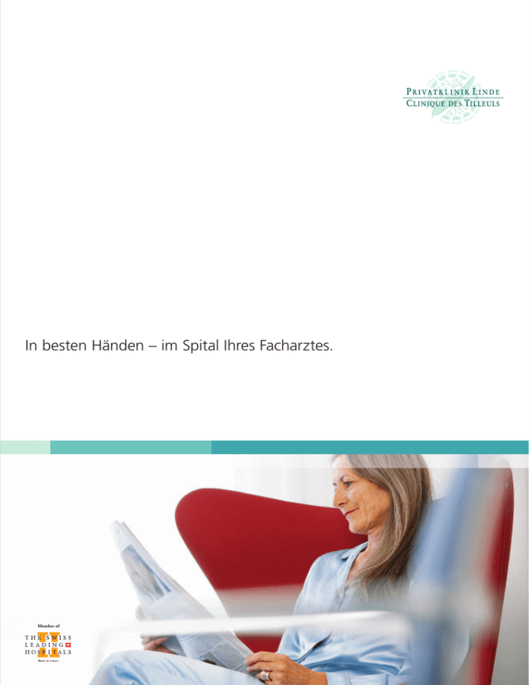 In besten Händen – im Spital Ihres Facharztes. Inhalt 2 Ganz Ihrem persönlichen Wohl verpflichtet. 4 Geniessen Sie die gepflegte Atmosphäre. 6 Bauen Sie auf eine ganzheitliche Betreuung. 8 Fühlen Sie sich vom ersten Tag an geborgen. 10 Vertrauen Sie auf medizinische Spitzentechnik. 12 Kommen Sie den Ursachen auf den Grund. 14 Erleben Sie lindernde, heilende Bewegung. Ganz Ihrem persönlichen Wohl verpflichtet. Willkommen im führenden Privatspital der Region Biel – Seeland – Berner Jura. Unsere zweisprachig geführte Klinik deckt praktisch alle Spezialgebiete der modernen Medizin ab. Als Mitglied der Swiss Leading Hospitals bieten wir unseren Patientinnen und Patienten eine erstklassige, umfassende medizinische Versorgung und kompetente Pflege – in einer harmonischen Umgebung mit geho­benem Hotelleriekomfort. Den über achtzig an unserer Klinik tätigen Fach­ ärztinnen und Fachärzten praktisch aller Disziplinen steht eine modernste medizintechnische Infrastruktur zur Verfügung. Gemeinsam mit unserem gesamten Team von qualifizierten Mitarbeitenden in der Pflege und der Hotellerie tun sie alles, um Ihre Heilung und Genesung bestmöglich zu fördern und Ihren Aufenthalt so angenehm wie möglich zu gestalten. Als Mitglied des Verbands der Privatspitäler des Kantons Bern, von «H+ Die Spitäler der Schweiz» und der «Swiss Leading Hospitals» erfüllen wir in allen Bereichen höchste Qualitätsstandards – von der medizinischen Betreuung über die Pflege und die Hotellerie bis zu den administrativen und infra­ strukturellen Belangen. Dies wird nicht zuletzt durch unser zertifiziertes Qualitätsmanagement-System nach ISO 9001 sichergestellt. In der Pflege steht bei uns der Mensch in seiner Ganzheit im Mittelpunkt. Dazu gehören auch das Umfeld und die Angehörigen der Patientinnen und Patienten. Ausgerichtet auf Ihre individuellen Bedürfnisse wird Ihre Pflege von einer hauptver­ antwortlichen Pflegeperson geplant und dokumentiert. Und alle unsere Mitarbeitenden setzen sich engagiert und einfühlsam für Ihr persönliches Wohlergehen ein. 3 Geniessen Sie die gepflegte Atmosphäre. Unsere Klinik wurde vor wenigen Jahren umfassend erneuert und erweitert. Sie liegt in einem ruhigen Quartier nahe beim Stadtzentrum und ist von viel Grün umgeben. Die helle und freundliche Atmosphäre und das gepflegte Ambiente im Innen- wie im Aussenbereich tragen ebenfalls dazu bei, den Heilungsprozess zu fördern. Sie und Ihre Gäste sollen sich bei uns rundum wohlfühlen. Sie beziehen bei uns eines der hellen, behaglich ein­­ gerichteten Einzel- oder Zweierzimmer, die alle über ein eigenes WC mit Dusche und mehrheitlich über einen Balkon verfügen. Zu jedem Bett gehört auch ein eigenes TV-Gerät. In Ihrem Zimmer werden Sie ausschliesslich von diplomiertem Pflegepersonal betreut und von den qualifizierten und freundlichen Mitarbeitenden unseres Room Service umsorgt. Der Room Service bietet Ihnen einen gehobenen Hotelkomfort und geht gerne auf Ihre individuellen Bedürfnisse ein. Ob Sie gemeinsam mit Angehörigen essen, Ihre Blumen pflegen oder Kleider reinigen lassen möchten, ob Sie einen Coiffeurbesuch planen oder eine kleine Zwischenverpflegung wünschen – der Room Service ist immer für Sie da. Von unserer Küche dürfen Sie nicht nur gesunde Kost, sondern echte Gaumenfreuden erwarten. Eine neuzeitliche und abwechslungsreiche Ernährung ist unserer Küchenbrigade ebenso wichtig wie die kulinarische Seite und eine attraktive Präsen­ tation. Mittags und abends können Sie aus verschiedenen Menüs oder aus einem vielfältigen A-lacarte-Angebot wählen. Für Ernährungsfragen stehen Ihnen unser Küchenchef und sein Diätkoch-Team und unsere Ernährungsberaterinnen gerne persönlich zur Verfügung. Und wenn Sie eine Mahlzeit mit Gästen geniessen möchten oder Lust auf einen kleinen Snack oder eine Erfrischung in Gesellschaft haben, sind Sie in unserem beliebten Res­taurant des Tilleuls herzlich willkommen. 5 Bauen Sie auf eine ganzheitliche Betreuung. An der Klinik Linde sind über achtzig erfahrene Belegärztinnen und -ärzte tätig. Diese Fachärztinnen und Fachärzte decken praktisch alle Gebiete der modernen Medizin ab. Von der Diagnostik über die Behandlung bis zur Rehabilitation steht ihnen eine umfassende medizintechnische Infrastruktur auf dem neusten Stand zur Verfügung. Dank der sehr engen, auch interdisziplinären Zusammenarbeit und dem permanenten Kontakt unter den spezialisierten Ärztegruppen erfahren Sie die bestmög­liche individuelle Betreuung. Detaillierte Angaben über die medizinischen Dienstleistungen in den einzelnen Spezialgebieten sowie über die zuständigen Fachärztinnen und Fachärzte finden Sie auf unserer Website unter www.kliniklinde.ch. An dieser Stelle seien zwei Spezialitäten der Inneren Medizin besonders erwähnt: – Im einzigen akkreditierten Schlaflabor der Region werden sämtliche modernen diagnostischen Abklärungen von Schlafstörungen vorgenommen. – In unserer onkologischen Abteilung werden heute neben stationären Behandlungen selbst komplexe Chemotherapien oft ambulant durchgeführt. Die Fachärzte bilden unter einem Dach ein kleines, interdisziplinäres Team, das ein rasches und gezieltes Vorgehen sicherstellt, die Behandlungsstrategie plant und gemeinsam mit dem speziell ausgebildeten Pflegepersonal eine fachlich wie psychologisch kompetente und einfühlsame Betreuung gewährleistet. Unsere 24-Stunden-Notfall-Permanence dient Ihnen rund um die Uhr als Anlaufstelle für medizinische Hilfe in speziellen Fällen: Zum Beispiel, wenn Sie bei neu auftretenden Beschwerden oder einem Unfall Ihren Arzt oder Ihre Ärztin (bzw. die Vertretung) nicht erreichen können. Oder wenn Sie eine bestimmte medi­zinische Behandlung gerne in der Klinik Linde durchführen lassen möchten. Auch Ihr Hausarzt oder Ihre Hausärztin kann Sie jederzeit über die Notfall-Permanence der Klinik Linde ein­ weisen, wenn ein notfallmässiger Spitalaufenthalt erfor