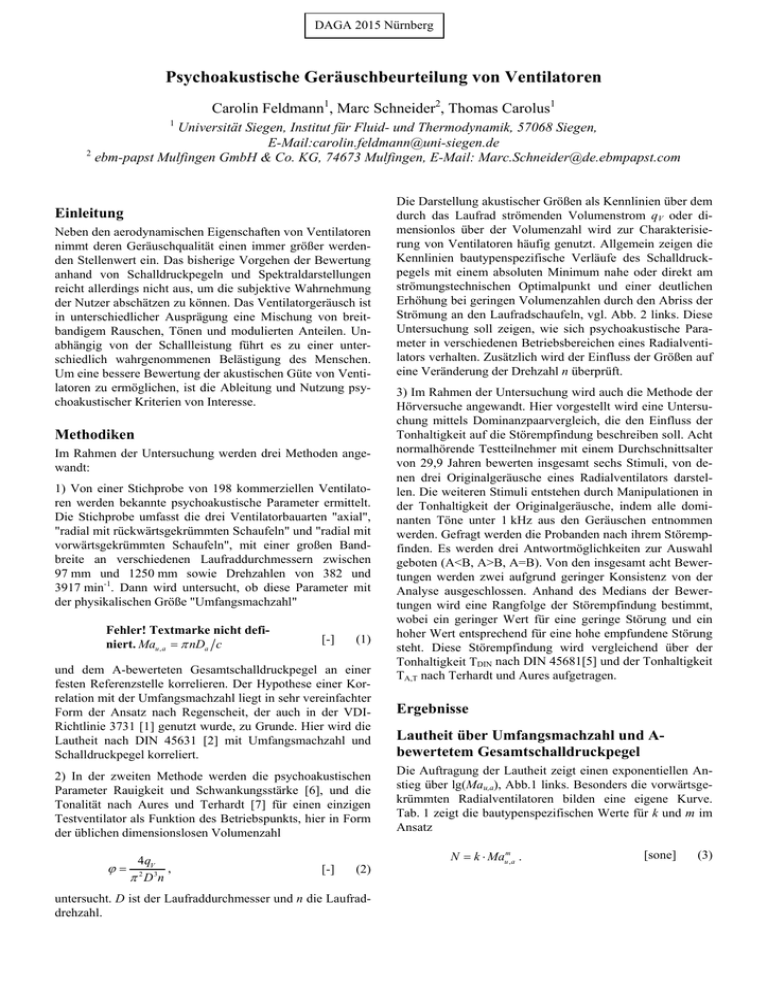 DAGA 2015 Nürnberg Psychoakustische Geräuschbeurteilung von Ventilatoren Carolin Feldmann1, Marc Schneider2, Thomas Carolus1 1 Universität Siegen, Institut für Fluid- und Thermodynamik, 57068 Siegen, E-Mail:[email protected] 2 ebm-papst Mulfingen GmbH & Co. KG, 74673 Mulfingen, E-Mail: [email protected] Einleitung Neben den aerodynamischen Eigenschaften von Ventilatoren nimmt deren Geräuschqualität einen immer größer werdenden Stellenwert ein. Das bisherige Vorgehen der Bewertung anhand von Schalldruckpegeln und Spektraldarstellungen reicht allerdings nicht aus, um die subjektive Wahrnehmung der Nutzer abschätzen zu können. Das Ventilatorgeräusch ist in unterschiedlicher Ausprägung eine Mischung von breitbandigem Rauschen, Tönen und modulierten Anteilen. Unabhängig von der Schallleistung führt es zu einer unterschiedlich wahrgenommenen Belästigung des Menschen. Um eine bessere Bewertung der akustischen Güte von Ventilatoren zu ermöglichen, ist die Ableitung und Nutzung psychoakustischer Kriterien von Interesse. Methodiken Im Rahmen der Untersuchung werden drei Methoden angewandt: 1) Von einer Stichprobe von 198 kommerziellen Ventilatoren werden bekannte psychoakustische Parameter ermittelt. Die Stichprobe umfasst die drei Ventilatorbauarten "axial", "radial mit rückwärtsgekrümmten Schaufeln" und "radial mit vorwärtsgekrümmten Schaufeln", mit einer großen Bandbreite an verschiedenen Laufraddurchmessern zwischen 97 mm und 1250 mm sowie Drehzahlen von 382 und 3917 min-1. Dann wird untersucht, ob diese Parameter mit der physikalischen Größe "Umfangsmachzahl" Fehler! Textmarke nicht definiert. Mau , a nDa c [-] (1) und dem A-bewerteten Gesamtschalldruckpegel an einer festen Referenzstelle korrelieren. Der Hypothese einer Korrelation mit der Umfangsmachzahl liegt in sehr vereinfachter Form der Ansatz nach Regenscheit, der auch in der VDIRichtlinie 3731 [1] genutzt wurde, zu Grunde. Hier wird die Lautheit nach DIN 45631 [2] mit Umfangsmachzahl und Schalldruckpegel korreliert. 2) In der zweiten Methode werden die psychoakustischen Parameter Rauigkeit und Schwankungsstärke [6], und die Tonalität nach Aures und Terhardt [7] für einen einzigen Testventilator als Funktion des Betriebspunkts, hier in Form der üblichen dimensionslosen Volumenzahl 4qV , 2 D 3n [-] (2) untersucht. D ist der Laufraddurchmesser und n die Laufraddrehzahl. Die Darstellung akustischer Größen als Kennlinien über dem durch das Laufrad strömenden Volumenstrom qV oder dimensionlos über der Volumenzahl wird zur Charakterisierung von Ventilatoren häufig genutzt. Allgemein zeigen die Kennlinien bautypenspezifische Verläufe des Schalldruckpegels mit einem absoluten Minimum nahe oder direkt am strömungstechnischen Optimalpunkt und einer deutlichen Erhöhung bei geringen Volumenzahlen durch den Abriss der Strömung an den Laufradschaufeln, vgl. Abb. 2 links. Diese Untersuchung soll zeigen, wie sich psychoakustische Parameter in verschiedenen Betriebsbereichen eines Radialventilators verhalten. Zusätzlich wird der Einfluss der Größen auf eine Veränderung der Drehzahl n überprüft. 3) Im Rahmen der Untersuchung wird auch die Methode der Hörversuche angewandt. Hier vorgestellt wird eine Untersuchung mittels Dominanzpaarvergleich, die den Einfluss der Tonhaltigkeit auf die Störempfindung beschreiben soll. Acht normalhörende Testteilnehmer mit einem Durchschnittsalter von 29,9 Jahren bewerten insgesamt sechs Stimuli, von denen drei Originalgeräusche eines Radialventilators darstellen. Die weiteren Stimuli entstehen durch Manipulationen in der Tonhaltigkeit der Originalgeräusche, indem alle dominanten Töne unter 1 kHz aus den Geräuschen entnommen werden. Gefragt werden die Probanden nach ihrem Störempfinden. Es werden drei Antwortmöglichkeiten zur Auswahl geboten (A<B, A>B, A=B). Von den insgesamt acht Bewertungen werden zwei aufgrund geringer Konsistenz von der Analyse ausgeschlossen. Anhand des Medians der Bewertungen wird eine Rangfolge der Störempfindung bestimmt, wobei ein geringer Wert für eine geringe Störung und ein hoher Wert entsprechend für eine hohe empfundene Störung steht. Diese Störempfindung wird vergleichend über der Tonhaltigkeit TDIN nach DIN 45681[5] und der Tonhaltigkeit TA,T nach Terhardt und Aures aufgetragen. Ergebnisse Lautheit über Umfangsmachzahl und Abewertetem Gesamtschalldruckpegel Die Auftragung der Lautheit zeigt einen exponentiellen Anstieg über lg(Mau,a), Abb.1 links. Besonders die vorwärtsgekrümmten Radialventilatoren bilden eine eigene Kurve. Tab. 1 zeigt die bautypenspezifischen Werte für k und m im Ansatz N k Maum, a . [sone] (3) Tabelle 1: Bautypenabhängige Korrelationsfaktoren für die Lautheit als Funktion der Umfangsmachzahl Bautyp Parameter k [sone] m 3386 2,21 1043 1,72 axial radial (rückwärtsgekrümmt) radial 1674 1,58 (vorwärtsgekrümmt) Abb. 1 rechts zeigt den Zusammenhang von Lautheit und dem A-bewerteten Gesamtschalldruckpegel. Hier ist keine bautypenspezifische Streuung erkennbar. Der einzige "Ausreißer" kann nicht erklärt werden. Das curve-fit [sone] N k L4,3 P (4) beschreibt den Zusammenhang gut. N [soneGF] 80,0 60,0 40,0 20,0 0,0 0,020 Mau,a 0,200 N [soneGF] 80,0 Hörversuch zur Ermittlung der Störempfindung unter Manipulation der Tonhaltigkeit 60,0 40,0 20,0 0,0 50,0 Bis auf die Tonhaltigkeit kann für alle betrachteten Größen eine Abnahme der Werte mit Reduktion der Drehzahl erkannt werden, Abb. 2. Ein vergleichbarer Kennlinienverlauf zu Lp zeigt sich nur für die Rauigkeit. Das Minimum findet sich sowohl bei der Rauigkeit als auch bei dem Schalldruckpegel im strömungstechnischen Optimum des Ventilators. Zu niedrigen Volumenzahlen hin ist vom Optimalpunkt ausgehend ein stärkerer Anstieg zu erkennen. Während das Schalldruckmaximum bei φ = 0,15 liegt, ist es für die Rauigkeit weiter links im Diagramm bei φ = 0,05 zu finden. Gleichzeitig zeigt R bei einer Volumenzahl von φ = 0,15 abhängig von der Drehzahl eine