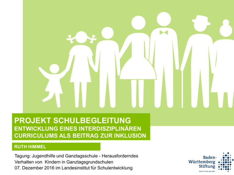 PROJEKT SCHULBEGLEITUNG ENTWICKLUNG EINES INTERDISZIPLINÄREN CURRICULUMS ALS BEITRAG ZUR INKLUSION RUTH HIMMEL Tagung: Jugendhilfe und Ganztagsschule - Herausforderndes Verhalten von Kindern in Ganztagsgrundschulen 07. Dezember 2016 im Landesinstitut für Schulentwicklung GLIEDERUNG Inklusion und Schulbegleitung Projekt „Schulbegleiter“ Fazit UN-BEHINDERTENRECHTSKONVENTION (UN-BRK) ÜBEREINKOMMEN UND ZUSATZPROTOKOLL AM 13. DEZEMBER 2006 IN NEW YORK VERABSCHIEDET 3. Mai 2008 nach Ratifizierung durch 20 Vertragsstaaten in Kraft getreten. Alle EU-Mitgliedsstaaten, bis auf Lettland, haben die Konvention ratifiziert, 16 das Zusatzprotokoll unterzeichnet. UN-Behindertenrechtskonvention am 26. März 2009 in Deutschland in Kraft getreten Aber Gleichheitsgebot und Benachteiligungsverbot schon im GG verankert: „Alle Menschen sind vor dem Gesetz gleich“. „Niemand darf wegen seiner Behinderung benachteiligt werden.“ (Auszug aus Art. 3 GG) INKLUSION UND TEILHABE Artikel 3 UN-Behindertenrechtskonvention: „volle und wirksame Teilhabe an der Gesellschaft und Einbeziehung in die Gesellschaft“ Diversity Ansatz: „Achtung der Unterschiedlichkeit von Menschen mit Behinderung und die Akzeptanz dieser Menschen als Teil der menschlichen Vielfalt und der Menschheit“ Vielfalt als „Normalfall“ nicht Sonderfall und schon gar nicht Problemfall! UN-BEHINDERTENRECHTSKONVENTION – ANSCHLUSS AN DAS TEILHABEKONZEPT DER WHO: INTERNATIONAL CLASSIFICATION OF FUNCTIONING, DISABILITY AND HEALTH (ICF) Paradigmenwechsel ICF Orientierung an den Dimensionen des Zurechtkommens (functioning) und an der gesellschaftlichen Teilhabe versus: Orientierung an Beeinträchtigung und Handicaps (ICIDH; vorhergehende internationale Klassifikation der Behinderung der WHO) INKLUSION IN DER BILDUNG HEIßT… Menschen mit Behinderungen ihre Persönlichkeit, ihre Begabungen und ihre Kreativität sowie ihre geistigen und körperlichen Fähigkeiten voll zur Entfaltung bringen zu lassen Menschen mit Behinderungen zur wirksamen Teilhabe an einer freien Gesellschaft zu befähigen Menschen mit Behinderungen gleichberechtigt mit anderen in der Gemeinschaft, in der sie leben, Zugang zu einem inklusiven, hochwertigen und unentgeltlichen Unterricht an Grundschulen und weiterführenden Schulen zu ermöglichen (Art. 24, UN-Behindertenrechtskonvention) ermöglicht durch individuell angepasste Unterstützungsmaßnahmen, die die bestmögliche schulische und soziale Entwicklung gestatten u.a. durch Schulbegleitung! SCHULBEGLEITUNG IST… die Begleitung von Kindern und Jugendlichen, „die auf Grund besonderer Bedürfnisse im Kontext Lernen, Verhalten, Kommunikation, medizinischer Versorgung und/oder Alltagsbewältigung der besonderen und individuelle Unterstützung bei der Verrichtung unterrichtlicher und außerunterrichtlicher Tätigkeiten bedürfen. (Dworschak, 2010) SCHULBEGLEITUNG: HILFE ZUR TEILHABE ODER „BARRIERE“ BEI DER INKLUSION ? Hilfe zur Teilhabe Jan braucht einen Schulbegleiter als Hilfe zur Mobilität Linus‘ Schulbegleiterin „schirmt“ ihn ab gegen zu viel Stimulation und „übersetzt“ für ihn die Gefühle seiner Mitschüler Maria braucht eine Schreibhilfe, wenn sie selbst nicht hinreichend Kraft zum Schreiben hat „Barriere“ bei der Inklusion Gefahr, dass Kinder und Jugendliche mit Schulbegleiter/innen bevormundet werden weniger Aufmerksamkeit der Lehrer/innen bekommen (kümmert sich ja jemand anderes) zu wenig in ihrer Unabhängigkeit gefördert werden zu oft aus dem normalen Unterrichtskontext geholt werden („das machen wir in Ruhe nebenan“) in ihren Peerkontakten gehemmt werden (immer ein Erwachsener an der Seite) (vgl. Giancreco 1997) STEIGENDE FÖRDERBEDARFE: ZUNAHME VOM SCHULBEGLEITUNG? Schulbegleitung wird deutlich häufiger benötigt als vor der Ratifizierung der UN-Behindertenrechtskonvention (2009) NRW Anstieg von Schulbegleitern an Förderschulen um den Faktor 30.4 in den Schuljahren 2000/2001 bis 2010/2011 (Kißgen et al) Bayern Anstieg von Schulbegleitern an Förderschulen von 2001 bis 2007 um Faktor 5,5 und an allgemeinen Schulen von 2003 bis 2010 um Faktor 15,6 Entwicklung der inklusiven Beschulung, Autorengruppe Bildungsberichterstattung 2014, 2016 steigende sonderpädagogische Förderbedarfe insgesamt (Dworschak et al) Baden-Württemberg von 2011 bis 2014 Anstieg Schulbegleitungen (Förderschulen und allgemein bildenden Schulen) um Faktor 1,64 (KVJS, Deger et al) steigende Anzahl inklusiv beschulter Kinder gleichbleibende Anzahl von Kindern in Förderschulen voraussichtlich noch länger andauerndes Übergangsmanagement FORSCHUNGSSCHWERPUNKTE ZU SCHULBEGLEITUNG Schulbegleiterinnen und Schulbegleiter: Anzahl, Einsatzorte, Qualifizierung, Einarbeitung, Fortbildung sowie soziodemographische Daten sehr heterogen: Aufgabenfeld (reine Assistenz vs. intensive päd. Begleitung), Qualifikation (päd. Fachkraft – FSJ/BFD), große Alterspanne, Vorerfahrungen von Schulbegleitern (keine langjährig) (Deger et al. 2015 ; Dworschak 2010, 2012, 2014, Henn et al. 2014; Kißgen et al. 2013, 2016, Lindemann & Schlarmann 2016, Lindmaier et al. 2014) Schülerinnen und Schülern mit Schulbegleitung: Art der Behinderung, Schultyp, soziodemographische Daten, Effekte sehr heterogene Gruppe: alle Jahrgangsklassen, unterschiedliche Störungsbilder, Bayern: eher Schüler mit milde ausgeprägter Behinderung (Dworschak 2014, 2015; Henn et al 2014; Zauner & Zwosta 2014) Einstellungen und Haltung zu Schulbegleitung (Schulbegleiter) (noch) unklare Rollen-/Aufgabenschreibung (Heinrich & Lübeck 2013) bisher keine systematische Wirkforschung über Effekte von Schulbegleitung DATEN ZU SCHULBEGLEITUNG IN BADEN-WÜRTTEMBERG Befragung von Schulen und Schulbegleiter/innen Fokus: soziodemographische Angaben zu Schulbegleitern, ihren Aufgaben und den begleiteten Schülerinnen und Schülern Aktenanalyse und Befragung der Jugend- und Sozialämter Fokus: Rahmenbedingungen wie administrative Prozesse, Stundenumfang, Einsatzort, Qu