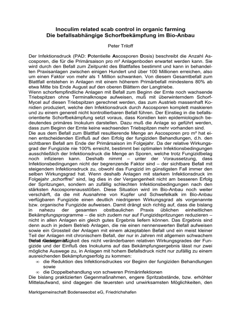 Inoculim related scab control in organic farming Die befallsabhängige Schorfbekämpfung im Bio-Anbau Peter Triloff Der Infektionsdruck (PAD: Potentielle Ascosporen Dosis) beschreibt die Anzahl Ascosporen, die für die Primärsaison pro m² Anlagenboden erwartet werden kann. Sie wird durch den Befall zum Zeitpunkt des Blattfalles bestimmt und kann in behandelten Praxisanlagen zwischen einigen Hundert und über 100 Millionen erreichen, also um einen Faktor von mehr als 1 Million schwanken. Von diesem Gesamtbefall zum Blattfall entstehen in Anlagen mit einem höherem Primärbefall mindestens 80% ab etwa Mitte bis Ende August auf den oberen Blättern der Langtriebe. Wenn schorfempfindliche Anlagen mit Befall zum Beginn der Ernte noch wachsende Triebspitzen ohne Terminalknospe aufweisen, muß mit überwinterndem SchorfMycel auf diesen Triebspitzen gerechnet werden, das zum Austrieb massenhaft Konidien produziert, welche den Infektionsdruck durch Ascosporen komplett maskieren und zu einem generell nicht kontrollierbaren Befall führen. Der Einstieg in die befallsorientierte Schorfbekämpfung setzt voraus, dass Konidien kein epidemiologisch bedeutendes primäres Inokulum darstellen. Dazu muß die Anlage so geführt werden, dass zum Beginn der Ernte keine wachsenden Triebspitzen mehr vorhanden sind. Die aus dem Befall zum Blattfall resultierende Menge an Ascosporen pro m² hat einen entscheidenden Einfluß auf den Erfolg der fungiziden Behandlungen, d.h. den sichtbaren Befall am Ende der Primärsaison im Folgejahr. Da der relative Wirkungsgrad der Fungizide nie 100% erreicht, bestimmt bei optimalen Infektionsbedingungen ausschließlich der Infektionsdruck die Menge an Sporen, welche trotz Fungizidbelag noch infizieren kann. Deshalb nimmt – unter der Voraussetzung, dass Infektionsbedingungen nicht der begrenzende Faktor sind – der sichtbare Befall mit steigendem Infektionsdruck zu, obwohl das Fungizid im günstigsten Fall immer den selben Wirkungsgrad hat. Wenn deshalb Anlagen mit starkem Infektionsdruck im Folgejahr „schorffrei“ sind, lag dies in der Vergangenheit nicht am besseren Erfolg der Spritzungen, sondern an zufällig schlechten Infektionsbedingungen nach den stärksten Ascosporenausstößen. Diese Situation wird im Bio-Anbau noch weiter verschärft, da die mit Ausnahme von Kupfer und Schwefelkalk im Bio-Anbau verfügbaren Fungizide einen deutlich niedrigeren Wirkungsgrad als vorgenannte bzw. organische Fungizide aufweisen. Damit drängt sich richtig auf, dass die bislang in nahezu der gesamten obstbaulichen Praxis üblichen einheitlichen Bekämpfungsprogramme – die sich zudem nur auf Fungizidspritzungen reduzieren – nicht in allen Anlagen ein gleich gutes Ergebnis liefern können. Das Ergebnis sind denn auch in jedem Betrieb Anlagen, die nie einen nennenswerten Befall aufweisen sowie ein Grossteil der Anlagen mit einem akzeptablen Befall und ein meist kleiner Teil der Anlagen mit chronischem Befall, der nur in Jahren mit allgemein schwachem Befall niedriger Diese Gesetzmäßigkeit ist. des nicht veränderbaren relativen Wirkungsgrades der Fungizide und der Einfluß des Inokulums auf das Bekämpfungsergebnis lässt nur zwei mögliche Auswege zu, in Anlagen mit hohem Befallsdruck nicht nur zufällig zu einem ausreichenden Bekämpfungserfolg zu kommen: • die Reduktion des Infektionsdruckes vor Beginn der fungiziden Behandlungen sowie • die Doppelbehandlung von schweren Primärinfektionen Die bislang praktizierten Gegenmaßnahmen, engere Spritzabstände, bzw. erhöhter Mittelaufwand, sind dagegen die teuersten und unwirksamsten Möglichkeiten, den Marktgemeinschaft Bodenseeobst eG, Friedrichshafen Wirkungsgrad der Behandlungen an einen hohen Befallsdruck anzupassen, da nur einzelne schwere Infektionen den größten Teil der Primärinfektionen verursachen und eine Steigerung des Mittelaufwandes den Wirkungsgrad kaum oder gar nicht erhöht, so dass damit ein erhöhter Infektionsdruck überhaupt nicht ausgeglichen werden kann. Für die Reduktion des Infektionsdrucks vor dem Beginn der fungiziden Behandlungen hat sich in mehrjährigen Versuchen das Absaugen des Fallaubes aus den Anlagen bewährt, da damit z.B. der Fruchtschorfbefall im Vergleich zu den reinen fungiziden Behandlungen um etwa 70 - 80% reduziert werden kann. Die Unterschiede im Blattbefall sind zudem im Herbst noch deutlich sichtbar und wirken sich damit noch positiv auf das Folgejahr aus. Diese Maßnahme muß deshalb besonders im BioAnbau mit in der Regel schwächeren Fungiziden, aber auch im konventionellen Anbau, zu einer Standardbehandlung in Anlagen mit hohem Befallsdruck werden. Durch diese Versuche wird auch besonders deutlich, dass der Befallsdruck das sichtbare Ergebnis massiv beeinflusst: sobald der Befallsdruck niedrig wird (= Entfernen der Blätter ) nimmt der Befall bei gleichem Fungizidprogramm stark ab. Da im Bio-Anbau keine kurativen Fungizide verfügbar sind, bleibt für die zweite Spritzung der Doppelbehandlung der schweren Primärinfektionen nur die Möglichkeit, eine zweite vorbeugende Behandlung in das Keimungsfenster zu spritzen. Dieses Keimungsfenster ist der Zeitraum während einer Regenperiode, in der das Verhältnis ausgestoßener Ascosporen zu bereits etablierten Infektionen möglichst hoch ist, d.h. ein Maximum der für diese Regenphase ausstoßbaren Sporen in der Keimungsphase ist, aber erst so wenig Sporen wie möglich infiziert haben. Die zu diesem Zeitpunkt noch nicht durch die vorbeugende Behandlung vor dem Regen abgetöteten Sporen (= Differenz zu 100% Wirkungsgrad der Fungizide) sind bereits diejenigen, die den entsprechenden Befall aus dieser Infektionsperiode verursachen werden. Die zusätzliche Behandlung mit einem vorbeugenden Fungizid in diesem Moment erfasst deshalb mit dessen wirkstoffspezifischem Wirkungsgrad die durch das erste Fungizid hindurchgekommenen und deshalb noch keimenden Sporen und erhöht dadurch den Wirkungsgrad auf die jeweilige Infektionsperiode. Dieses Ze
