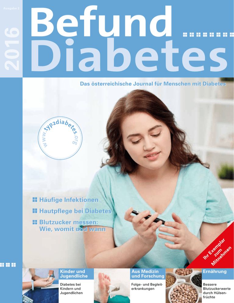 Befund Diabetes Das österreichische Journal für Menschen mit Diabetes s.org te ia p 2d b e www.ty Häufige Infektionen Hautpflege bei Diabetes rE x itn zu em e h m p la r m en Blutzucker messen: Wie, womit und wann M Ih 2016 Ausgabe 2 Kinder und Jugendliche Aus Medizin und Forschung Ernährung Diabetes bei Kindern und Jugendlichen Folge- und Begleit­ erkrankungen Bessere Blutzuckerwerte durch Hülsen­ früchte Befund Inhalt Diabetes Aus Medizin und Forschung 4 Folge- und Begleiterkrankungen 7 Diabetes und dessen Auswirkungen auf die Psyche 10 Häufige Infektionen Kinder und Jugendliche 14 Diabetes bei Kindern und Jugendlichen 16 Schulen überfordert: Immer mehr Kinder mit Diabetes us der Selbsthilfe und A den Fachgesellschaften 17 Weltdiabetestag am 14. November 18 Österreichische Diabetes Gesellschaft lädt zur 44. Jahrestagung 18 Neues Netzwerk für Menschen mit Diabetes Ausgabe 2/2016 Ernährung 28 Bessere Blutzuckerwerte durch Hülsenfrüchte 29 So ernähren sich Menschen mit Diabetes richtig 32 Menschen mit Typ-2-Diabetes können von zwei großen Mahlzeiten profitieren Service 33 Veranstaltungen 34 Online-Ratgeber zu Diabetes 34 Weitere wichtige Adressen 35 Befund Diabetes mitgestalten/Impressum/ Wissenschaftlicher Beirat 2 Bestellformular: Befund Diabetes kostenfrei für Ordination/Spital/Selbsthilfegruppe Seite 10 Leben mit Diabetes Foto: Subbotina Anna – Shutterstock.de 19 Bewegung bei Diabetes Typ 2 20 Experteninterview: Hautpflege bei Diabetes 22 Blutzucker messen: Wie, womit und wann 25 Richtige Mund- und Zahnpflege 26 Vor- und Nachteile der Insulinpumpe Häufige Infektionen Befund Diabetes 2/2016 3 Aus Medizin und Forschung Folge- und Begleiterkrankungen Diabetes führt oft zu Folge- und Begleiterkrankungen wie Niereninsuffizienz, Nervenschädigungen oder dem diabetischen Fußsyndrom. Nieren- und Netzhautschäden Ein häufiges Leiden bei Betroffenen ist eine Niereninsuffizienz, die sog. diabetische Nephropathie. Sie gilt als häufigste Ursache für Nierenversagen. Denn Aufgabe der Niere ist es, Schad- und Abfallstoffe aus dem Blut zu filtern. Sind aber Blutgefäße in den Nieren geschädigt, funktionieren diese nicht mehr korrekt und können Gifte nicht mehr aus dem Körper filtern. Sollte es soweit kommen, dass beide Nieren nicht mehr funktionieren, muss das Blut von Betroffenen künstlich mittels Dialyse gereinigt werden. Ein frühes Zeichen für eine beginnende Niereninsuffizienz ist der Nachweis von Eiweiß im Urin. Eine rechtzeitige Therapie durch korrekt eingestellten Blutdruck und Blutzucker sowie einer Medikation z. B. mit ACE-Hemmern kann das Fortschreiten der diabetischen Nephropathie verhindern. Geschädigte Blutgefäße kön4 Befund Diabetes 2/2016 Foto: memorisz – Shutterstock.com D iabetes schädigt oft kleine und große Arterien, auch Mikro- bzw. Makroangiopathie bezeichnet, und häufig auch Nerven. Zu den häufigsten Folgeund Begleiterkrankungen zählt z. B. eine Verkalkung der Arterien (Arteriosklerose), die durch zu hohe Zuckerwerte gefördert wird. Sind die Herzkranzgefäße betroffen, so wird dies als koronare Herzerkrankung bezeichnet, die sich in Brustschmerzen und Engegefühl in der Brust bemerkbar macht – bei Frauen auch häufig durch Rückenoder Kieferschmerzen. Allerdings fühlen Menschen mit Diabetes diese Hinweise aufgrund von Nervenschäden häufig nicht. Verschließen sich Herzkranzgefäße, wird der entsprechende Teil des Herzmuskels nicht mehr mit Blut versorgt und stirbt ab. Die Folge ist eine Herzleistungsschwäche oder ein Herzinfarkt, der bei Menschen mit Diabetes zu den häufigsten Todesursachen zählt. Zu hoher Blutdruck, besonders wenn er mit Bewegungsmangel und Übergewicht einhergeht, ist ebenso ein Risikofaktor für einen Herzinfarkt. Wesentlich für Betroffene sind daher regelmäßige EKG-Kontrollen, um auch sog. stumme Infarkte zu entdeckten und zu behandeln. nen bei Menschen mit Diabetes auch in der Netzhaut auftreten. Grund dafür ist ein erhöhter Blutzuckerspiegel. Es kann dadurch zu Einblutungen sowie Ablagerungen von Proteinen und Fetten in den Augen kommen. Studien belegen, dass rund 85 % der Betroffenen, die bereits 25 Jahre oder länger an Diabetes erkrankt sind, Schäden an den Augen erleiden. Zudem ist die Sehkraft von Betroffenen häufig eingeschränkt. Diabetisches Fußsyndrom und Nervenschäden Wenn es in den Füßen kribbelt, brennt oder sich ein Taubheitsgefühl breit macht, dann handelt es sich meist um erste Anzeichen eines Nervenschadens, auch als diabetische Neuropathie bezeichnet. Diese Folgeerkrankung kann alle Nerven treffen, wenn auch die sensiblen besonders gefährdet sind. Denn sie leiten Schmerz- und Temperaturempfindungen weiter. Bei fortgeschrittener Erkrankung leiden Betroffene häufig unter großen Schmerzen. Ebenso werden bei diabetischer Neuropathie häufig die autonomen Nerven geschädigt, die die inneren Organe versorgen. Dies kann zu Störungen der Magen- und/oder Blasenentleerung, Durchfall oder Potenzproblemen führen. Nervenschäden sind auch Grund für das diabetische Fußsyndrom. Denn durch die gestörte Wahrnehmung von Schmerzen bemerken Betroffene Verletzungen oft nicht rechtzeitig. Dadurch können sich Wunden entzünden und zudem schlecht abheilen. Es bil- Aus Medizin und Forschung Häufige Infektionen Menschen mit Diabetes leiden öfter an Infektionen als Menschen ohne Diabetes. Zudem erholen sich Betroffene schwerer von den häufig auftretenden Pilz- und Harnwegs- sowie Influenzainfektionen. D Überschüssiger Zucker im Blut bindet z. B. Antikörper, die dafür sorgen, Keime zu erkennen und zu binden. Auch die Zellen des Abwehrsystems werden durch einen hohen Blutzucker beeinträchtigt. So werden etwa die speziellen Zellen zur Abwehr, die sog. Granulozyten, geschwächt. Die Folge ist, dass Betroffene öfter unter Infektionen leiden und sich auch schwerer erholen. Häufig leiden sie daher unter Pilz- und Harnwegsinfektionen sowie Gehörgangsentzündungen, aber auch Influenzavir